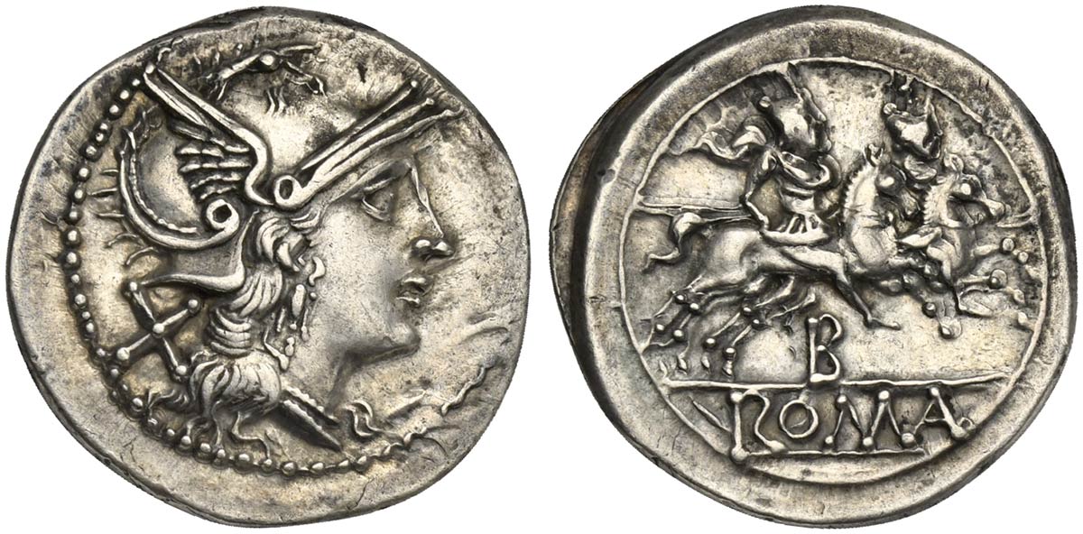 B series, Denarius, Etruria (?), ca. 211-208 BC; AR (g 4,27; mm 20; h 10); Helmeted head of Roma r.; behind, X, Rv. Dioscuri galloping r.; below, B; in ex. ROMA. Crawford 104/1a; Sydenham 204.
