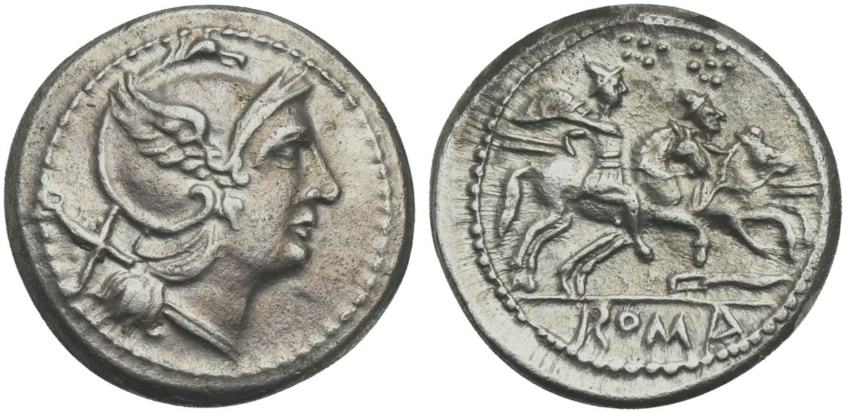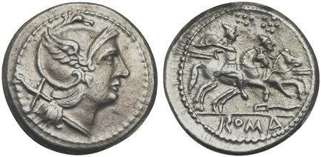 Knife (first) series, Denarius, Central Italy (?), ca. 211-208 BC; AR (g 4,34; mm 19; h 12); Helmeted head of Roma r.; behind, X, Rv. Dioscuri galloping r.; below, knife; in ex. ROMA. Crawford 109/1; Sydenham 165.