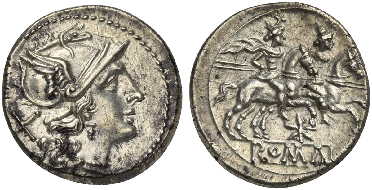 Star (first) series, Denarius, Rome, ca. 206-195 BC; AR (g 4,22; mm 18; h 1); Helmeted head of Roma r.; behind, X, Rv. Dioscuri galloping r.; below, seven-rayed star; in ex. ROMA. Crawford 113/1; Sydenham 263.