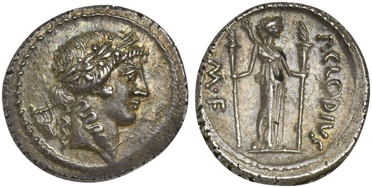 The Caesarians - P. Clodius M.f., Denarius, Rome, 42 BC; AR (g 3,74; mm 19; h 5); Laureate head of Apollo r.; behind, lyre, Rv. Diana standing r., with bow and quiver over shoulder, holding two lighted torches; on r., P CLODIVS; on l., M F. Crawford 494/23; Clodia 15; Sydenham 1117.