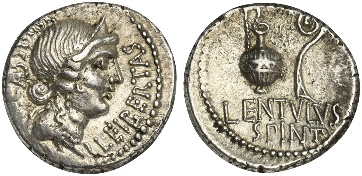 C. Cassius Longinus and P. Cornelius Lentulus Spinther, Denarius, Military mint travelling with Brutus (Smyrna?), spring 42 BC; AR (g 4,02; mm 18; h 8); Diademed bust of Libertas r.; before, LEIBERTAS; behind, C CASSI IMP, Rv. Jug and lituus; below, LENTVLVS / SPINT. Crawford 500/3; Cassia 16, Cornelia 75; Sydenham 1307.