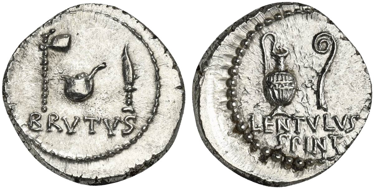 M. Junius Brutus and P. Cornelius Lentulus Spinther, Denarius, Military mint travelling with Brutus (Smyrna?), early 42 BC; AR (g 3,86; mm 19; h 12); Axe, culullus and knife; below, BRVTVS, Rv. Jug and lituus; below, LENTVLVS / SPINT. Crawford 500/7; Junia 41, Cornelia 71; Sydenham 1310.