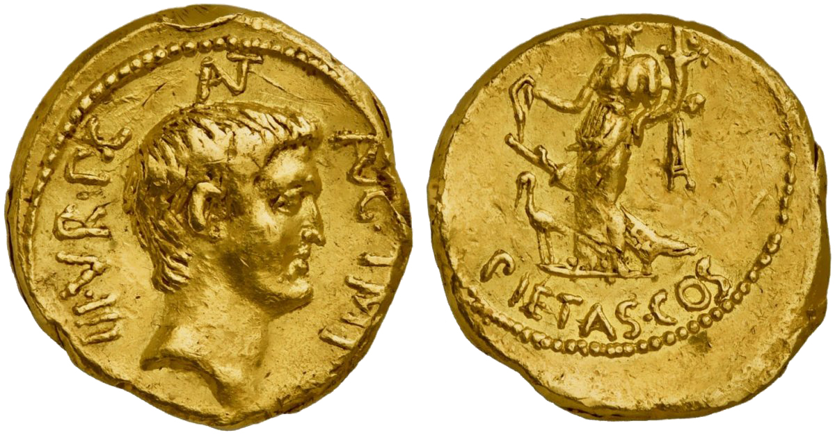 M. Antonius, Aureus, mint moving with Antonius, 41 BC; AV (g 7,97; mm 21; h 2); ANT AVG IMP III V R P C, head of Antonius r., Rv. Pietas standing l., holding rudder and cornucopiae; at feet, stork; below, PIETAS COS. Crawford 516/1; Antonia 43; Sydenham 1173.