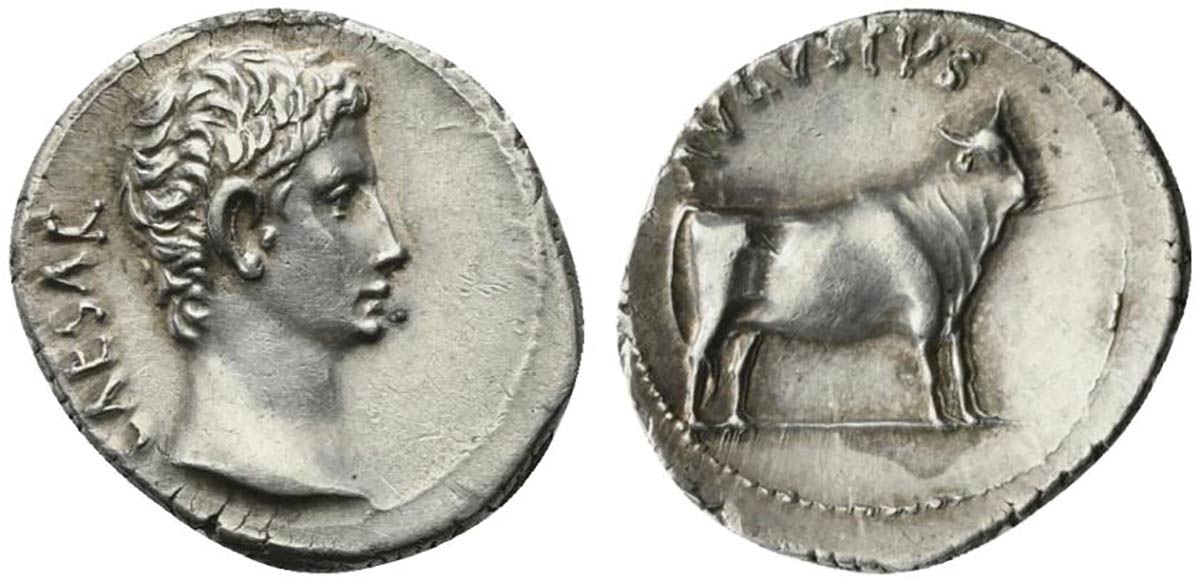 Augustus (27 BC - AD 14), Denarius, Pergamum or Samos, 27 BC; AR (g 3,44; mm 20; h 12); CAESAR, bare head r., Rv. AVGVSTVS, young bull standing r. RIC 475; C 28.