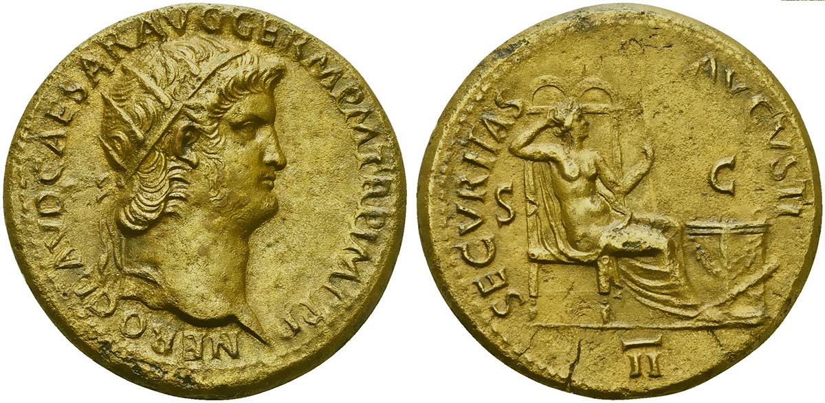 Nero (54-68), Dupondius, Rome, AD 64; AE (g 13,85; mm 28; h 6); NERO CLAVD CAESAR AVG GERM P M TR P IMP P P, radiate head r., Rv. SECVRITAS - AVGVSTI, Securitas seated r., holding sceptre; on r., altar, against which leans torch resting on bucranium; in ex. II. RIC 191; C 326.