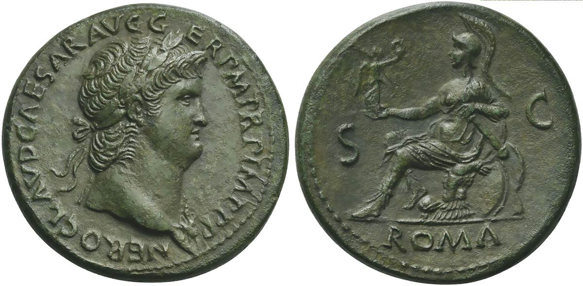Nero (54-68), Sestertius, Rome, AD 65; AE (g 26,51; mm 35; h 7); NERO CLAVD CAESAR AVG G - ER P M TR P IMP P P, laureate head r., wearing aegis, Rv. Roma seated l. on cuirass., holding Victory and parazonium; in field, S - C; in ex. ROMA. RIC 273; C 261 var (bust).