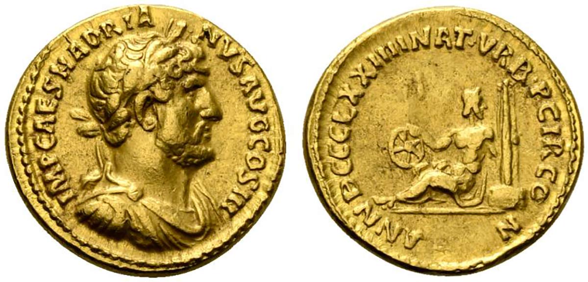 Hadrian (117-138), Aureus, Rome, AD 121; AV (g 7,21; mm 19; 6); IMP CAES HADRIA – NVS AVG COS III, laureate, draped and cuirassed bust r., Rv. ANN ÐCCCLXXIIII NAT VRB P CIR CO – N, Genius of the Circus reclining l., head r., balancing wheel on knee and placing arm around one of the turning posts of the Circus (three obelisks on a base). RIC 144; C 162; Calicó 1200.