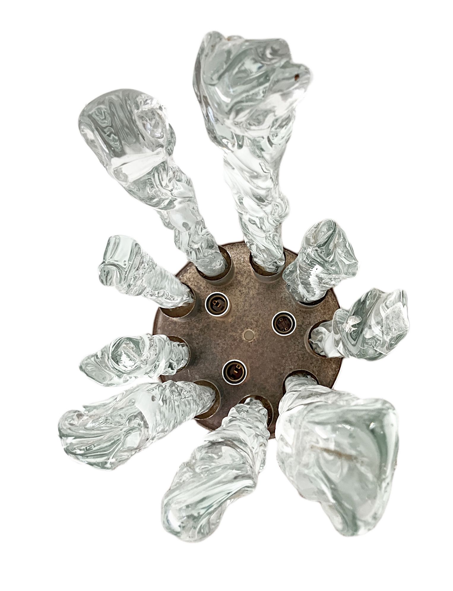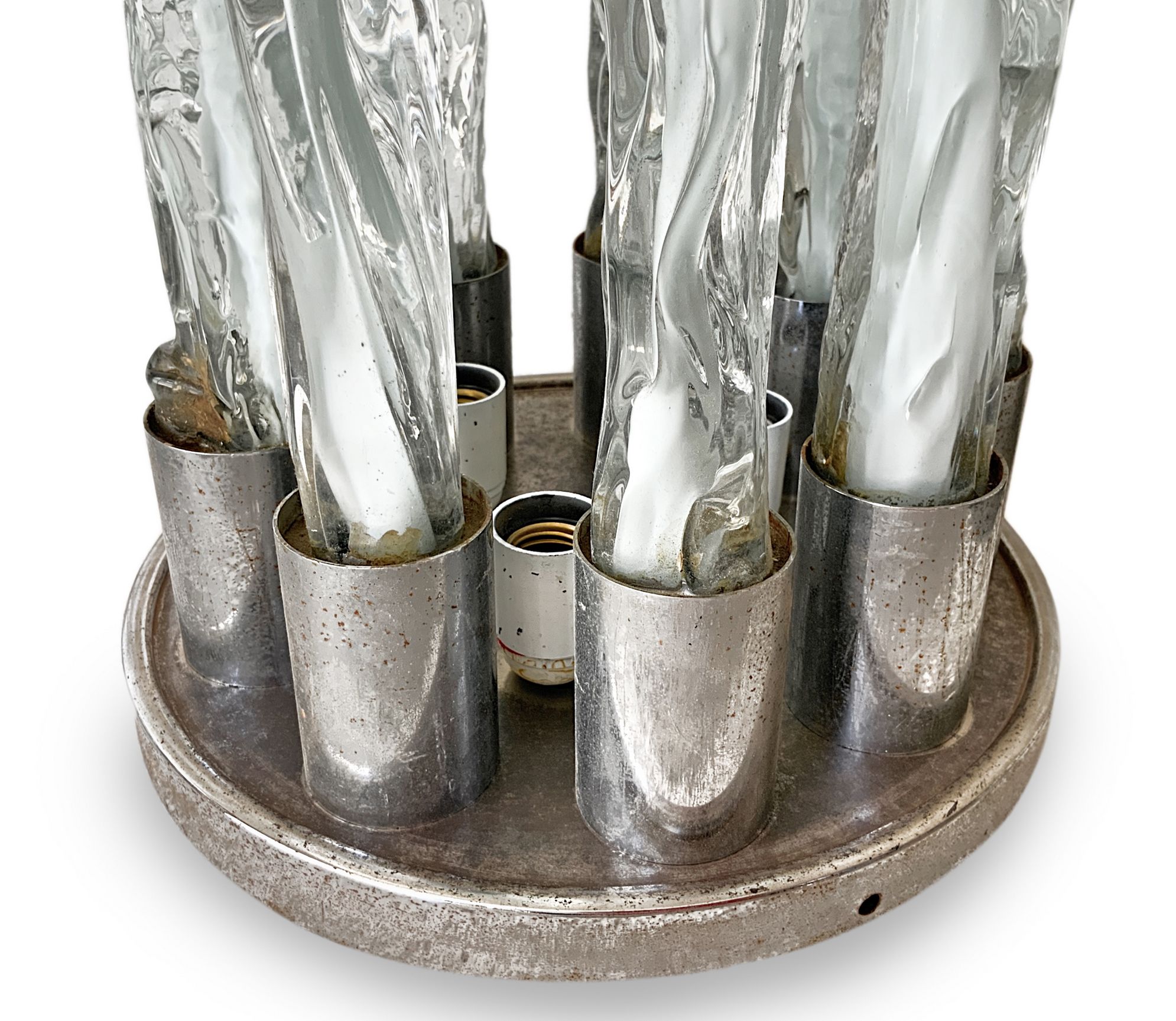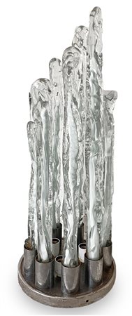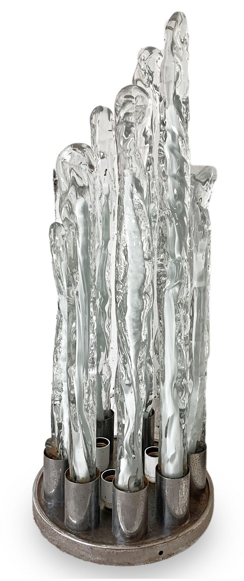 Sothis, modello Excalibur, disegno E. Poli, Gino Fantasia. Lampada da terra in vetro trasparente con inclusioni di pasta vitrea nei toni dell'azzurro, base in metallo cromato rielettrificata. Anni 60. Cm 81 x35 diametro.