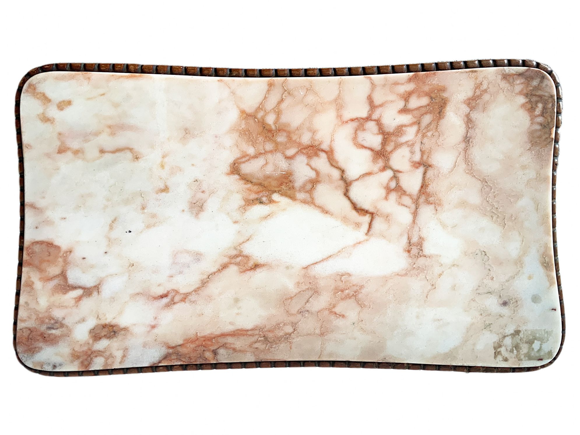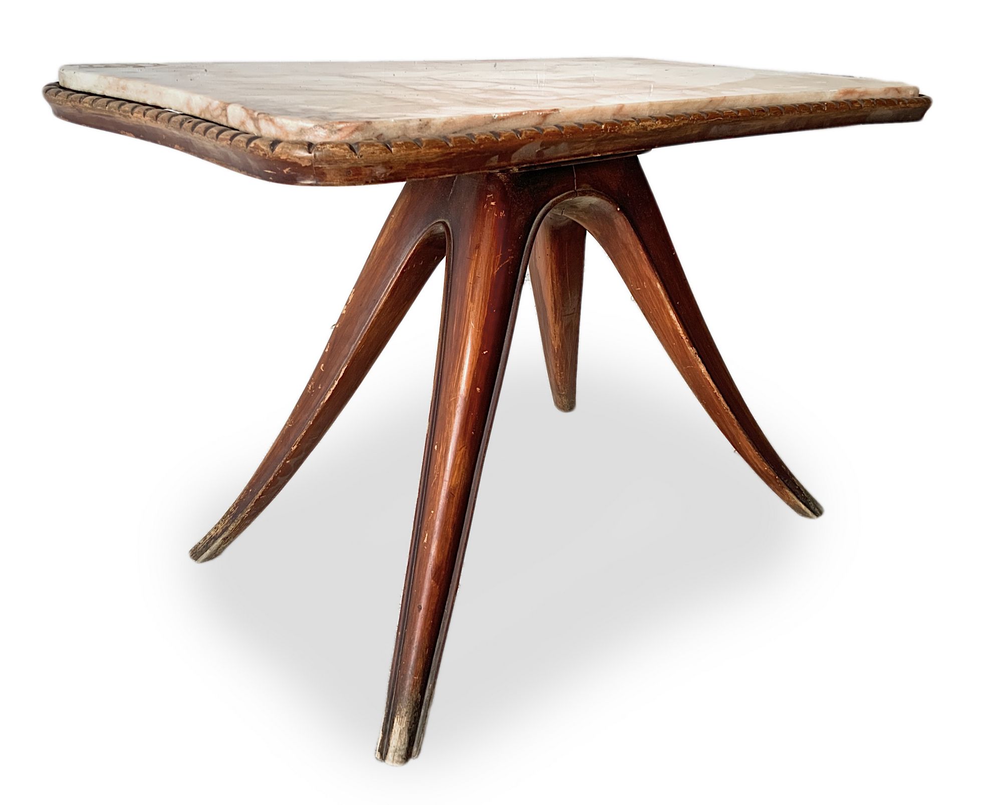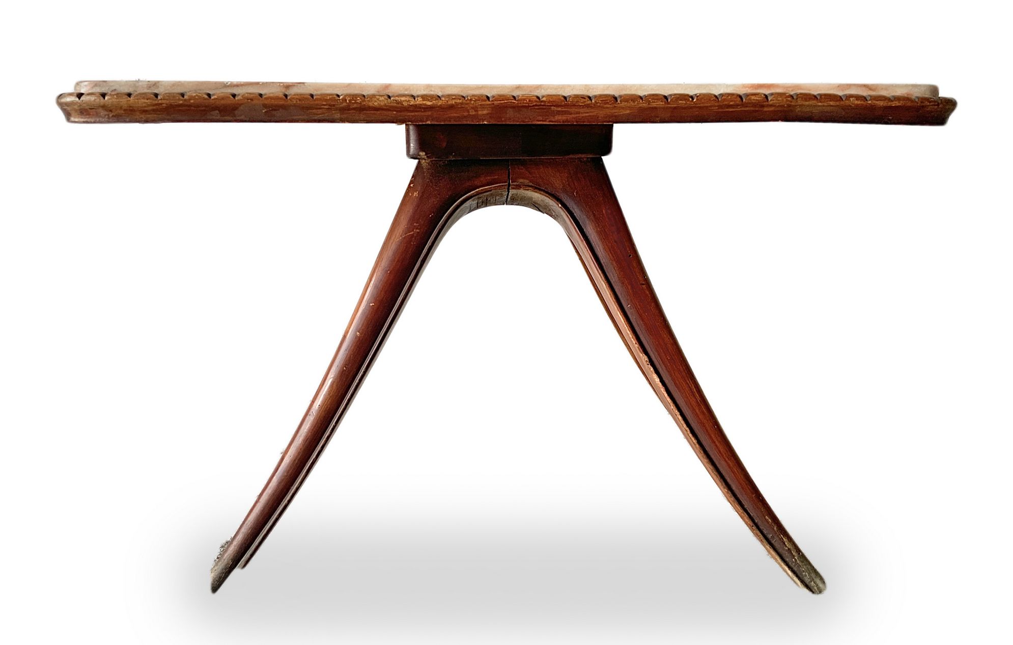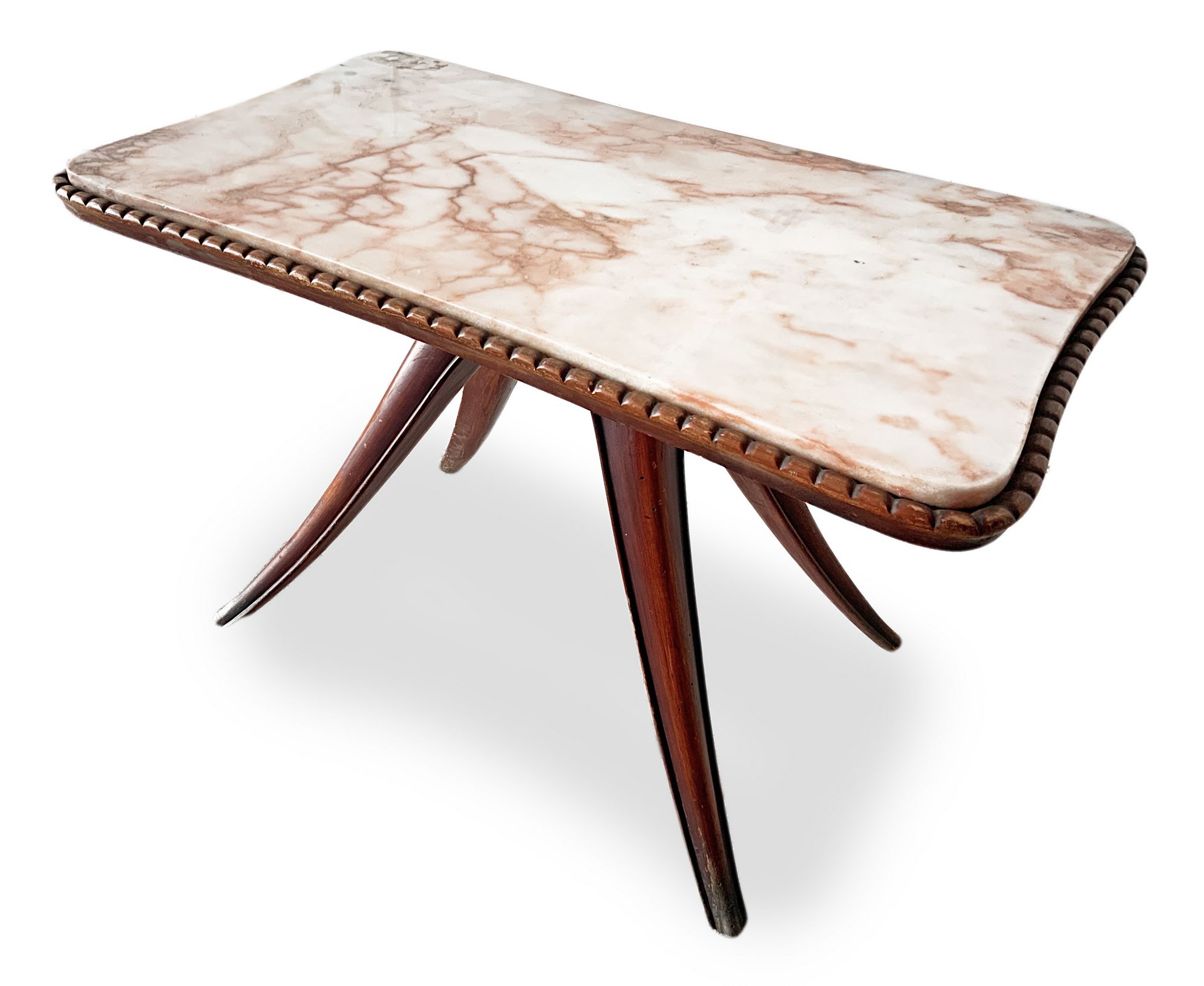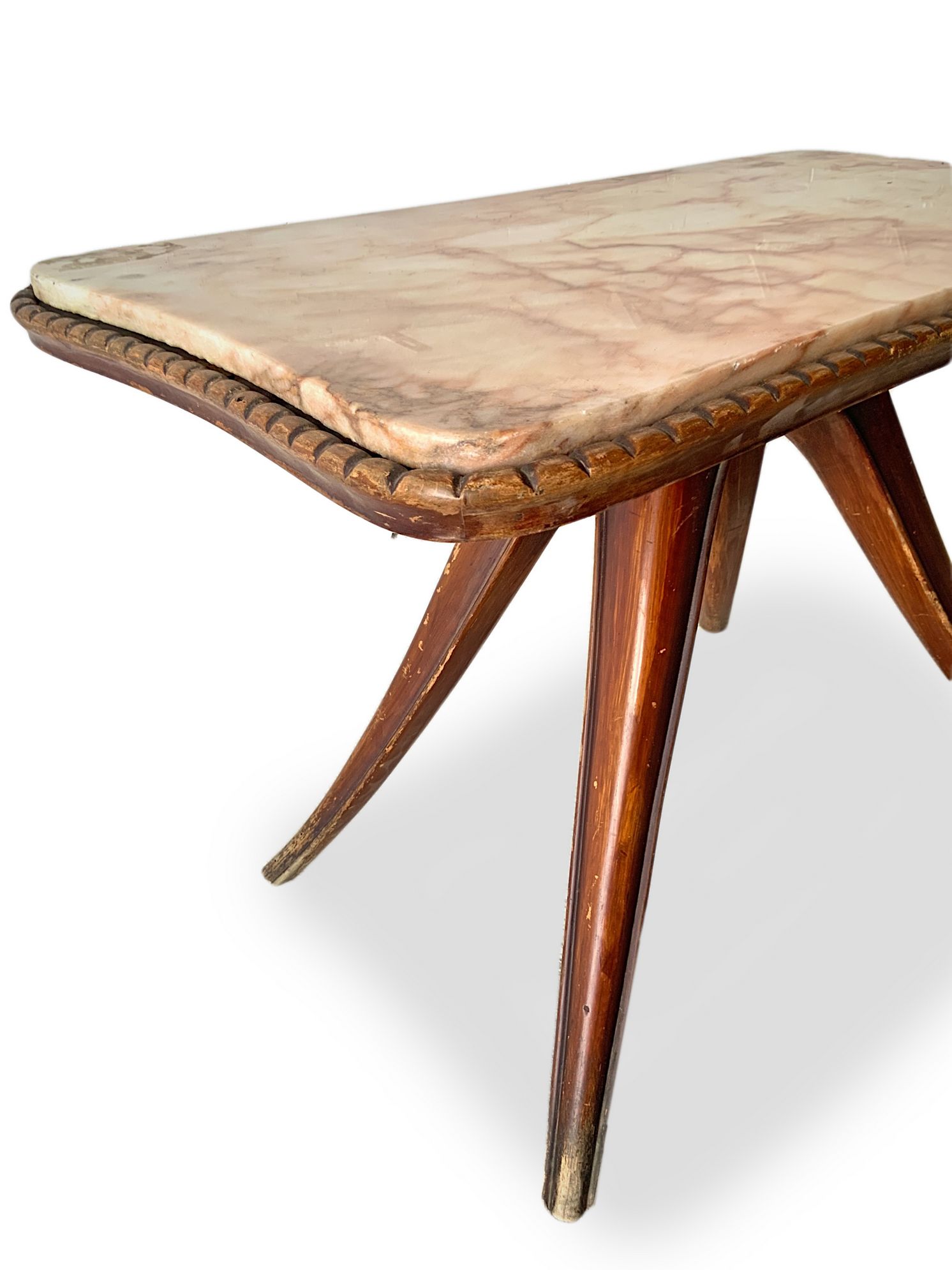 Tavolino in legno piano in marmo rosa nello stile di Atelier Borsani. Anni 40. Cm 46x72x42. Segni di uso, presenza di tarlo.