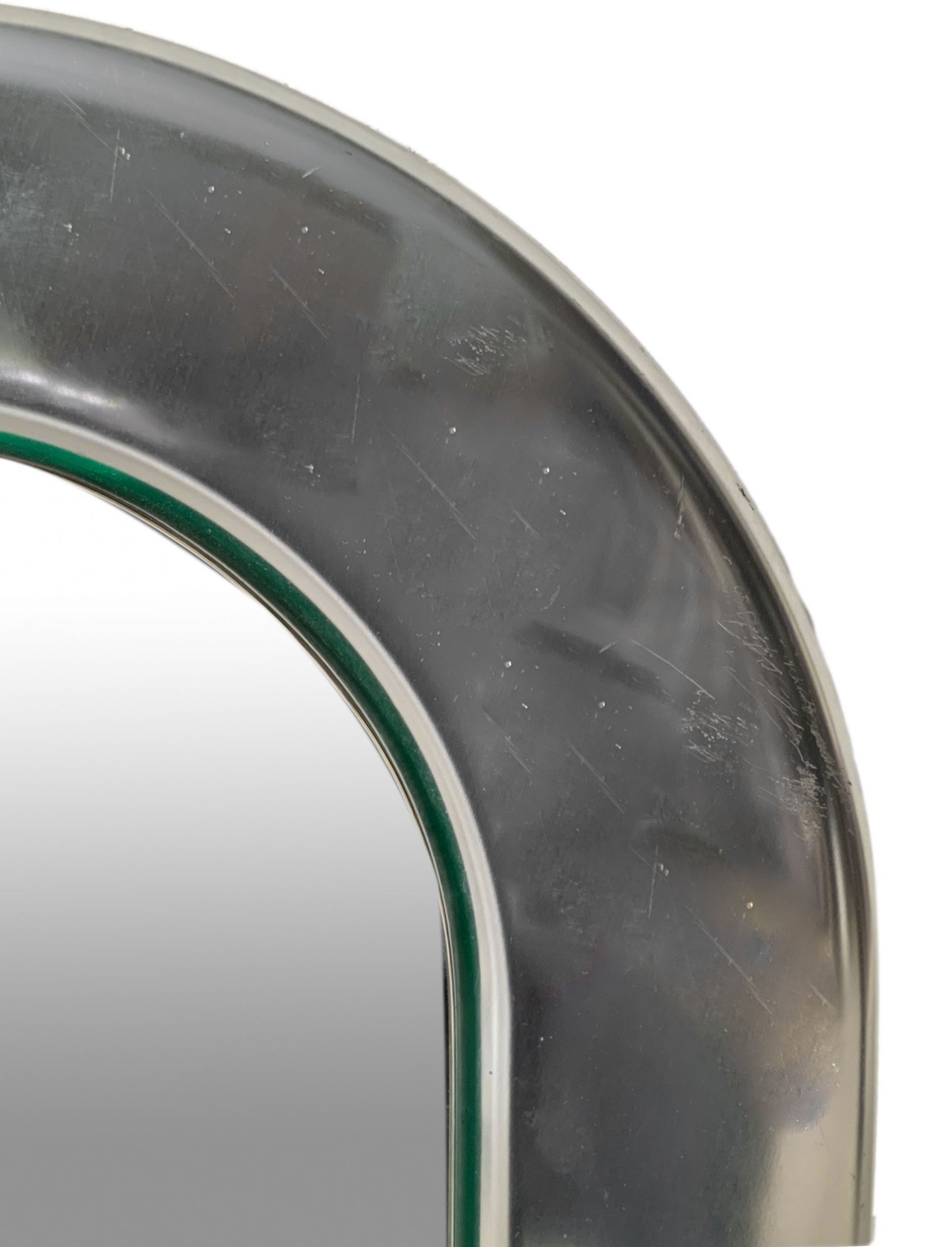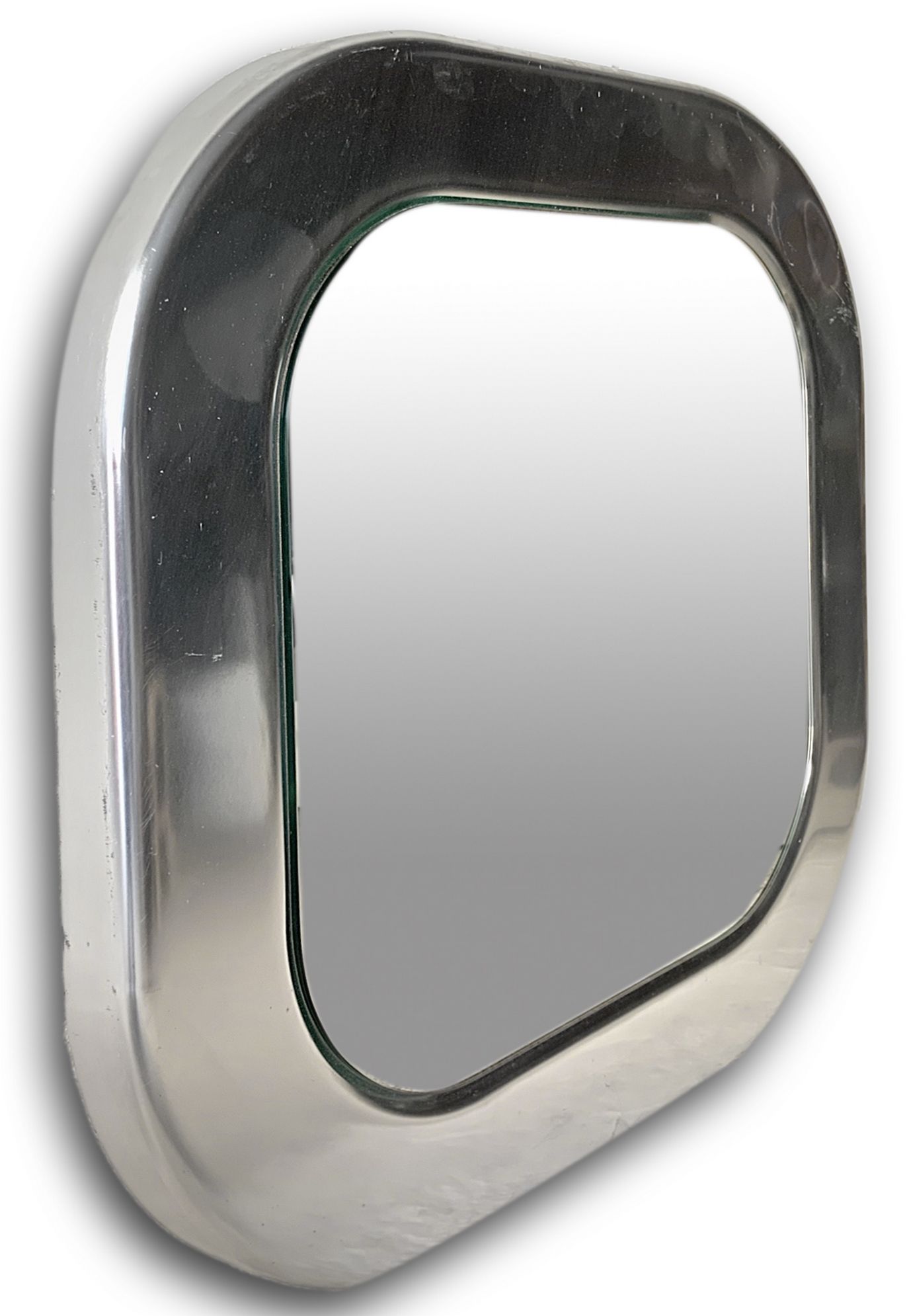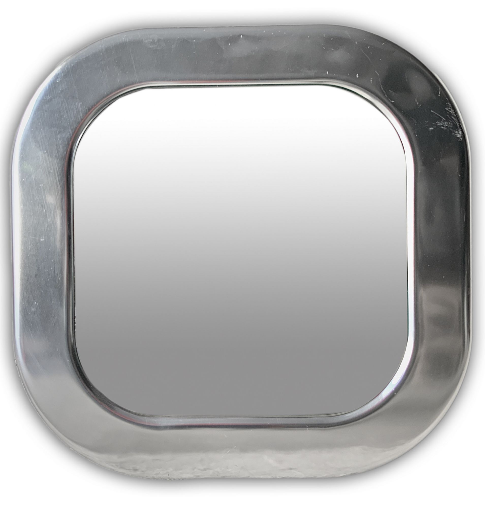 Produzione italiana. Specchiera di forma quadrata con angoli stondati struttura in alluminio spazzolato. Anni '60. Cm 61x61x5. Segni di uso.