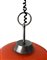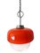 Lampada a sospensione in vetro, Vistosi, attribuibile ad Ettore SottSass. Composta da due corpi: uno in vetro iridescente, uno sovraddiffusore in vetro incamiciato colore arancione. Anni 60. Cm 45 x38d