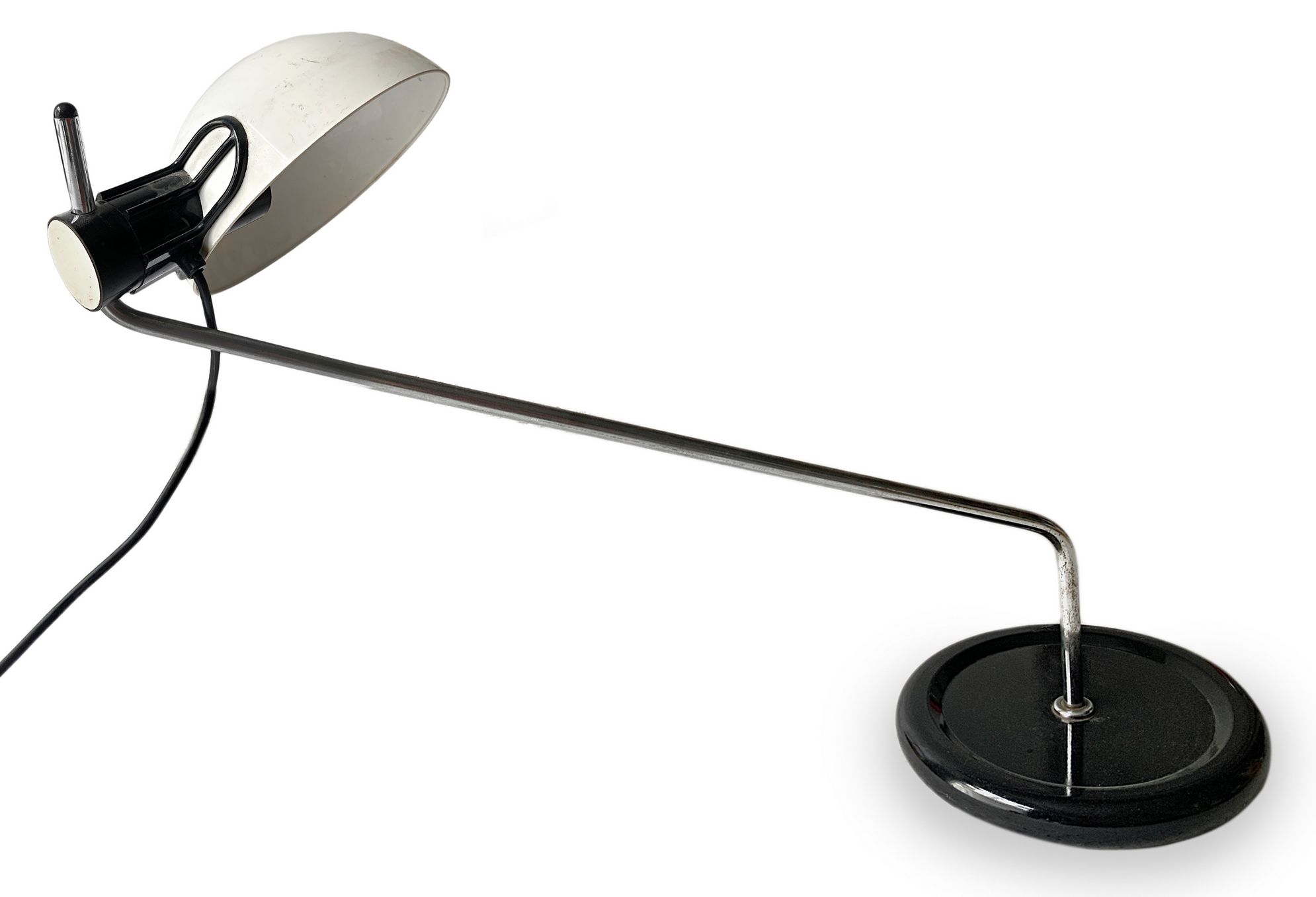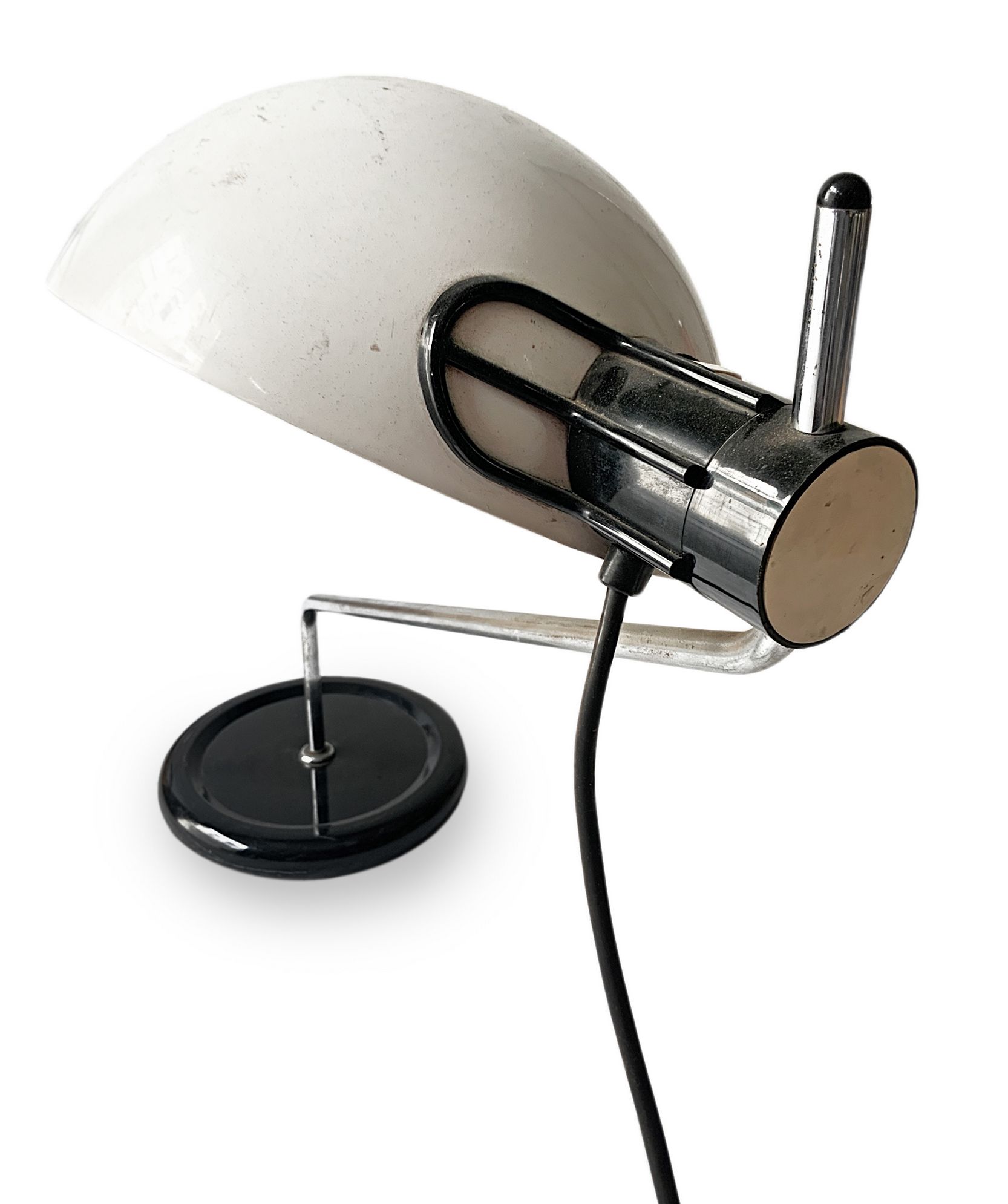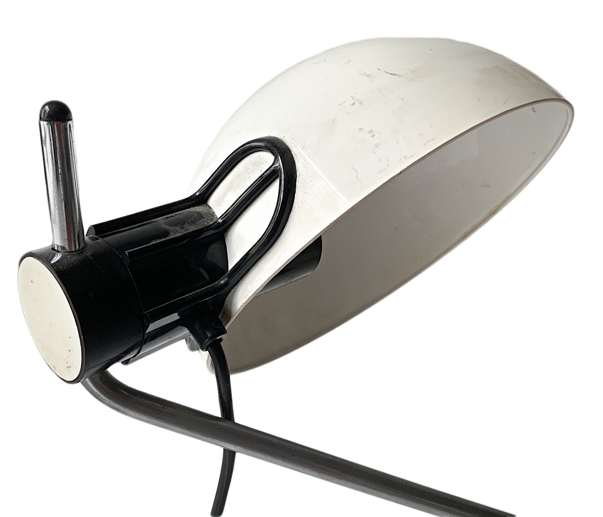 Guzzini, lampada da tavolo modello Libellula, struttura in metallo laccato, base in ghisa laccata nera, diffusore in plastica colore bianco segni di uso. Anni 60. Cm 55x 60x32