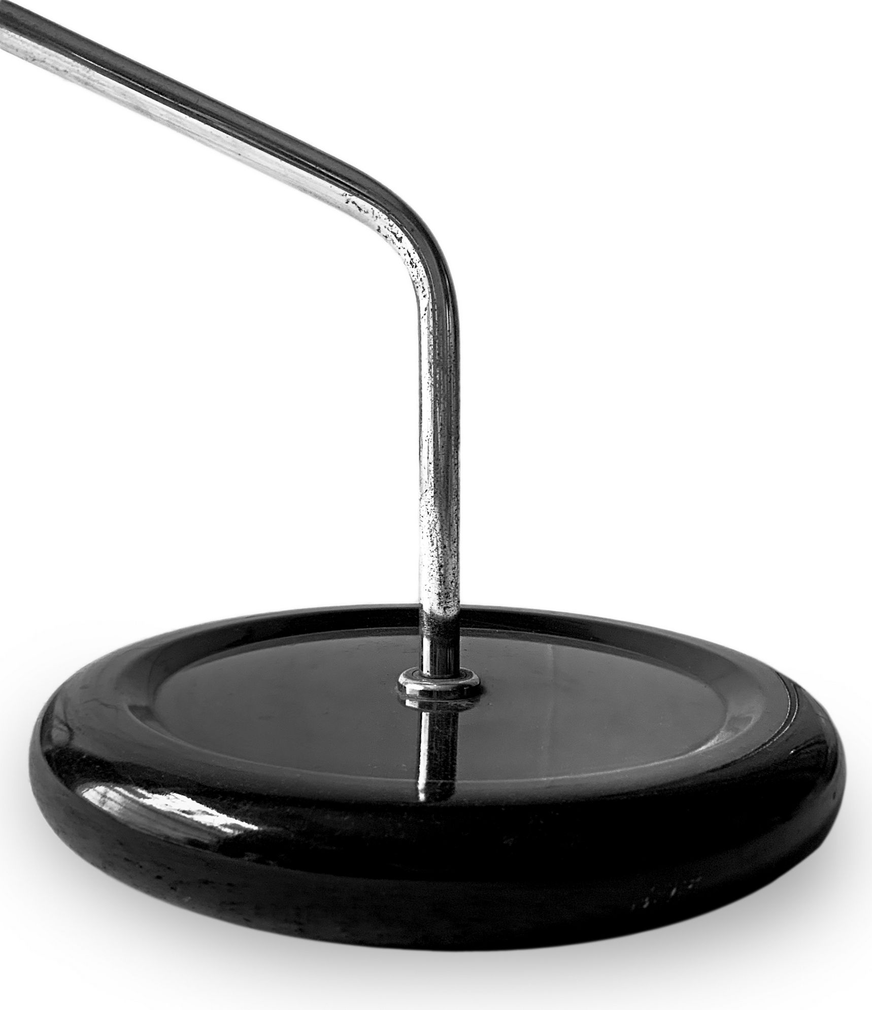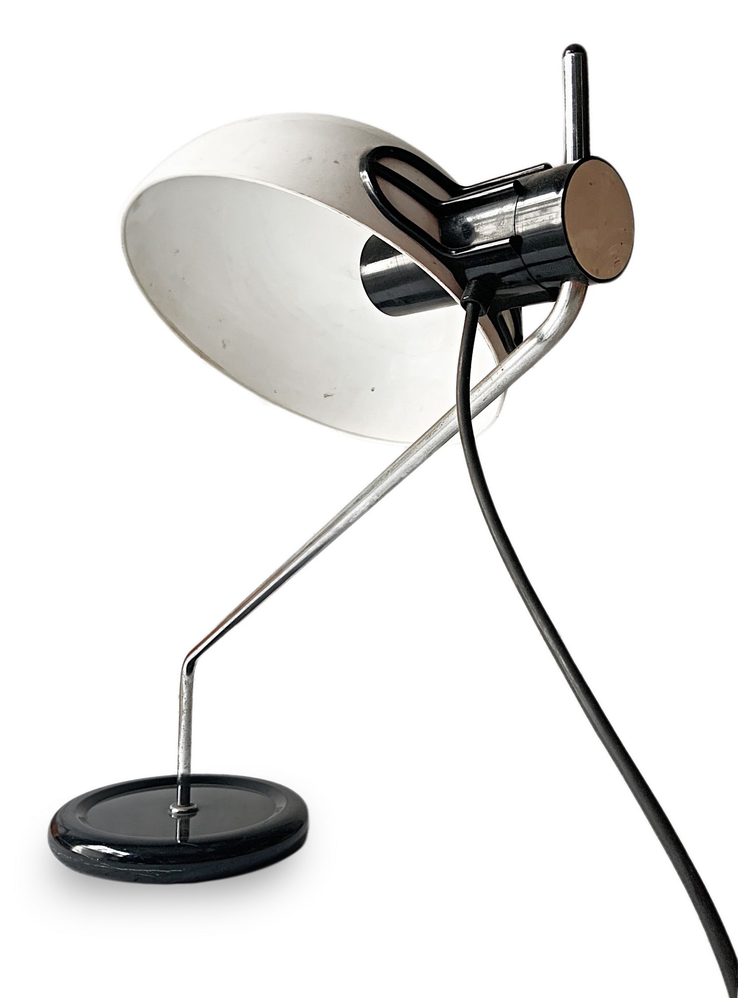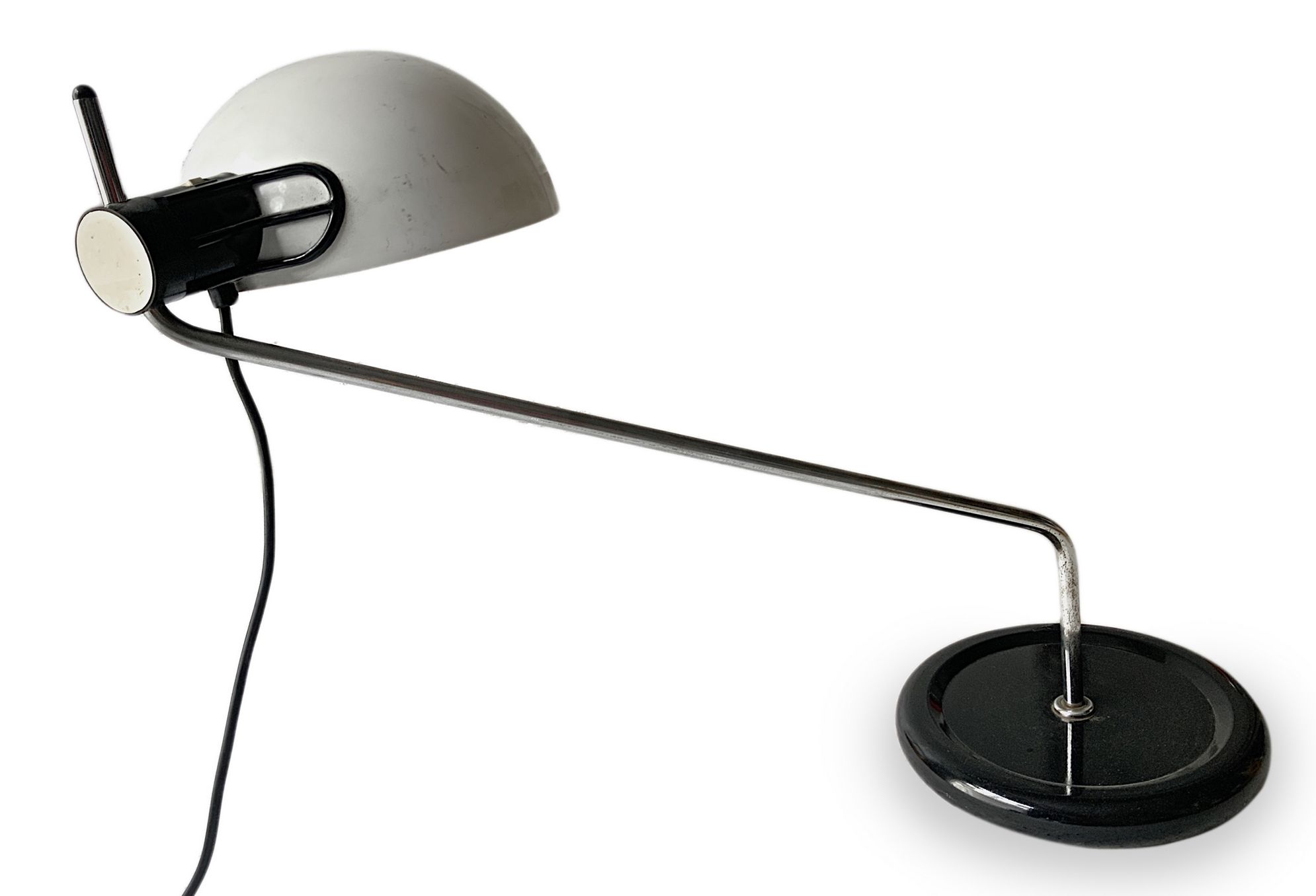 Guzzini, lampada da tavolo modello Libellula, struttura in metallo laccato, base in ghisa laccata nera, diffusore in plastica colore bianco segni di uso. Anni 60. Cm 55x 60x32