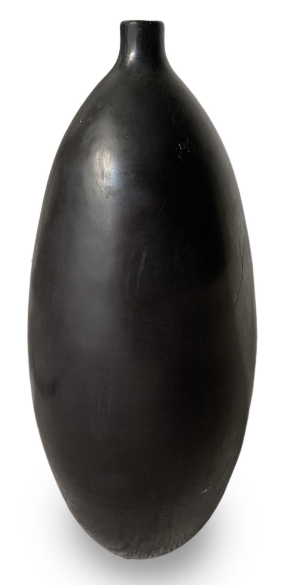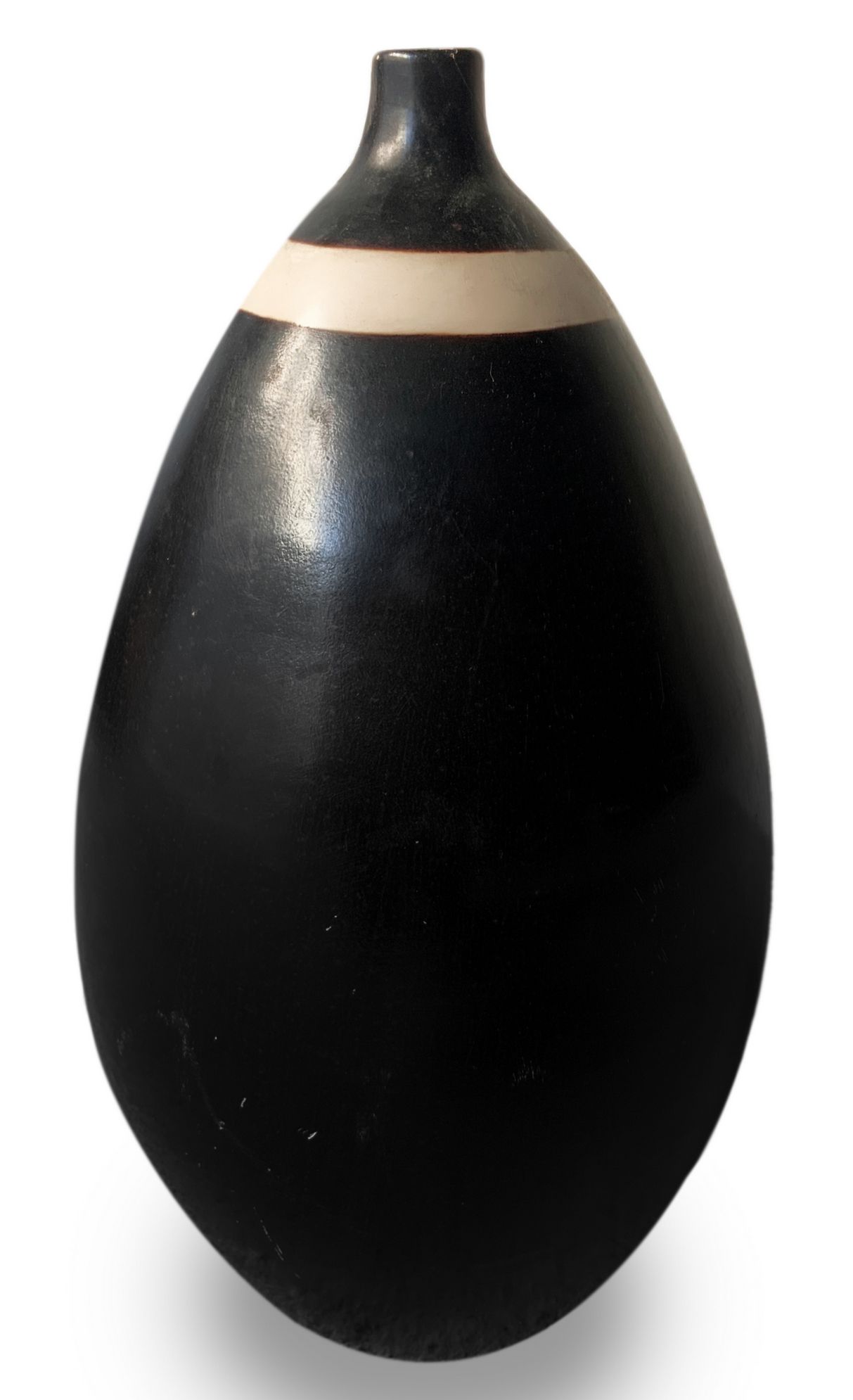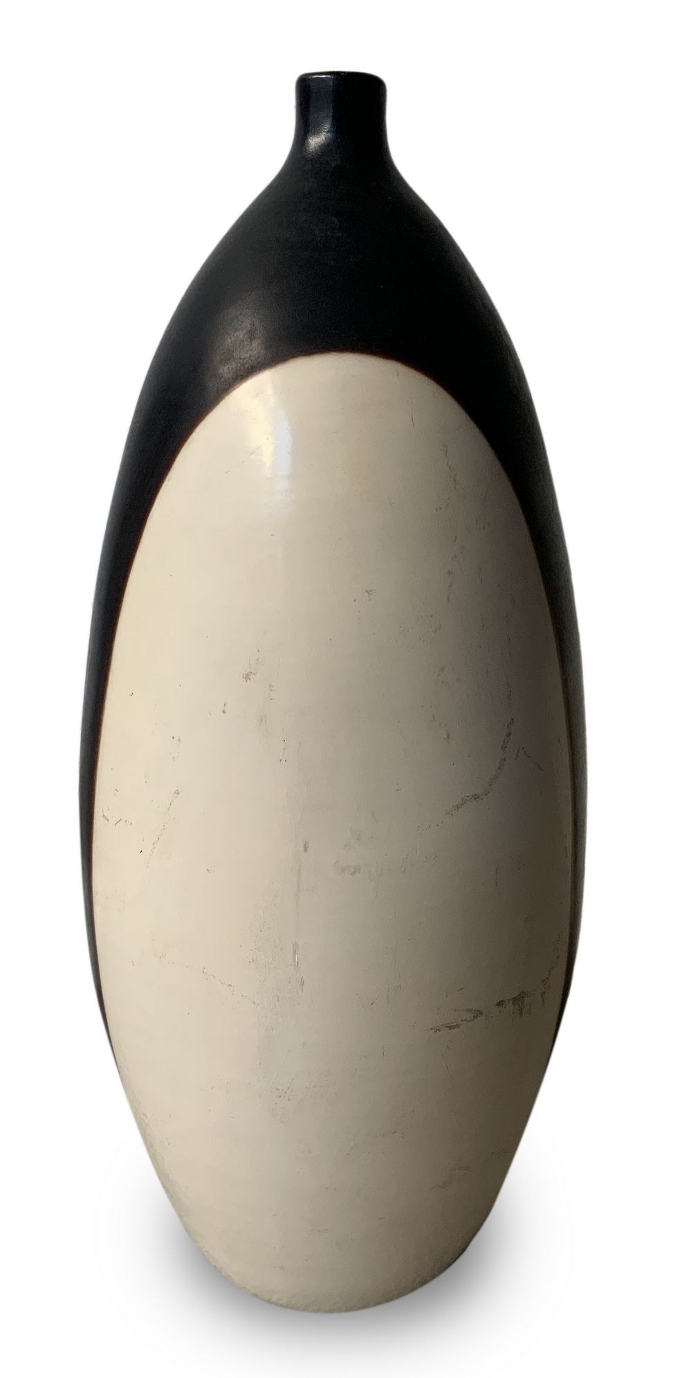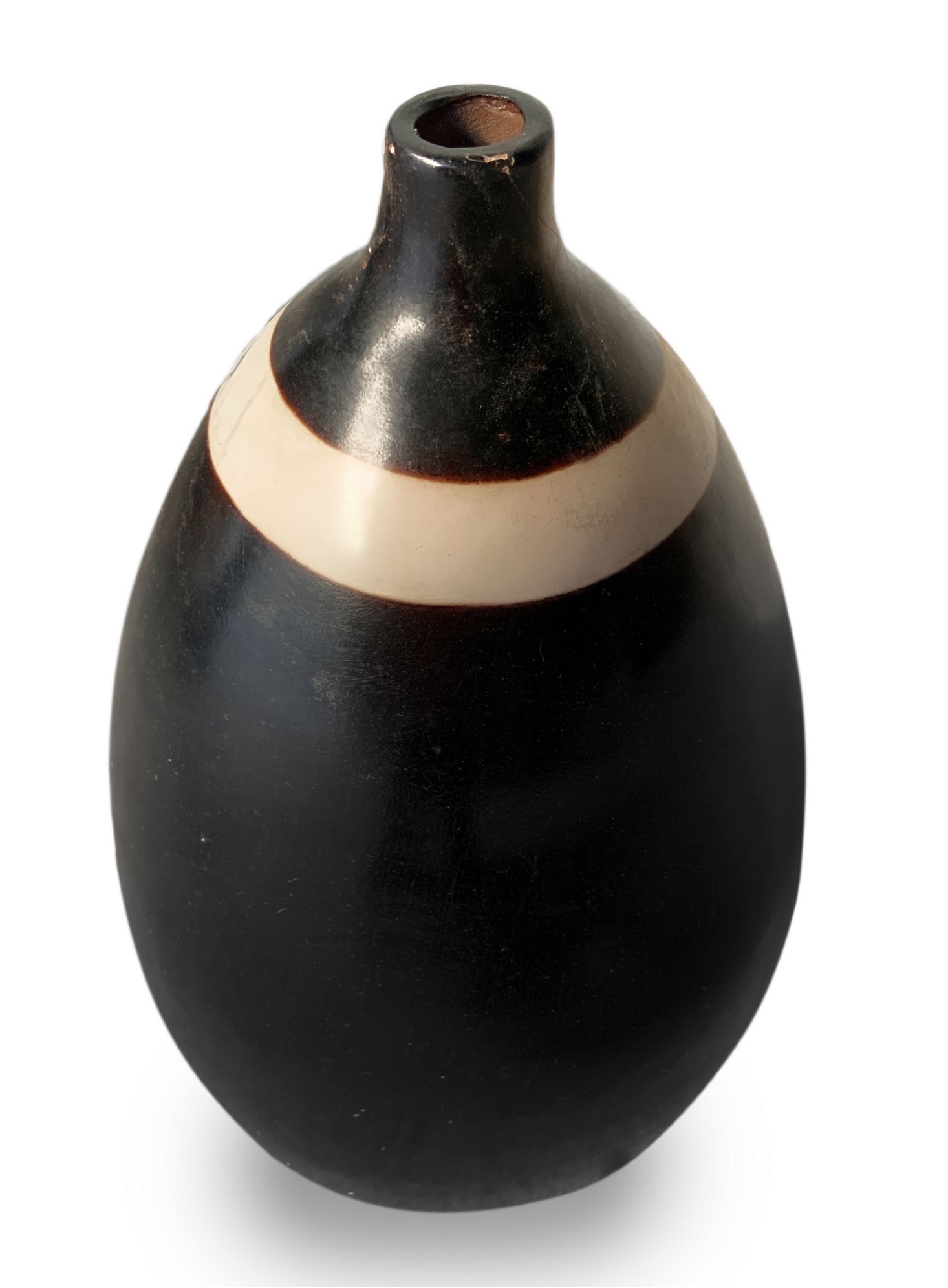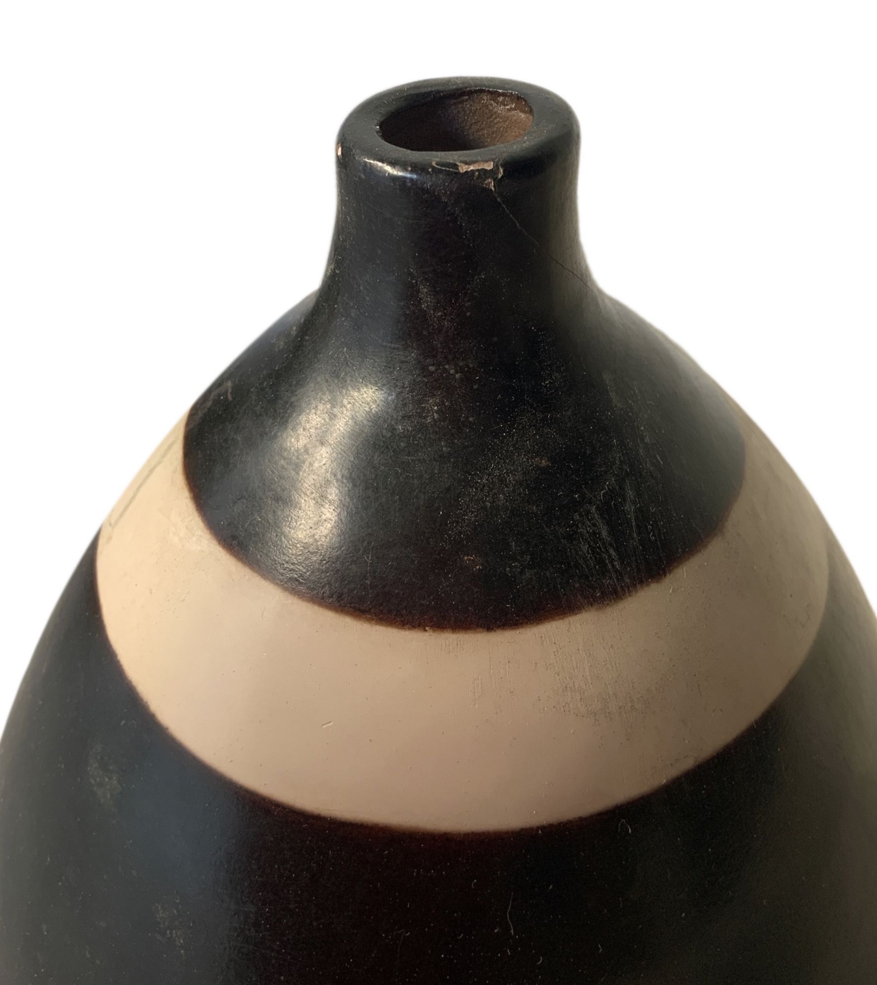 Vaso in ceramica di forma globulare nei toni del marrone e del bianco, produzione italiana. Anni 60. Cm 24. Segni di uso.