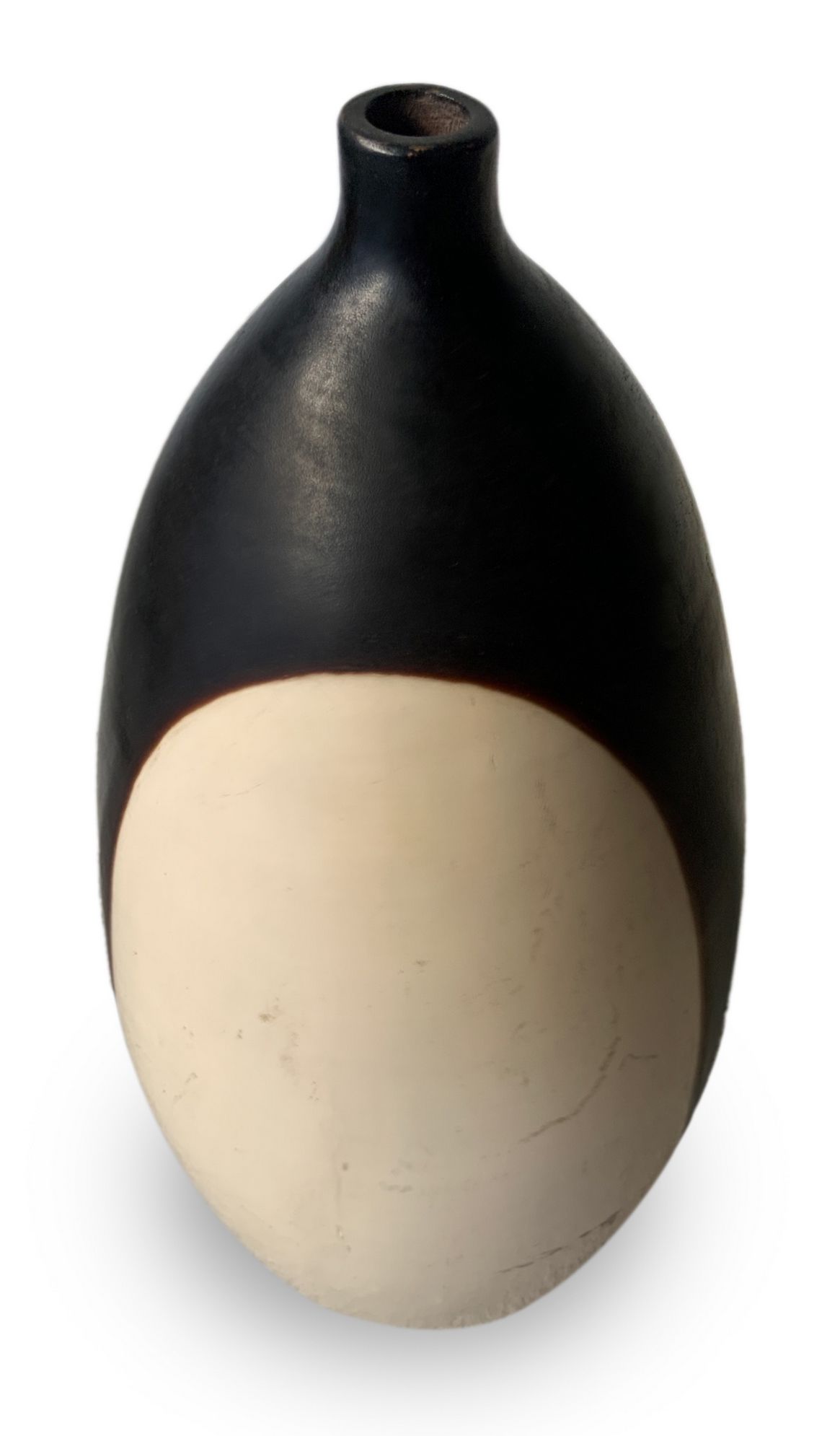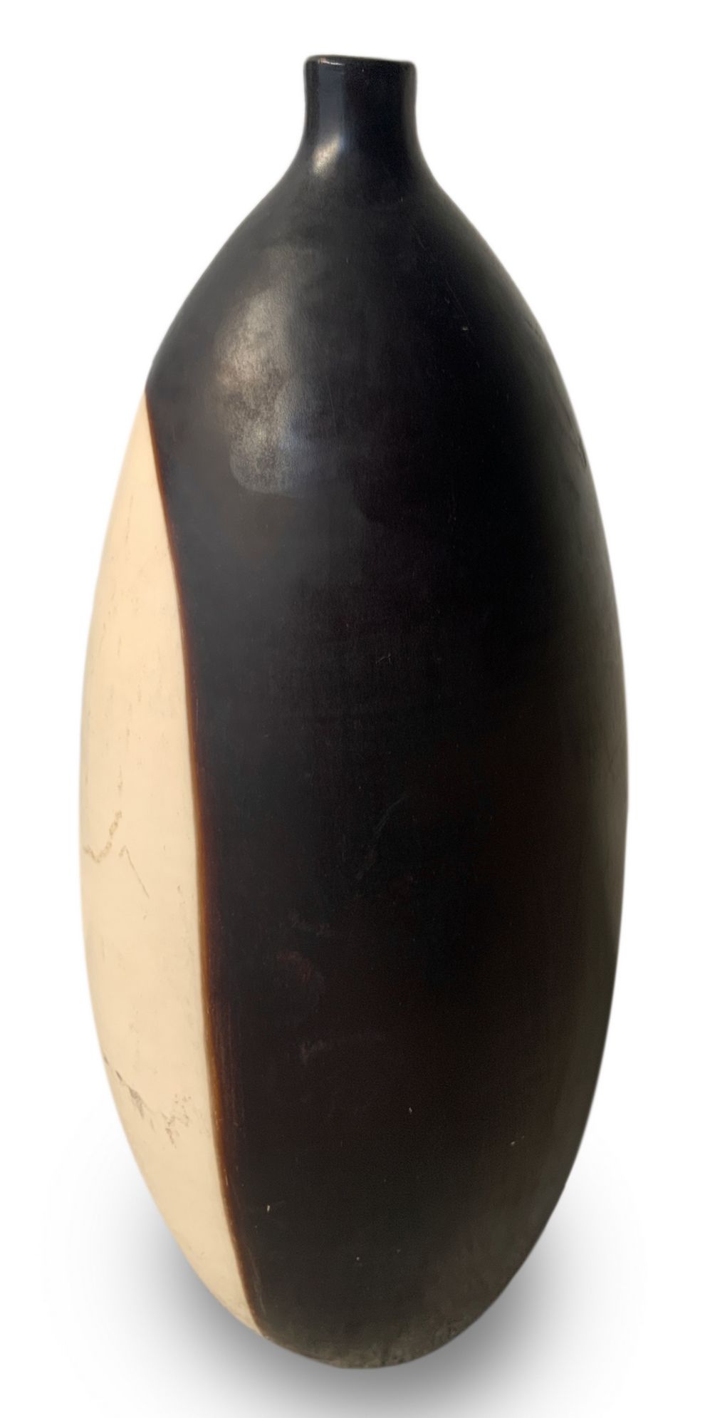 Vaso in ceramica di forma globulare nei toni del marrone e del bianco,...