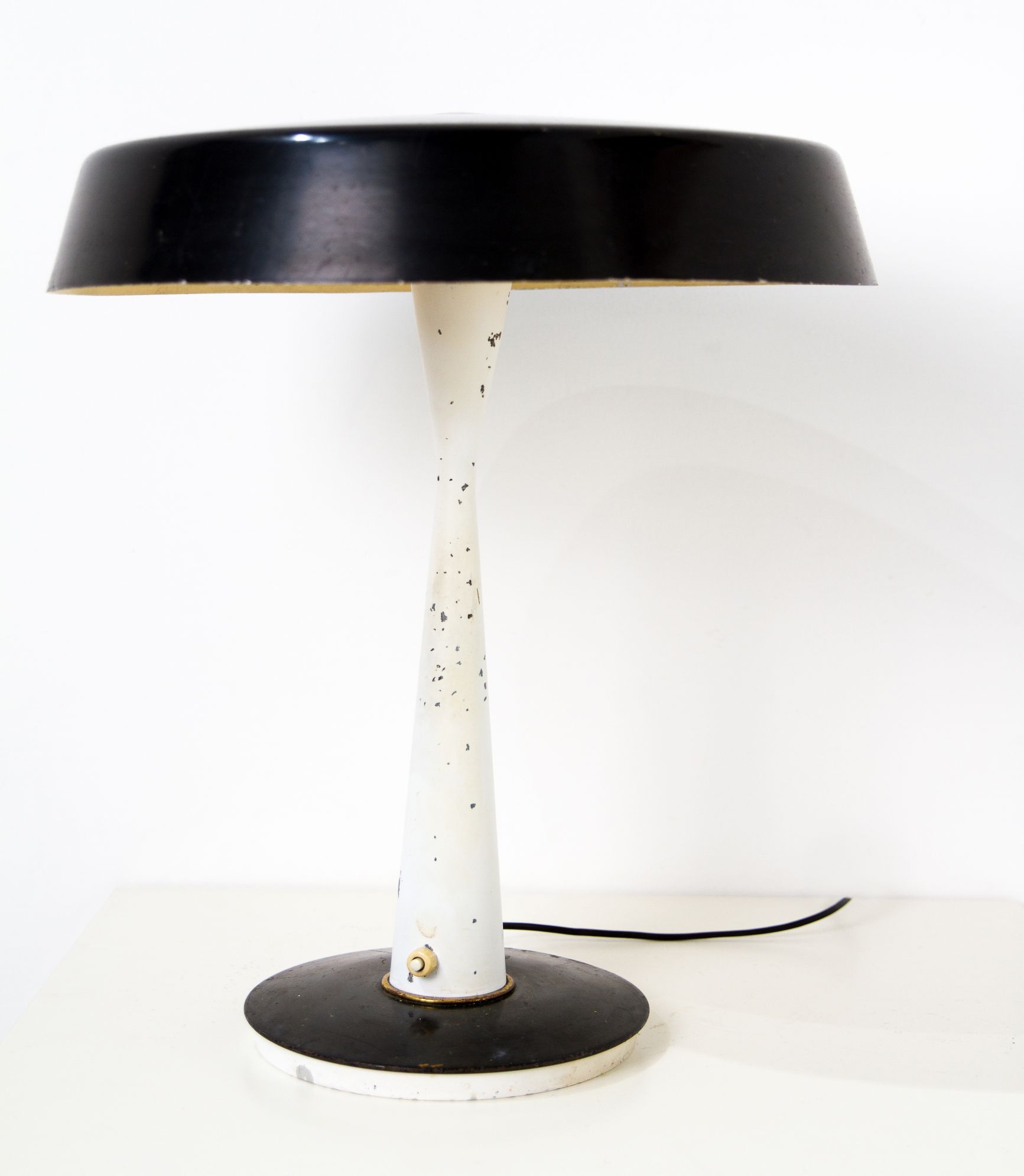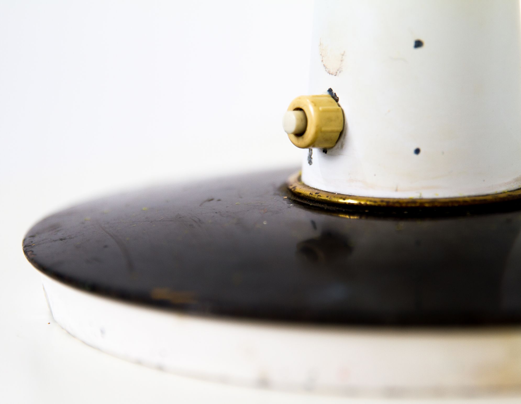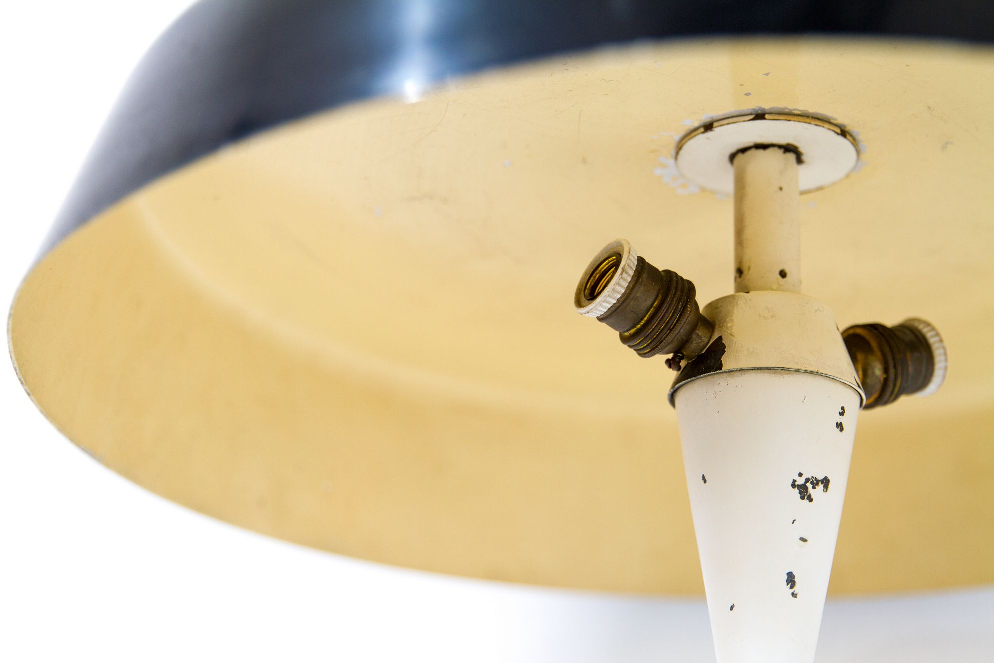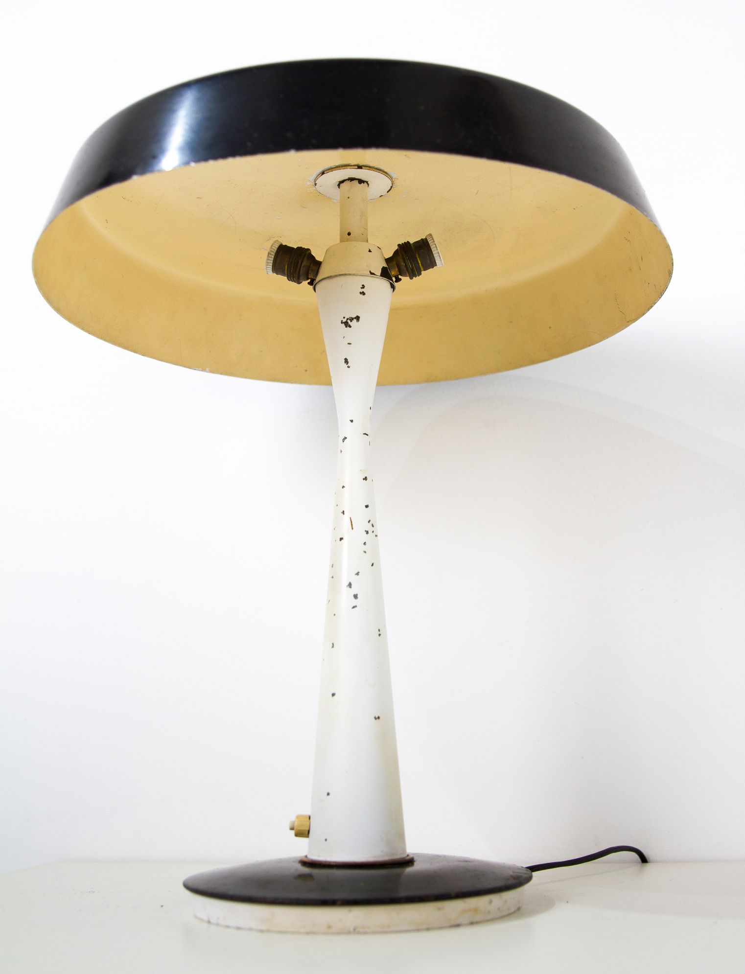 Stilnovo, su disegno Gaetano Scolari. Lampada da tavolo in metallo laccato e ottone. H cm 40x37. Salti di smalto. Anni 60.