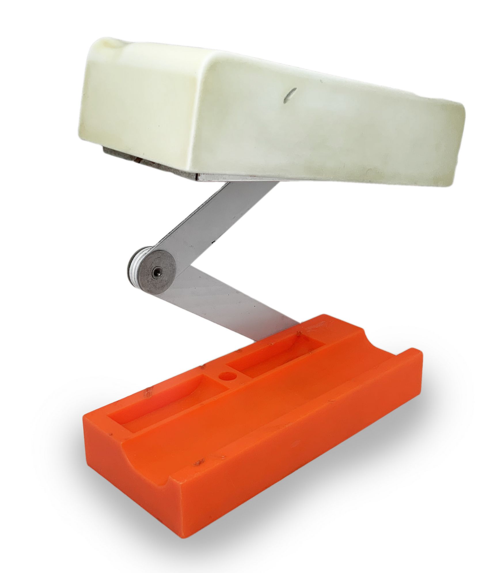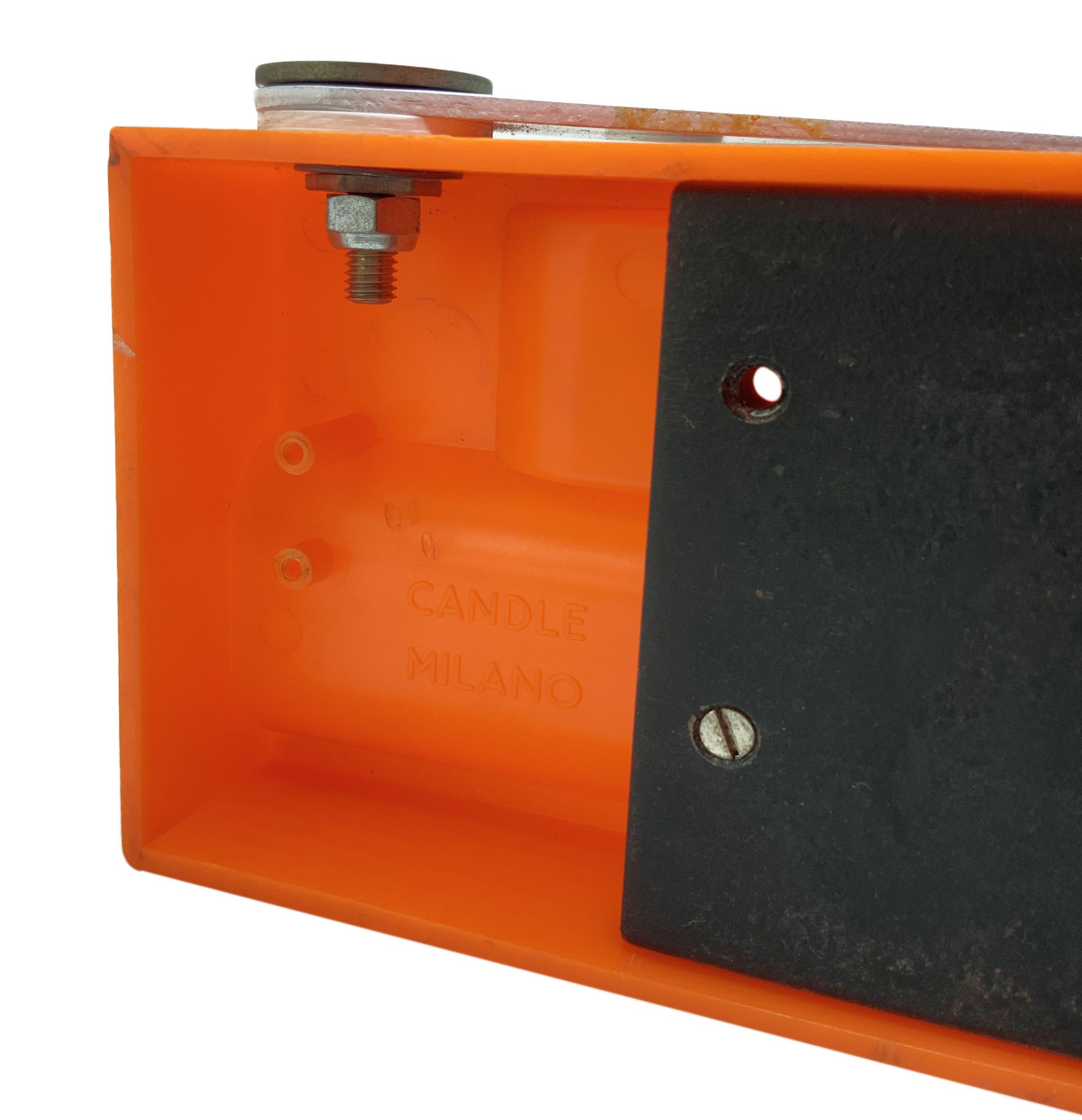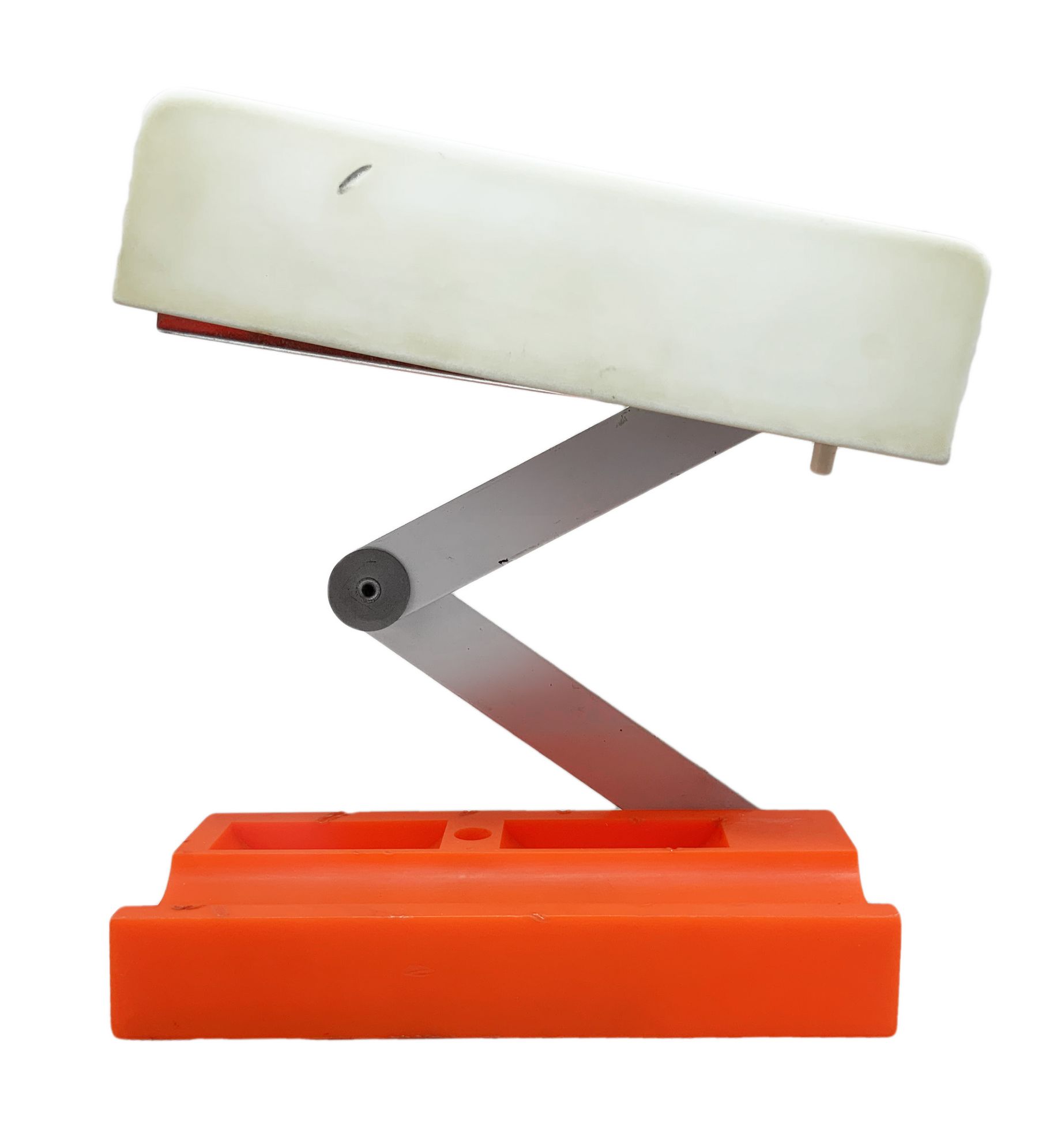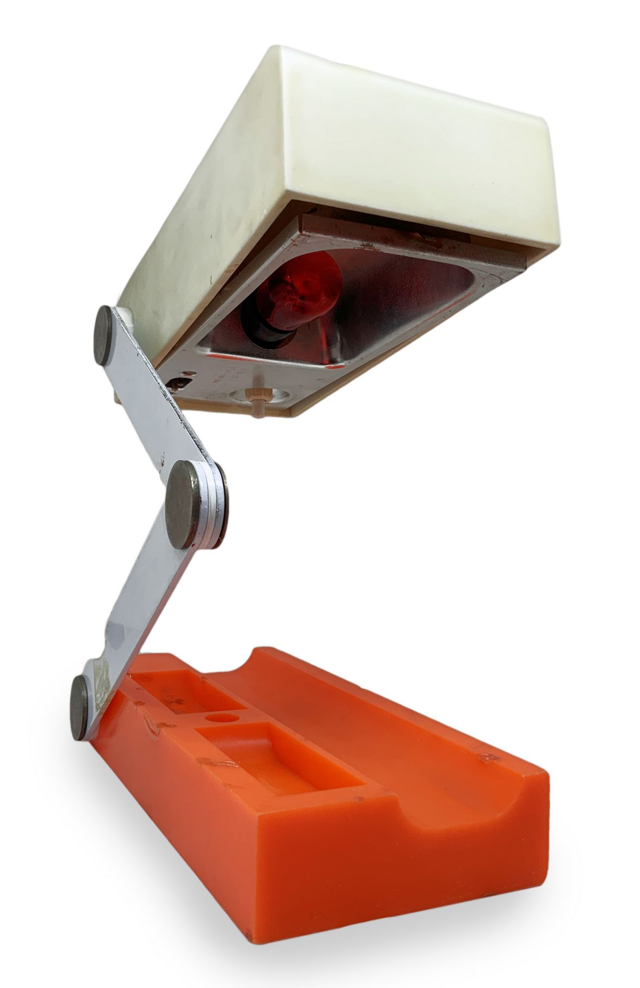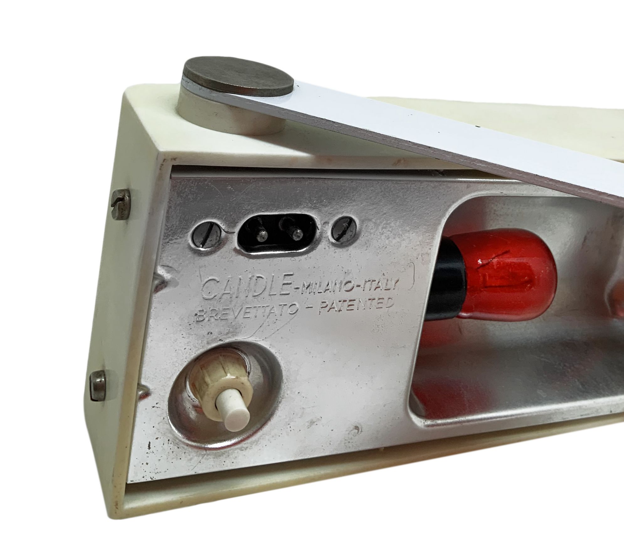 Candle Milano, disegno Giotto stoppino, lampada da tavolo con struttura in plastica e metallo laccato. Anni 60. Cm 34x8x19. Segni di uso, minime deformazioni.