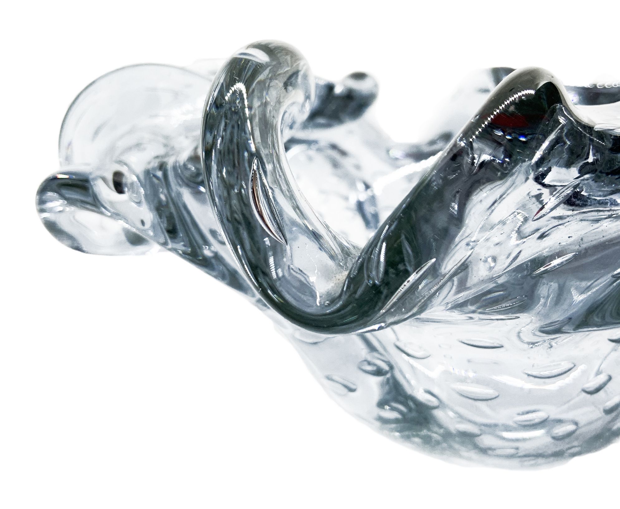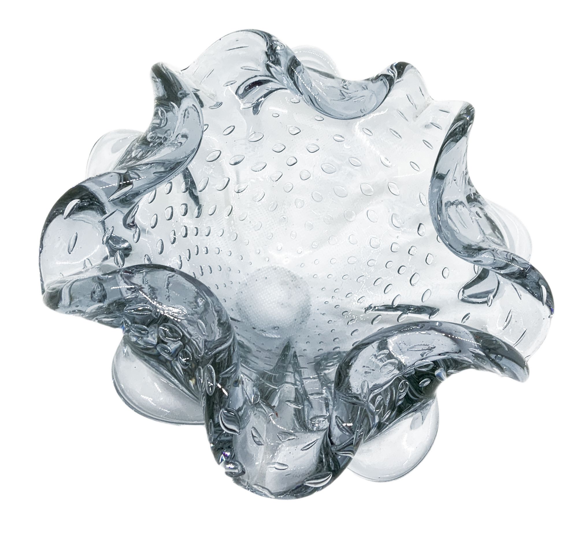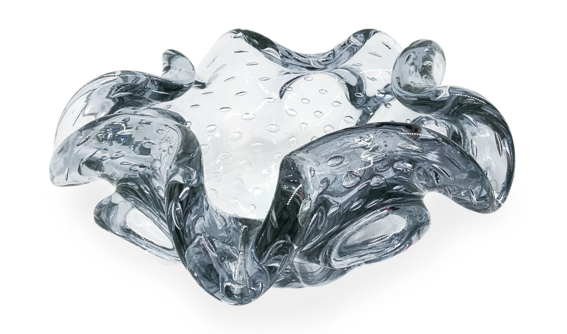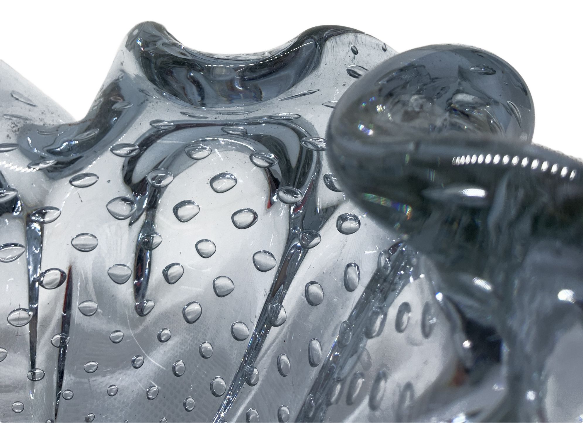 Barovier e Toso Murano, posacenere in vetro di forma floreale nei toni del grigio, inclusioni di bolle. Anni 40. H Cm 10 x20 diam