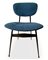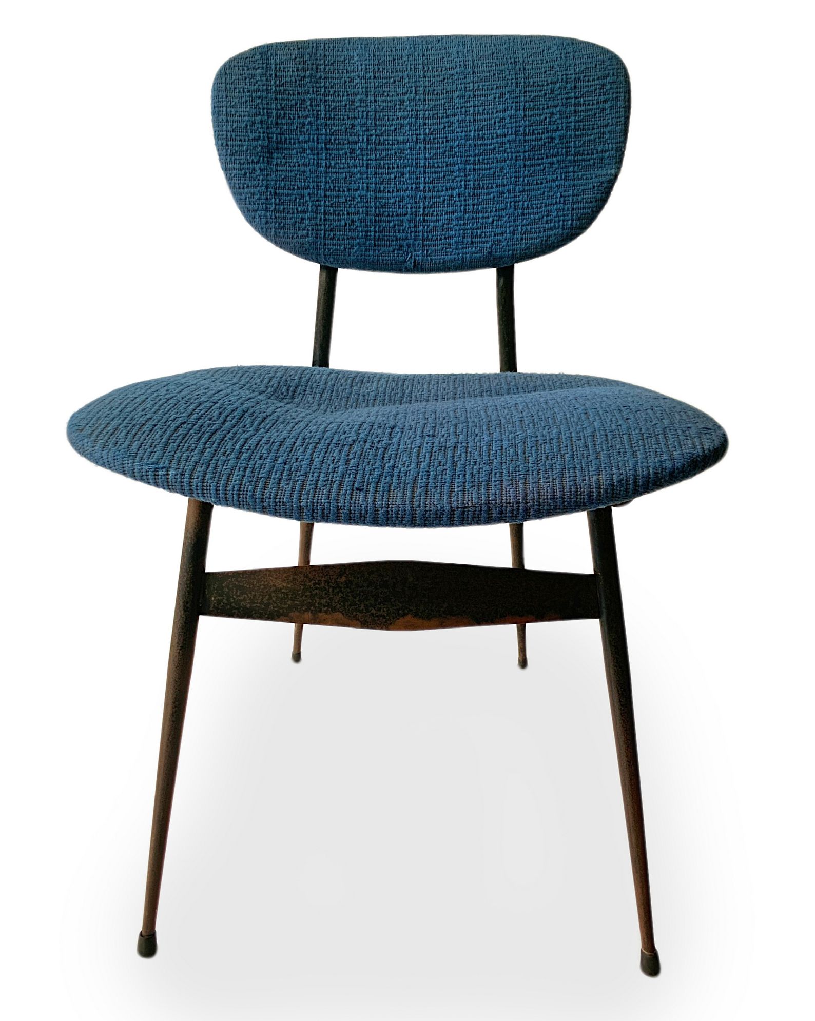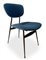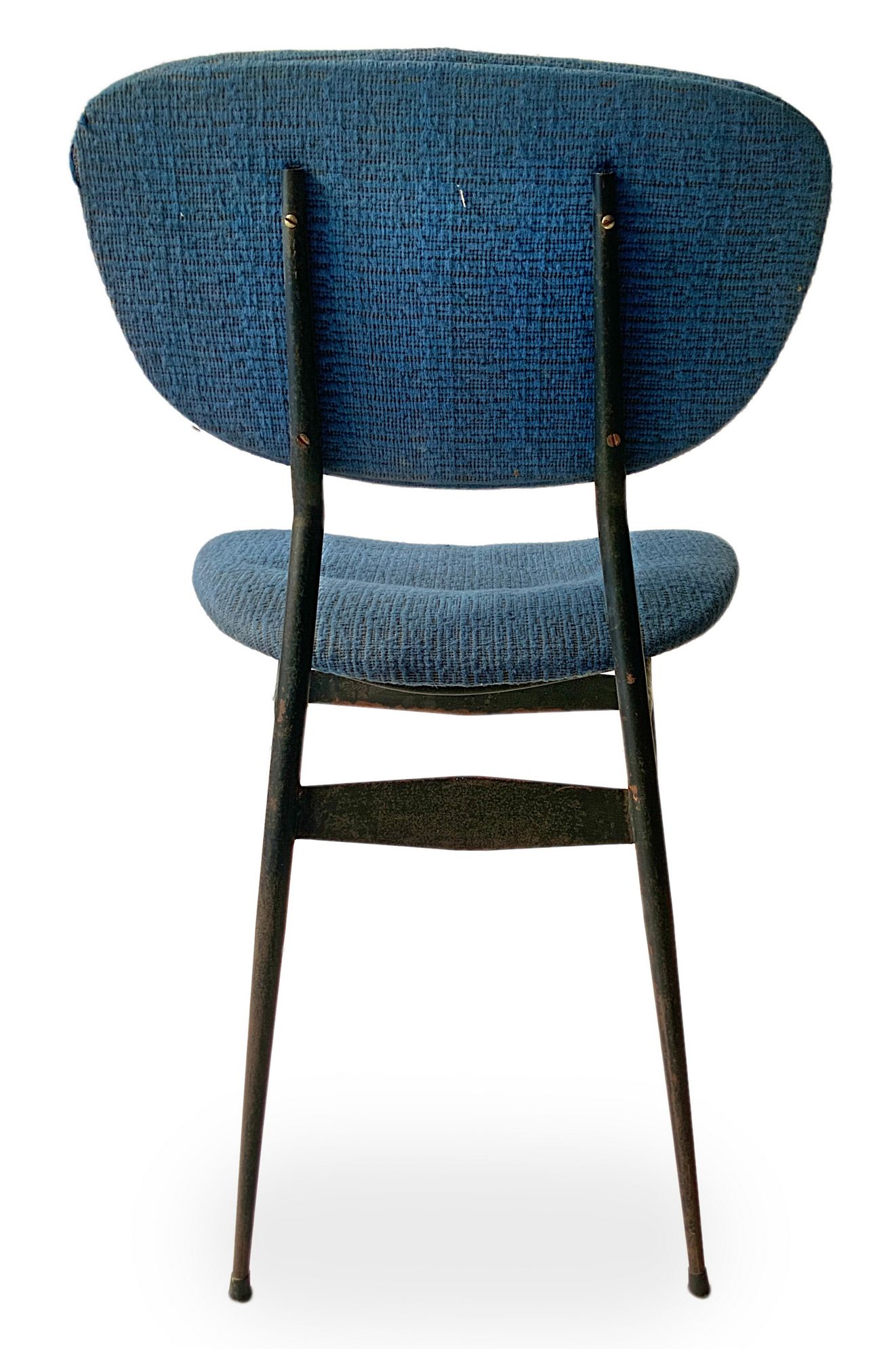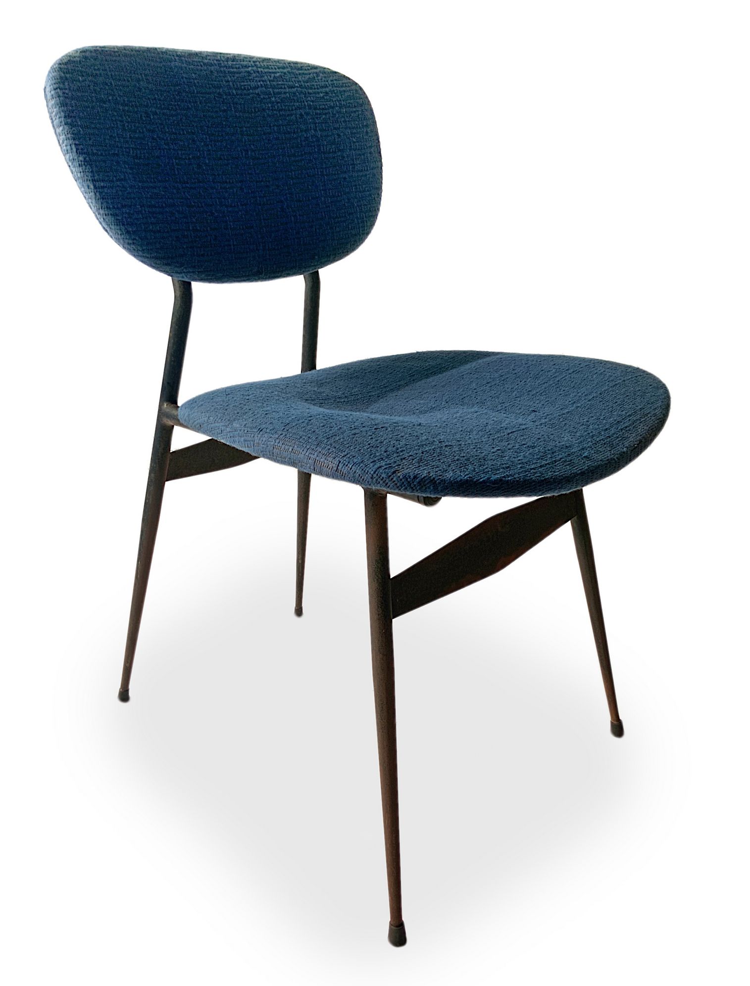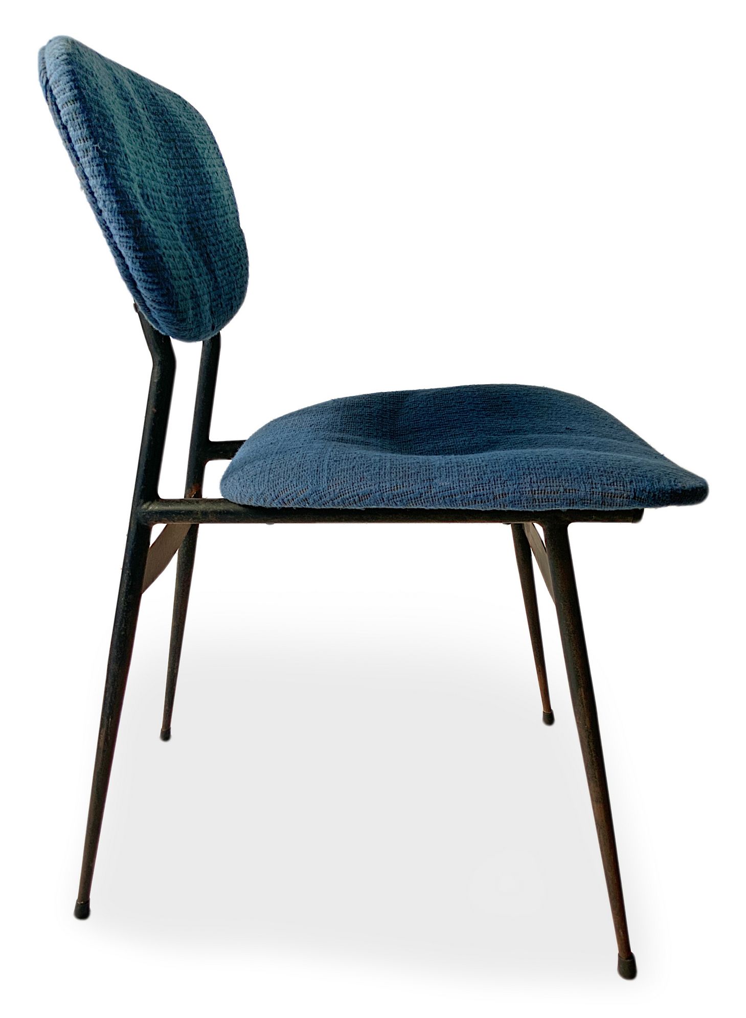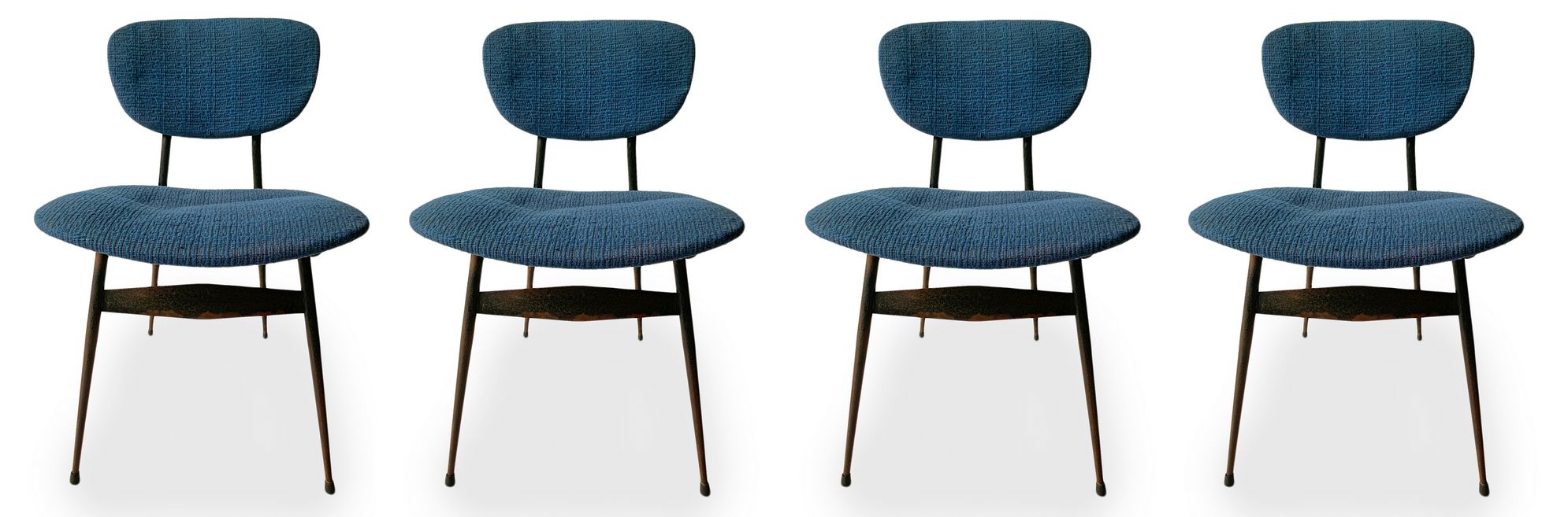 Gruppo di n. 4 sedie con struttura in metallo laccato nero, produzione italiana. Seduta e spalliera imbottite in tessuto originale dell'epoca. Anni 50. Cm 76x48x46