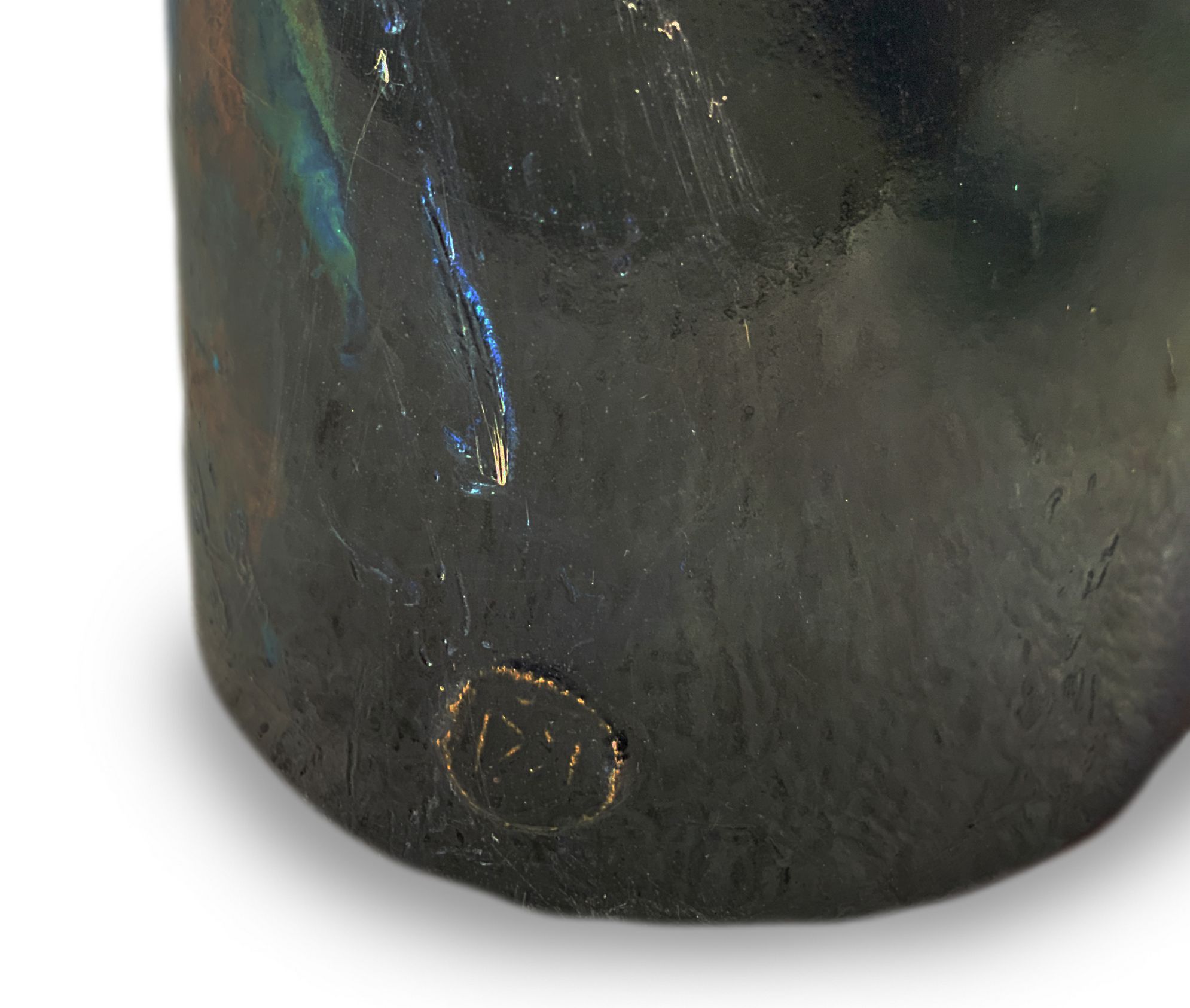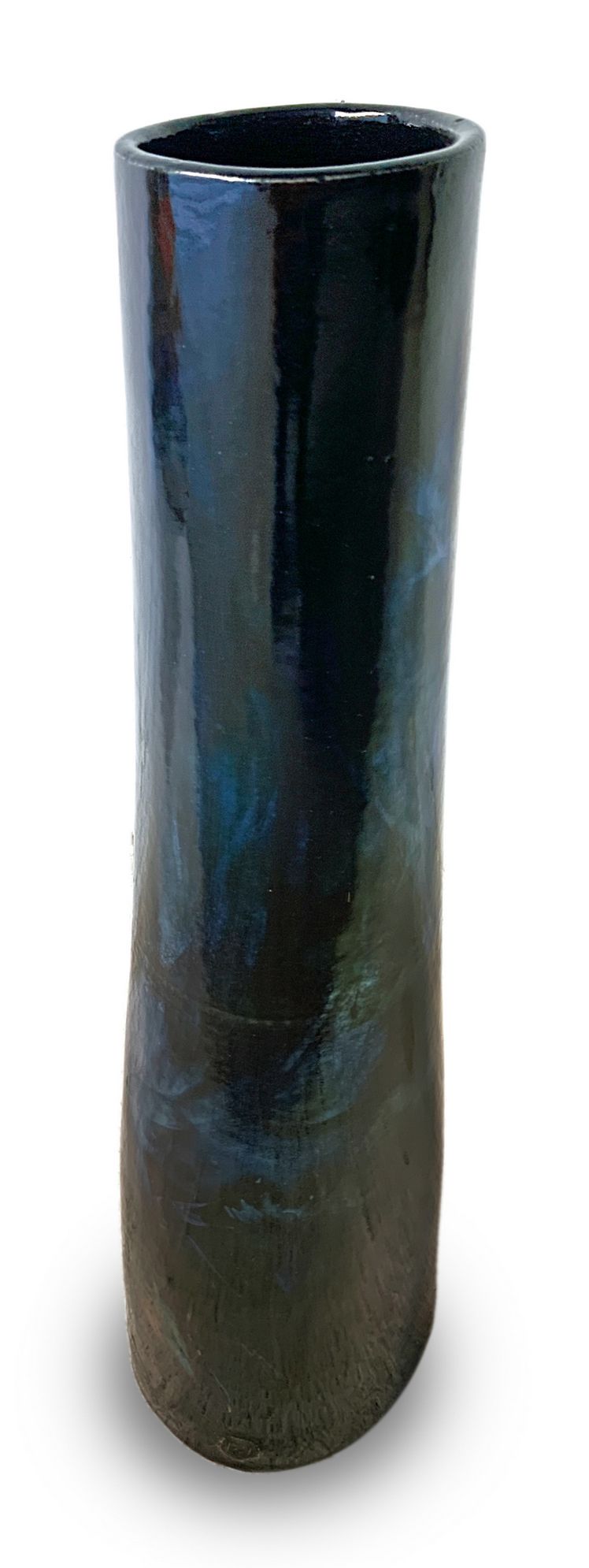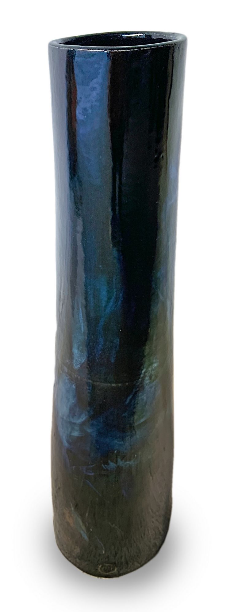 Vaso cilindrico in terracotta con decoro in smalti colati nei toni del blu e dell'azzurro, produzione italiana. Simbolo della manifattura applicato alla base. Anni 50. H cm. 38