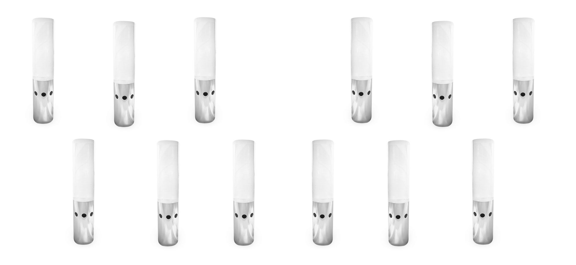 Reggiani, disegno Goffredo, Reggiani gruppo di N. 12 lampade, struttura in alluminio anodizzato di forma cilindrica e diffusore in lucite di varie dimensioni. Anni 60. H cm 26 Diametro. Cm 6