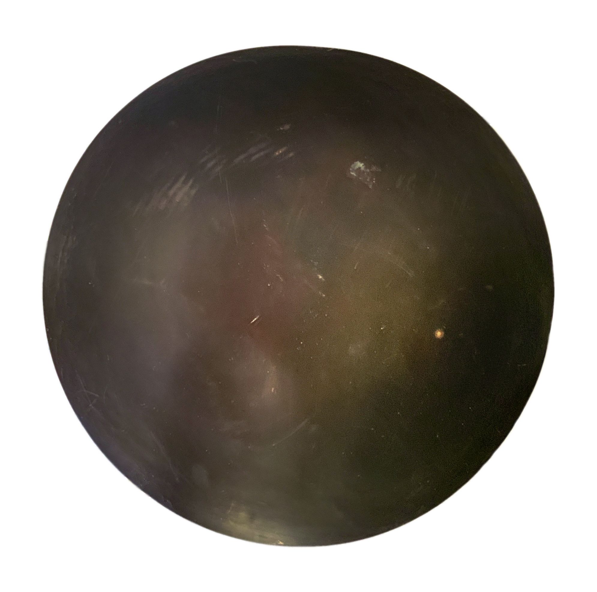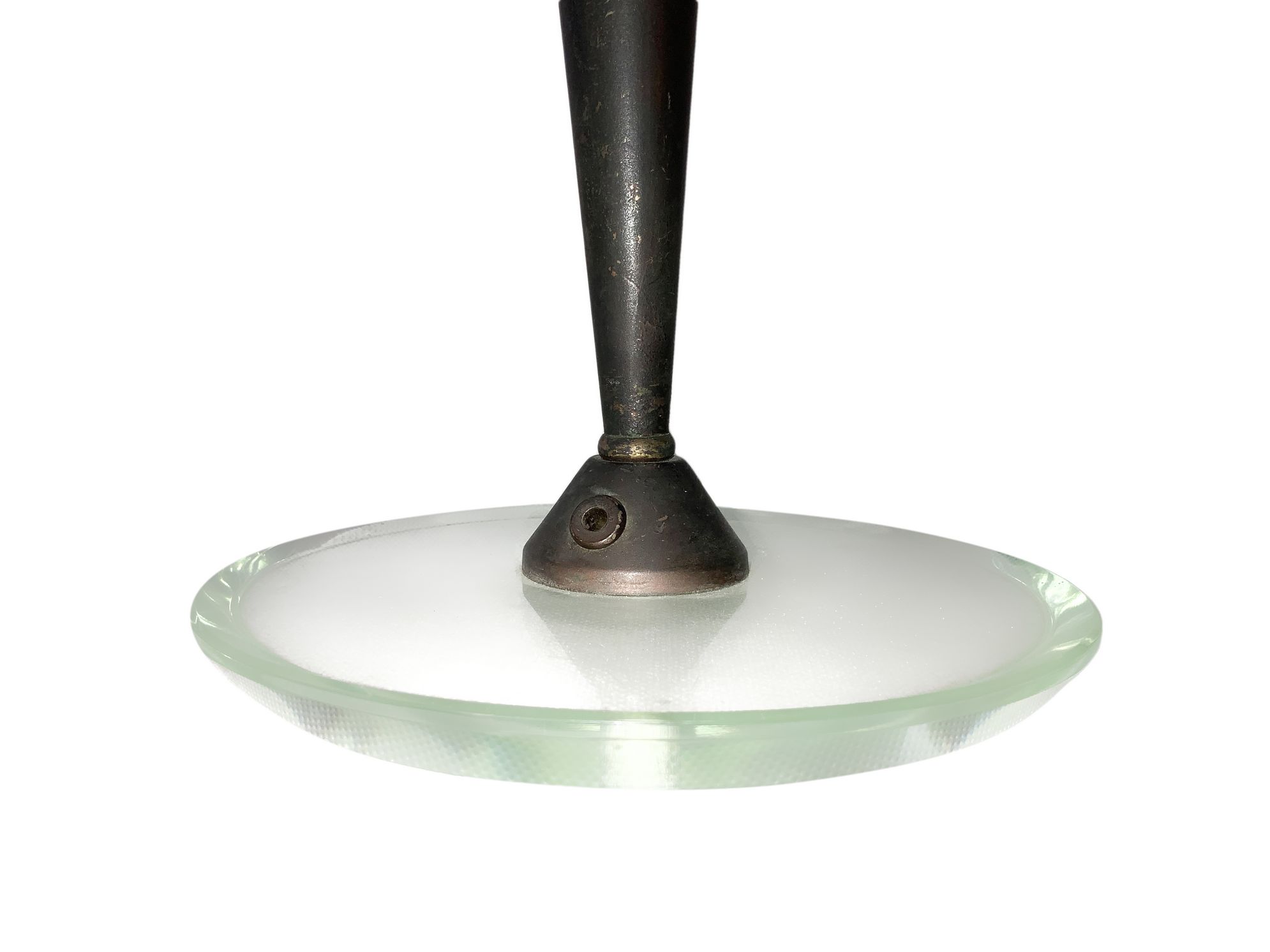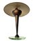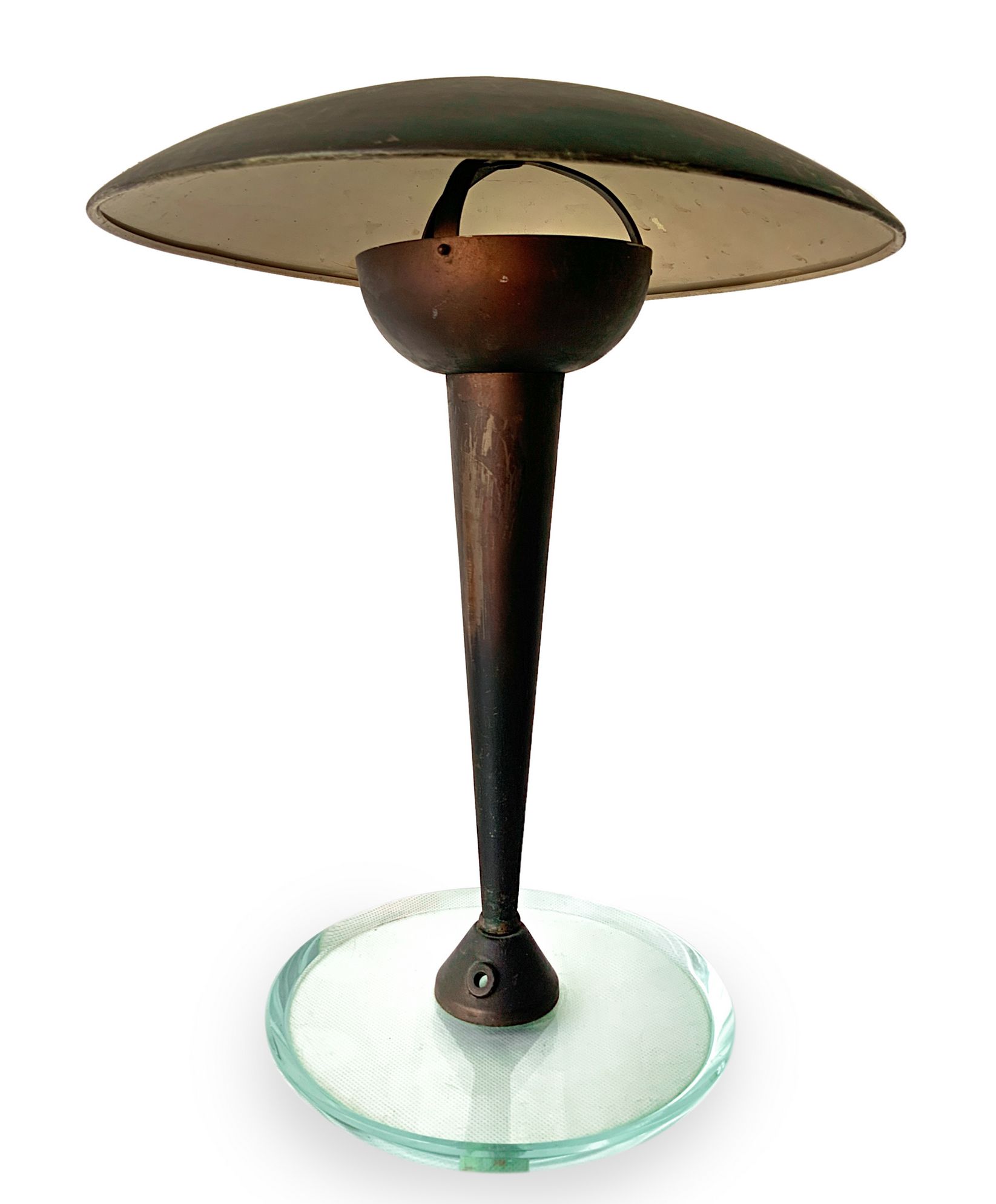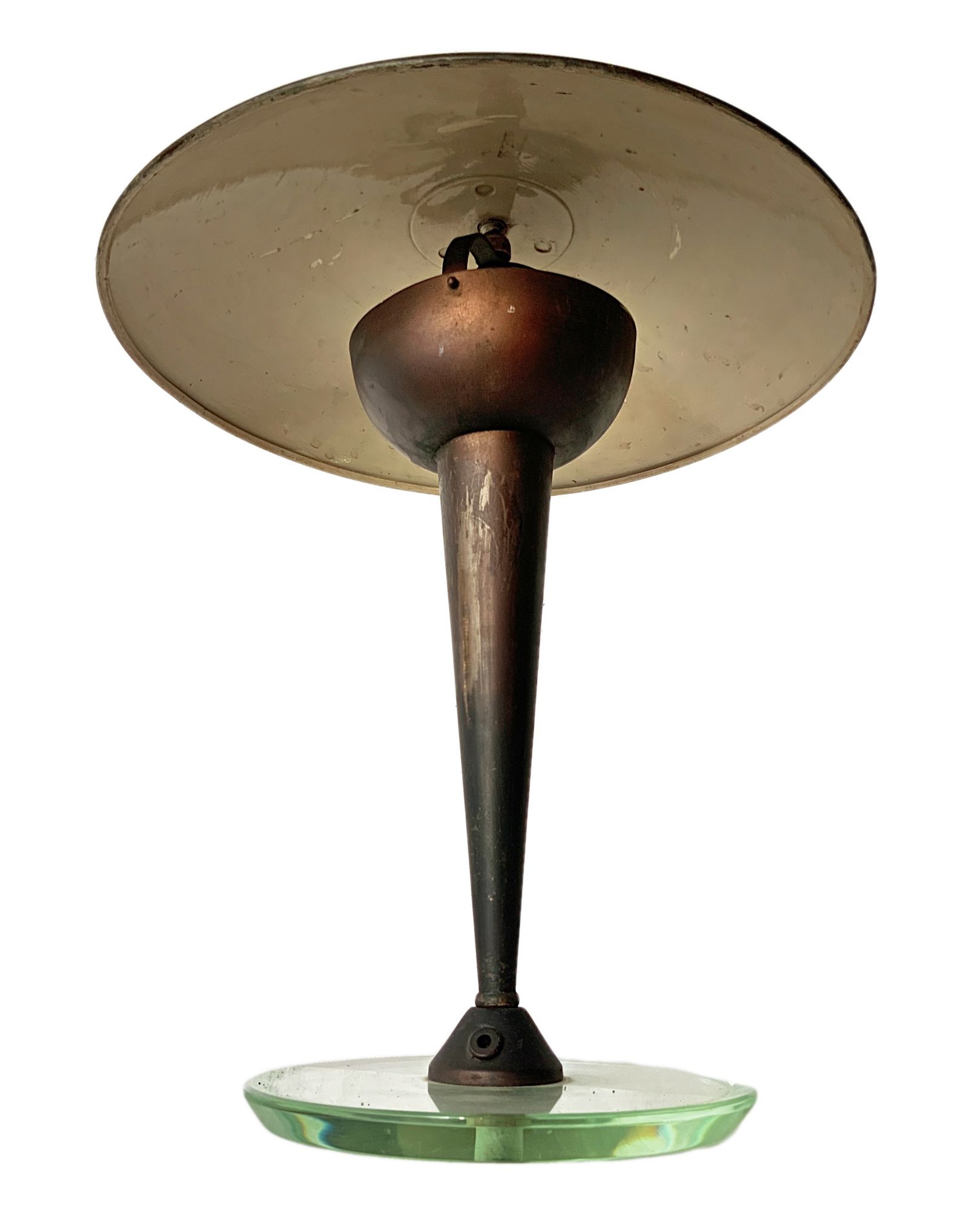 Lampada da tavolo, produzione italiana. Con struttura in ottone e base in vetro verde Nilo di forte spessore. Anni 50. Cm 33x35 diametro. Graffi, segni d'uso.