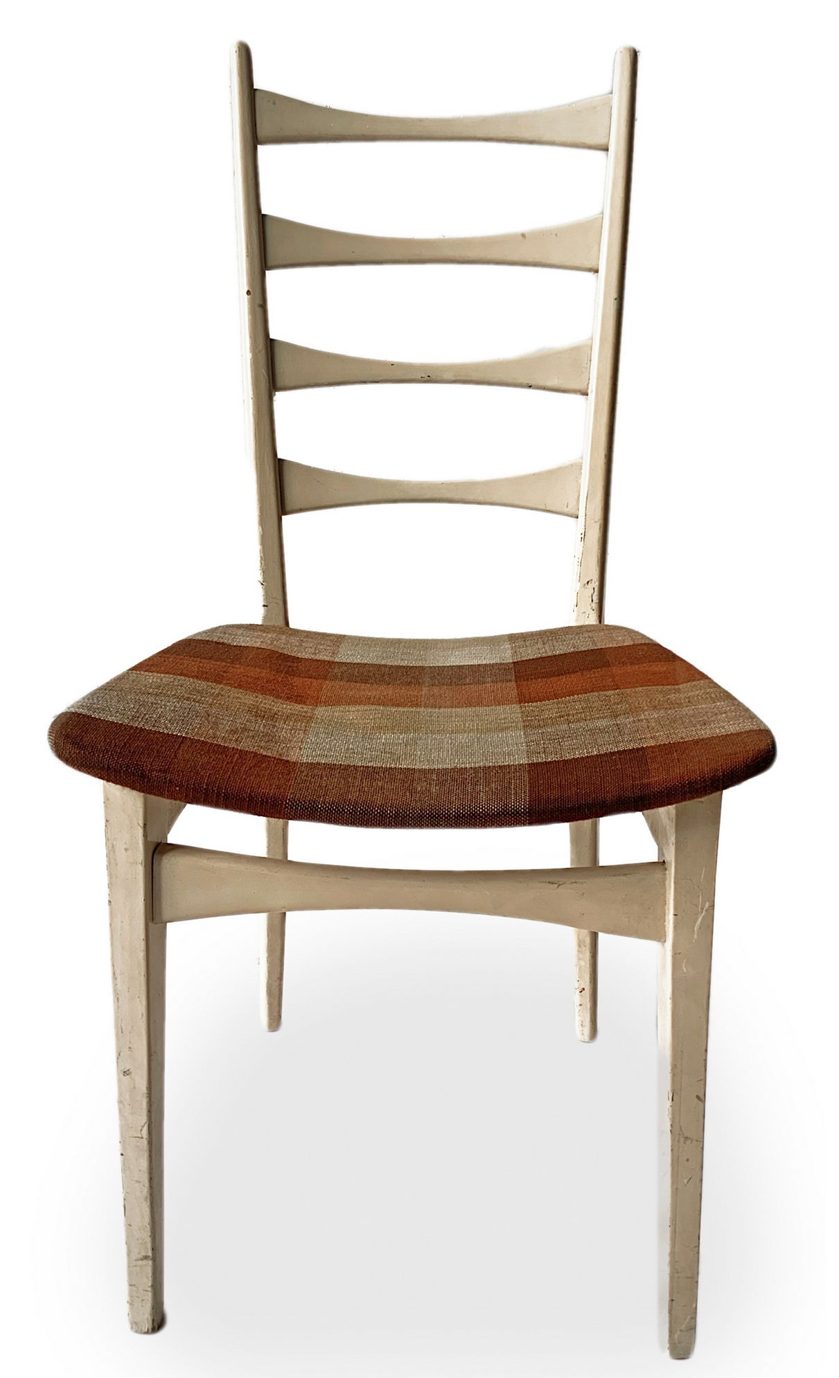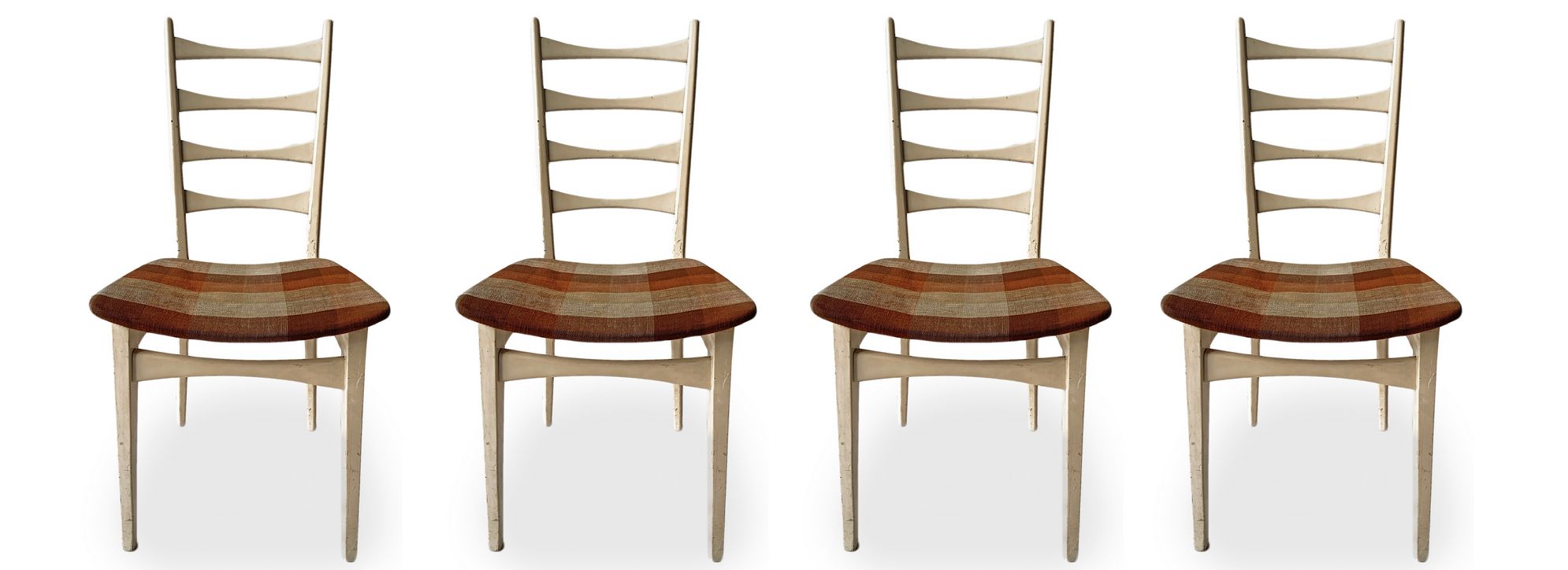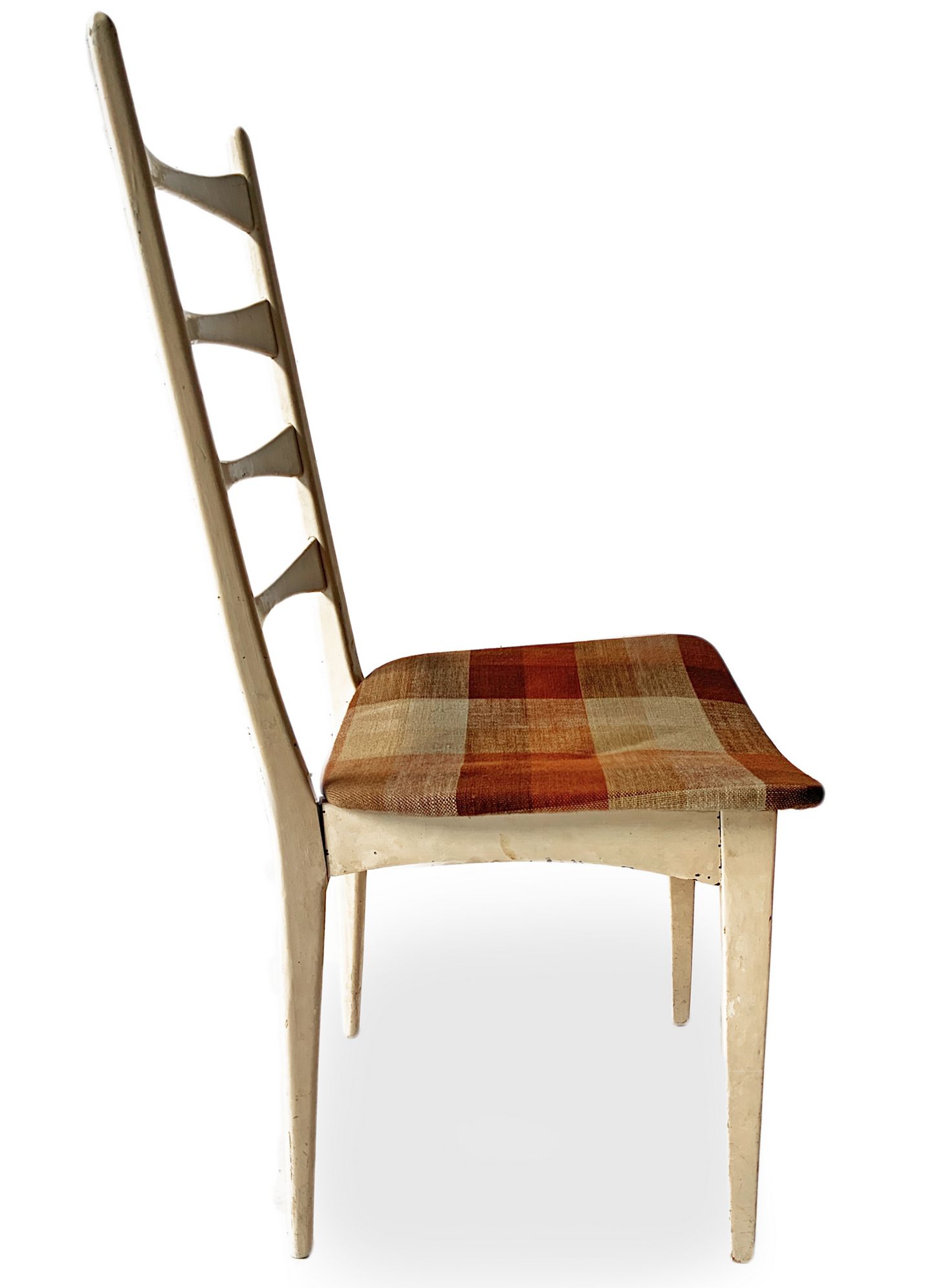 Gruppo di n.4 sedie in legno, produzione italiana nello stile di Paolo Buffa. Con alta spalliera laccata nei toni del bianco, seduta imbottita. Anni 50. Cm 97x39x41