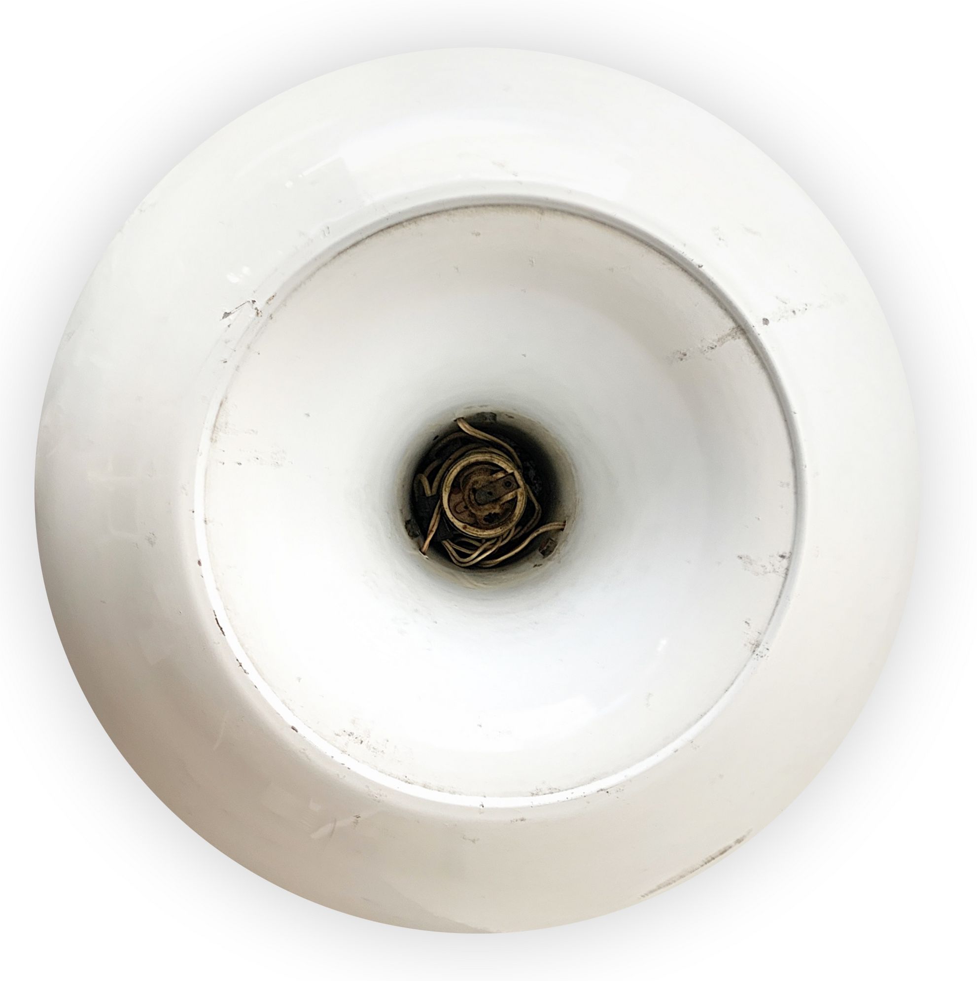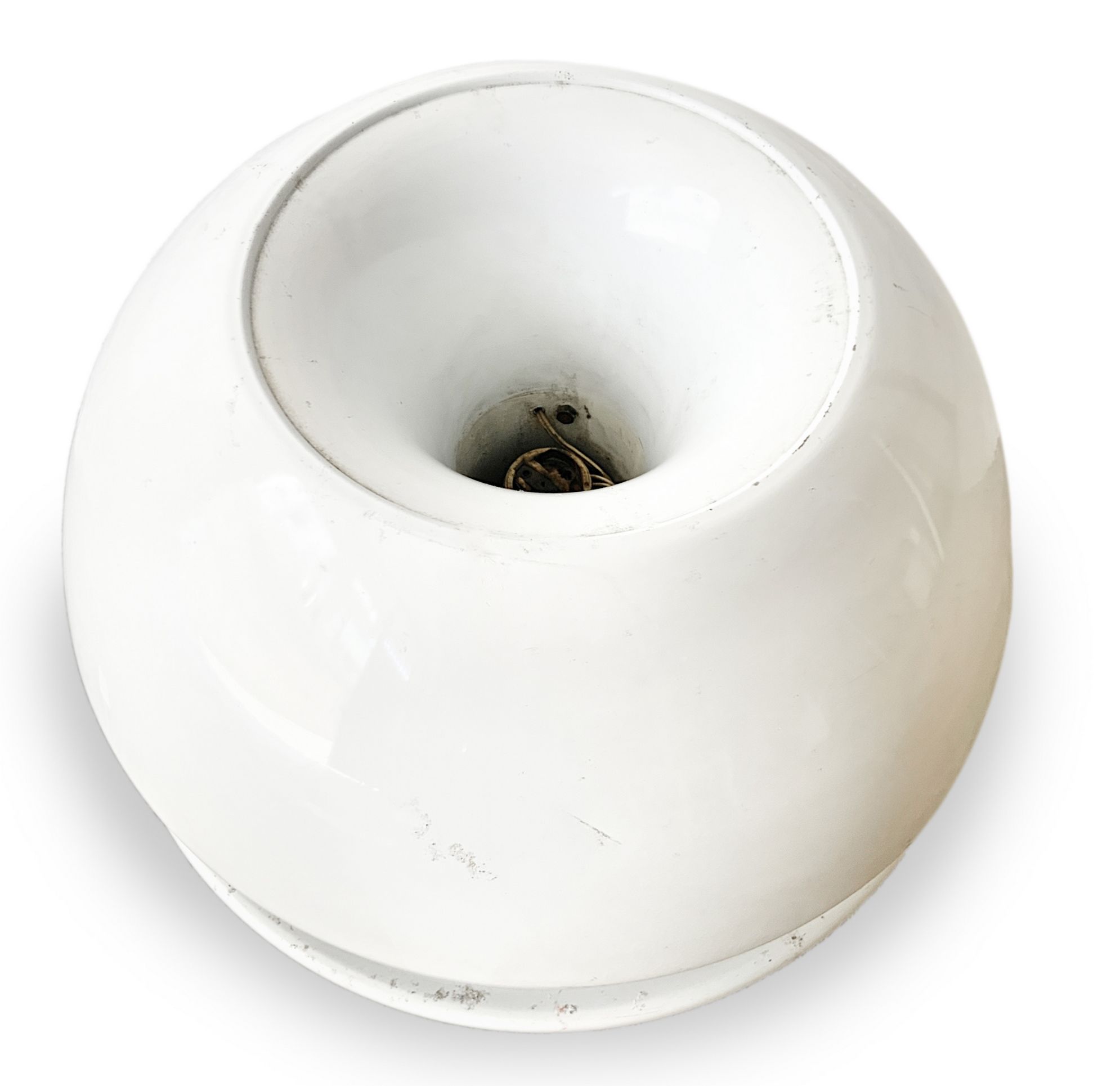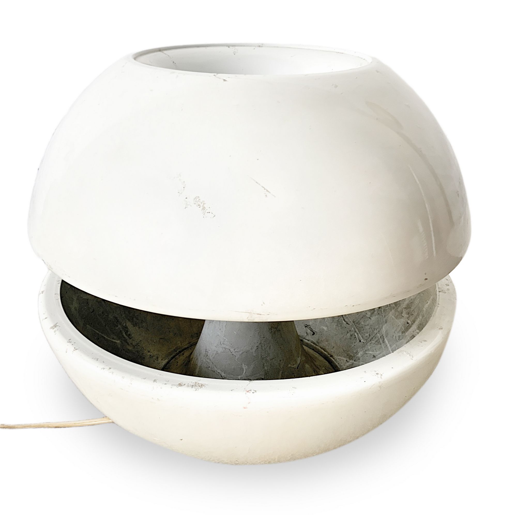 Lampada da tavolo, produzione italiana. Di forma sferica in metallo laccato bianco. Anni 70. Cm 35x38 diametri. Segni di uso lungo la superficie.