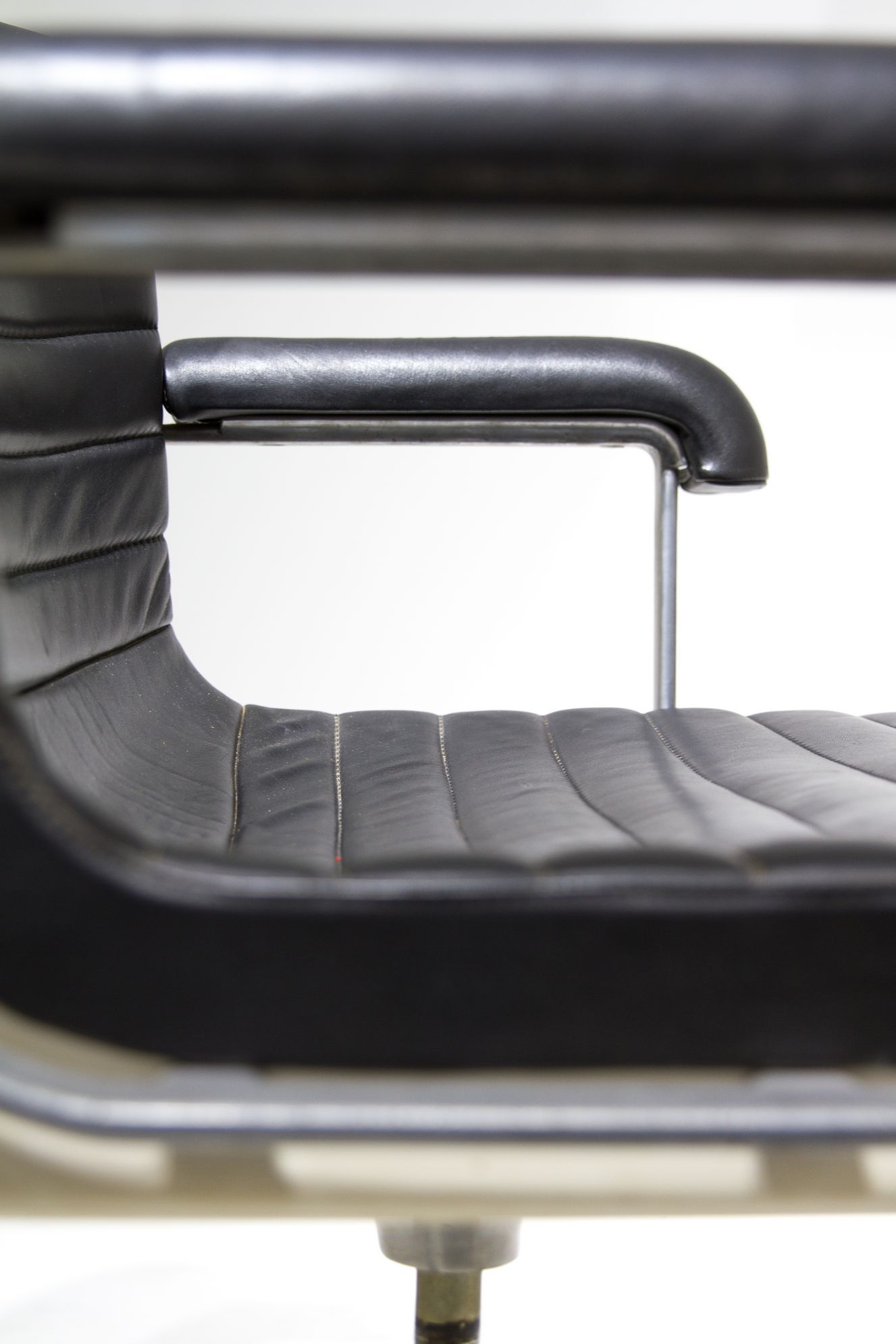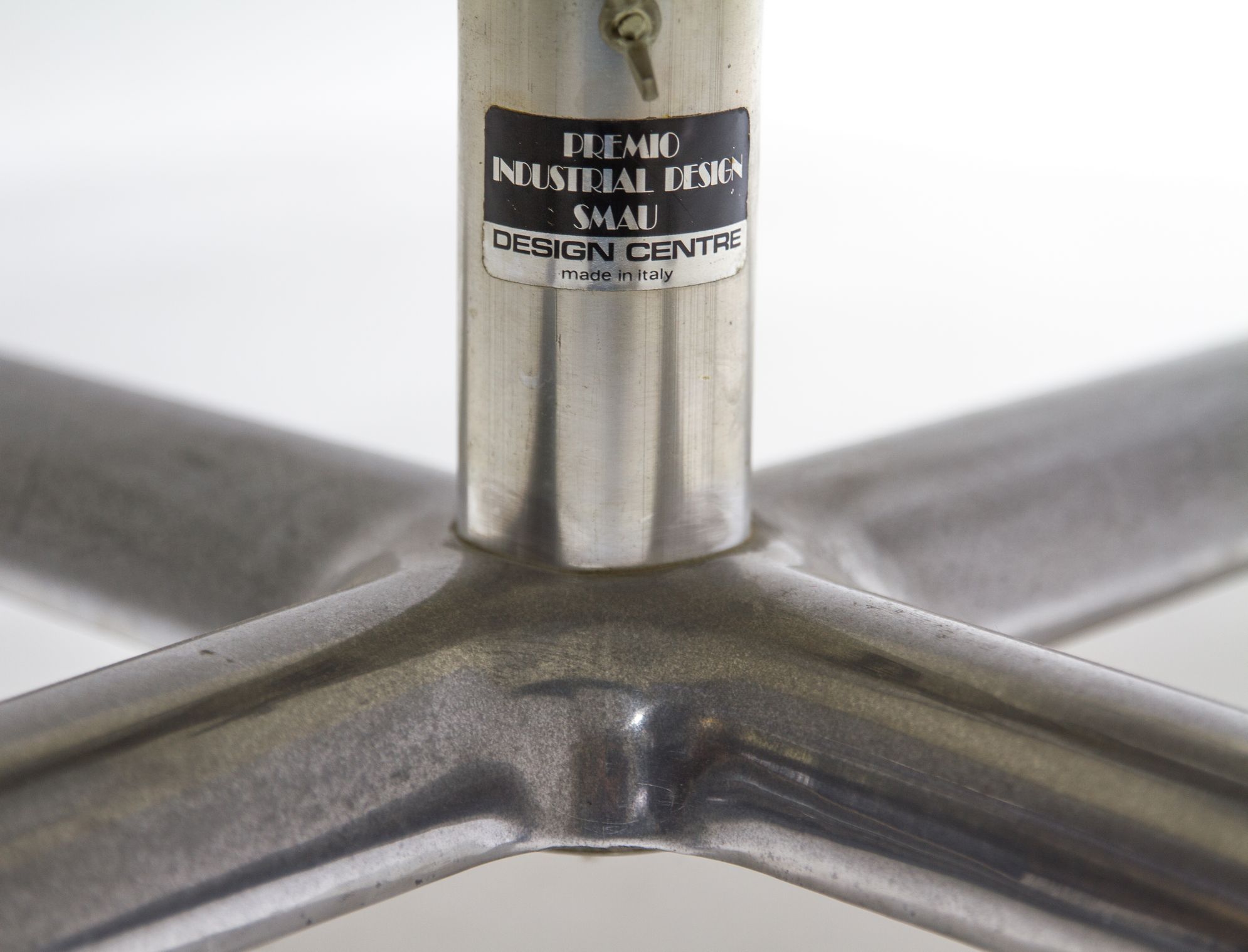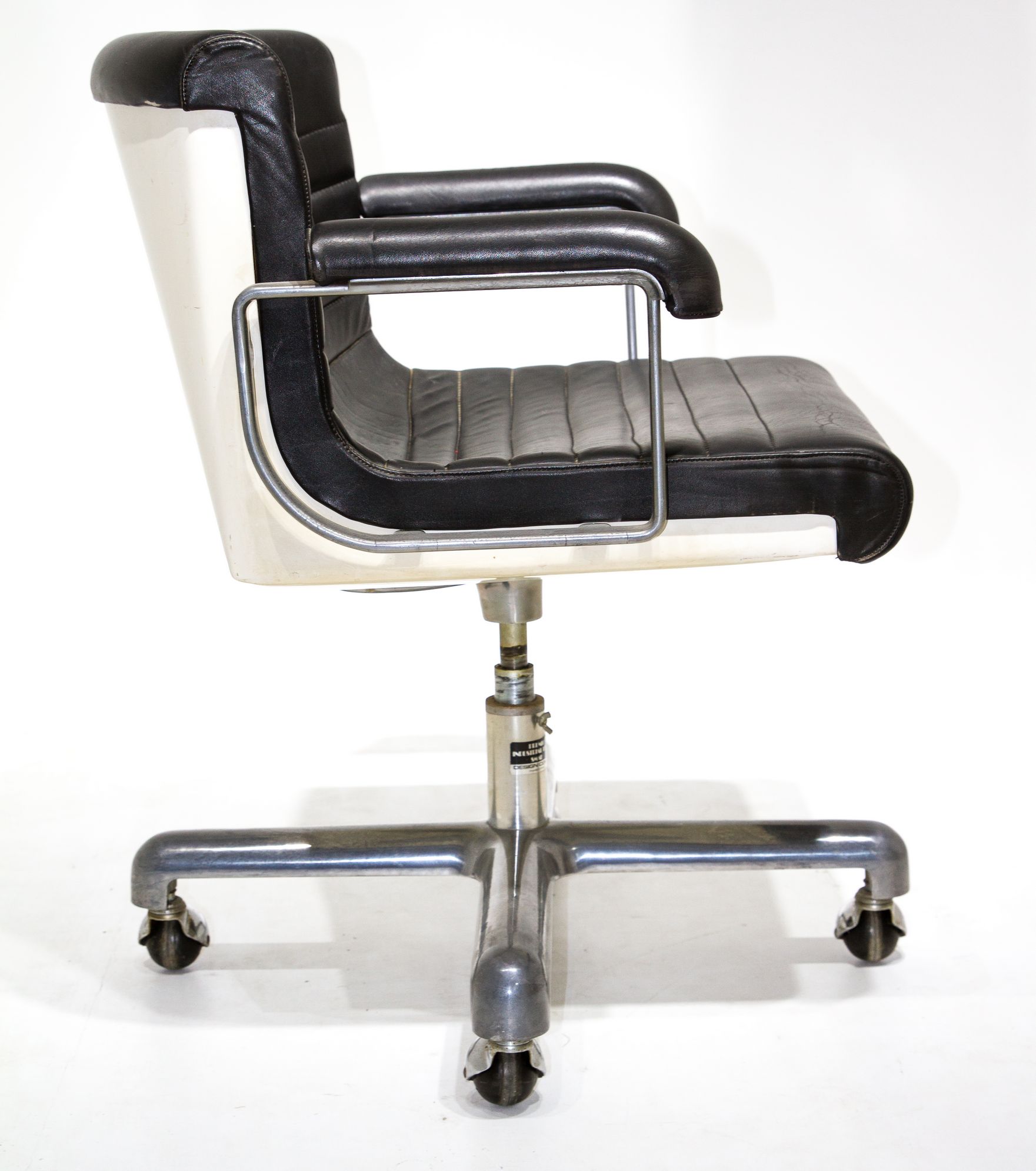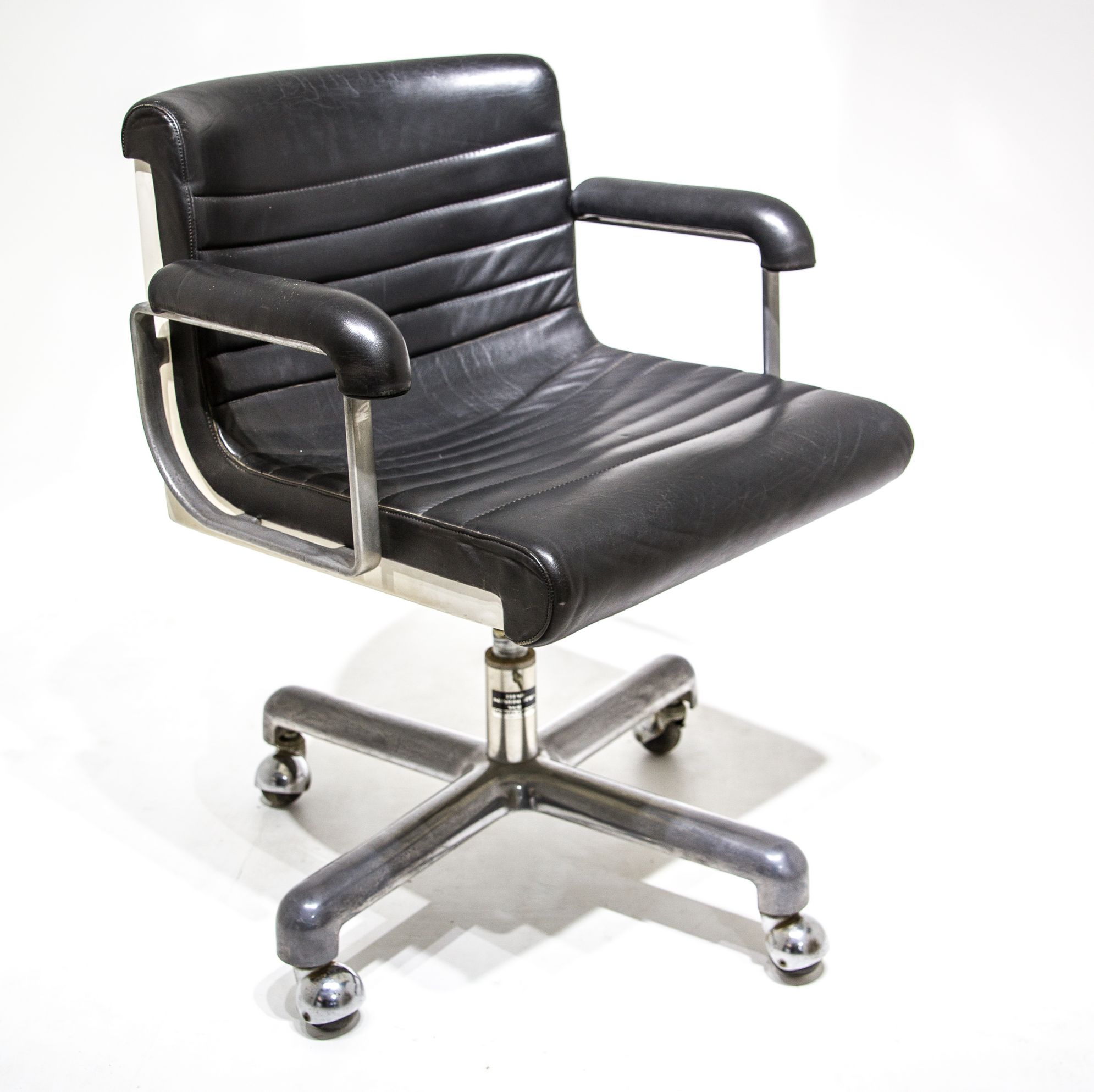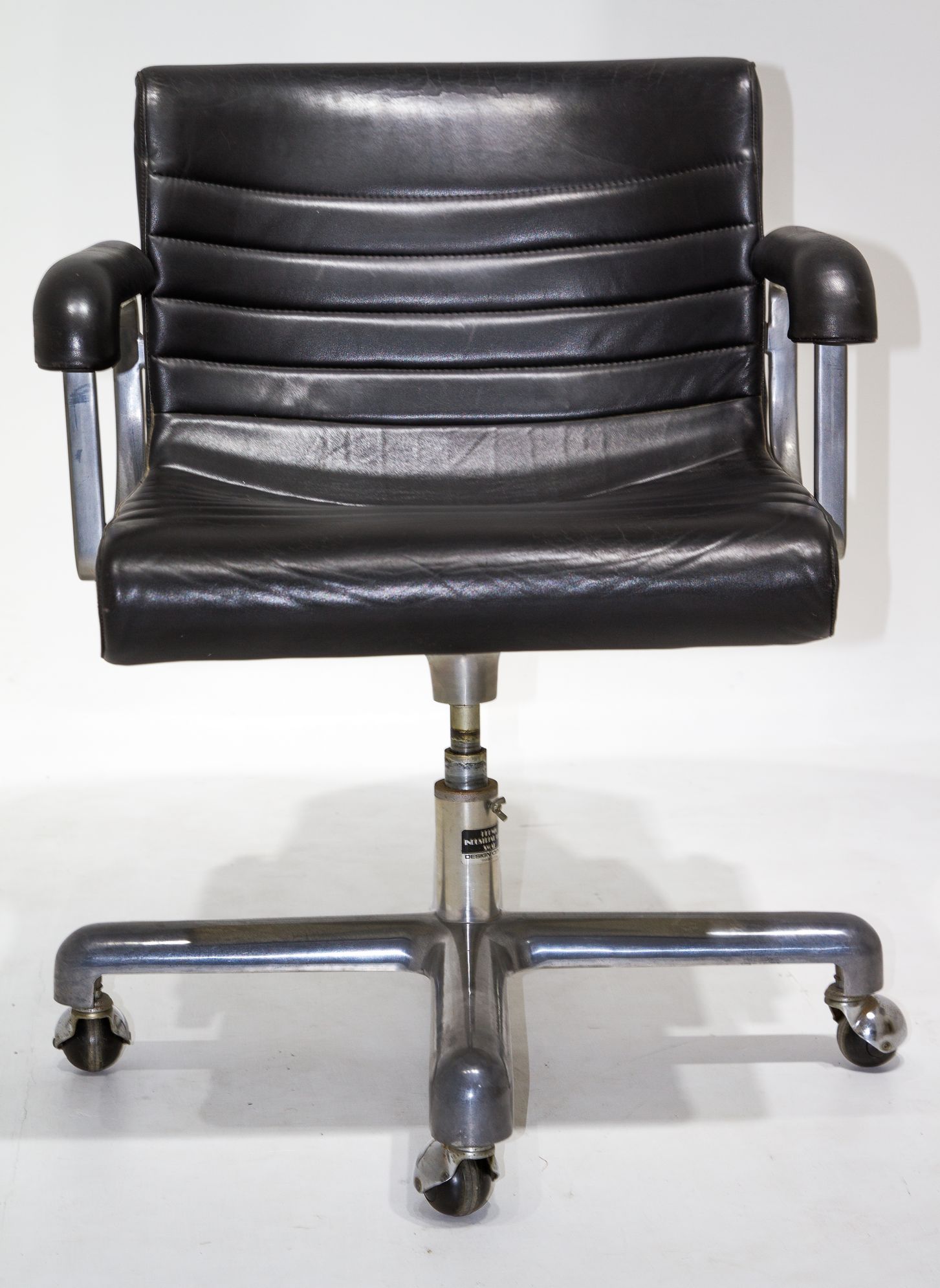 Design Centre, disegno Ettore Sottsass e Hans Von Klier. Sedia girevole, struttura in alluminio, resina, seduta in pelle. Anni 70. H cm 85 X 50X57