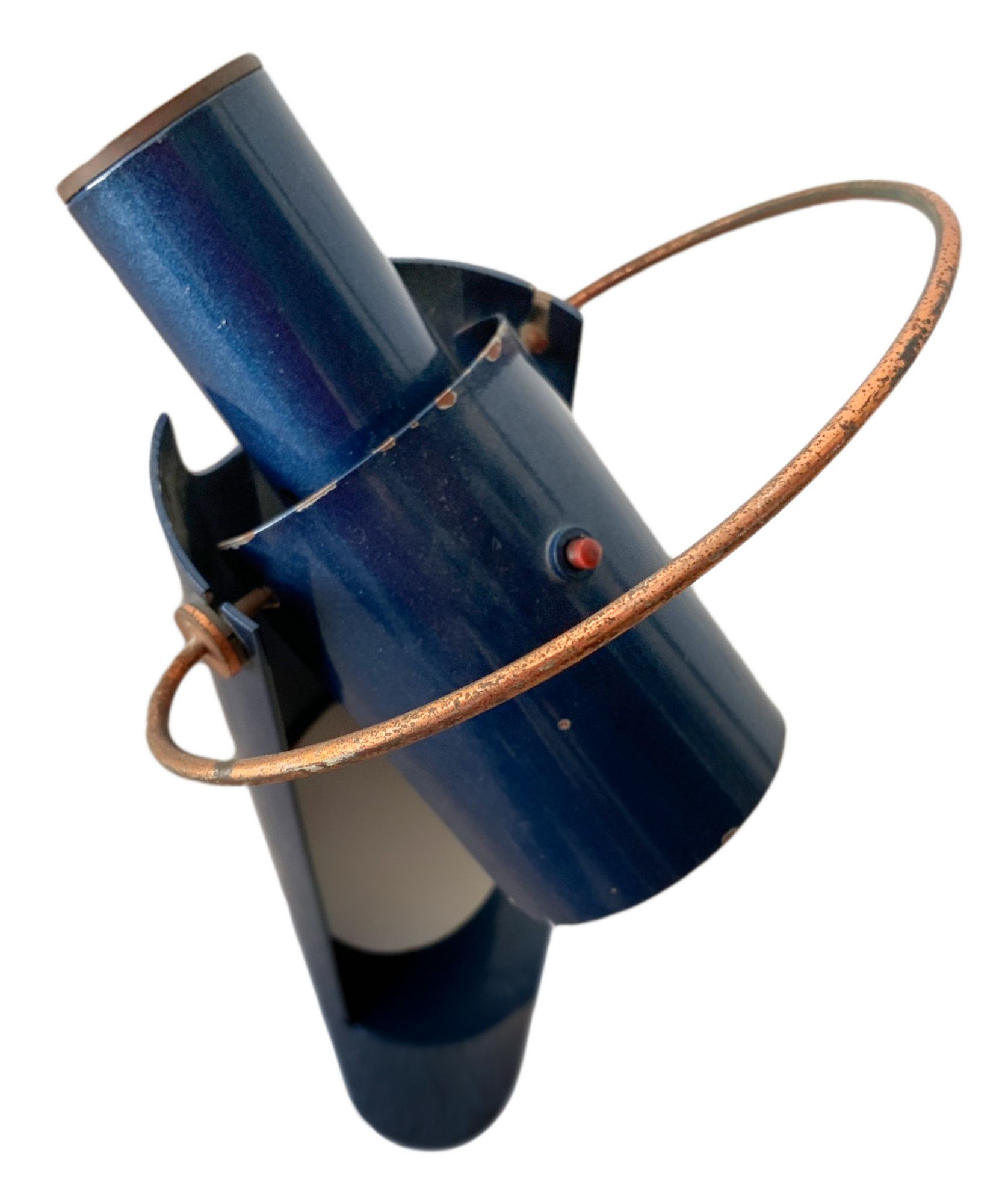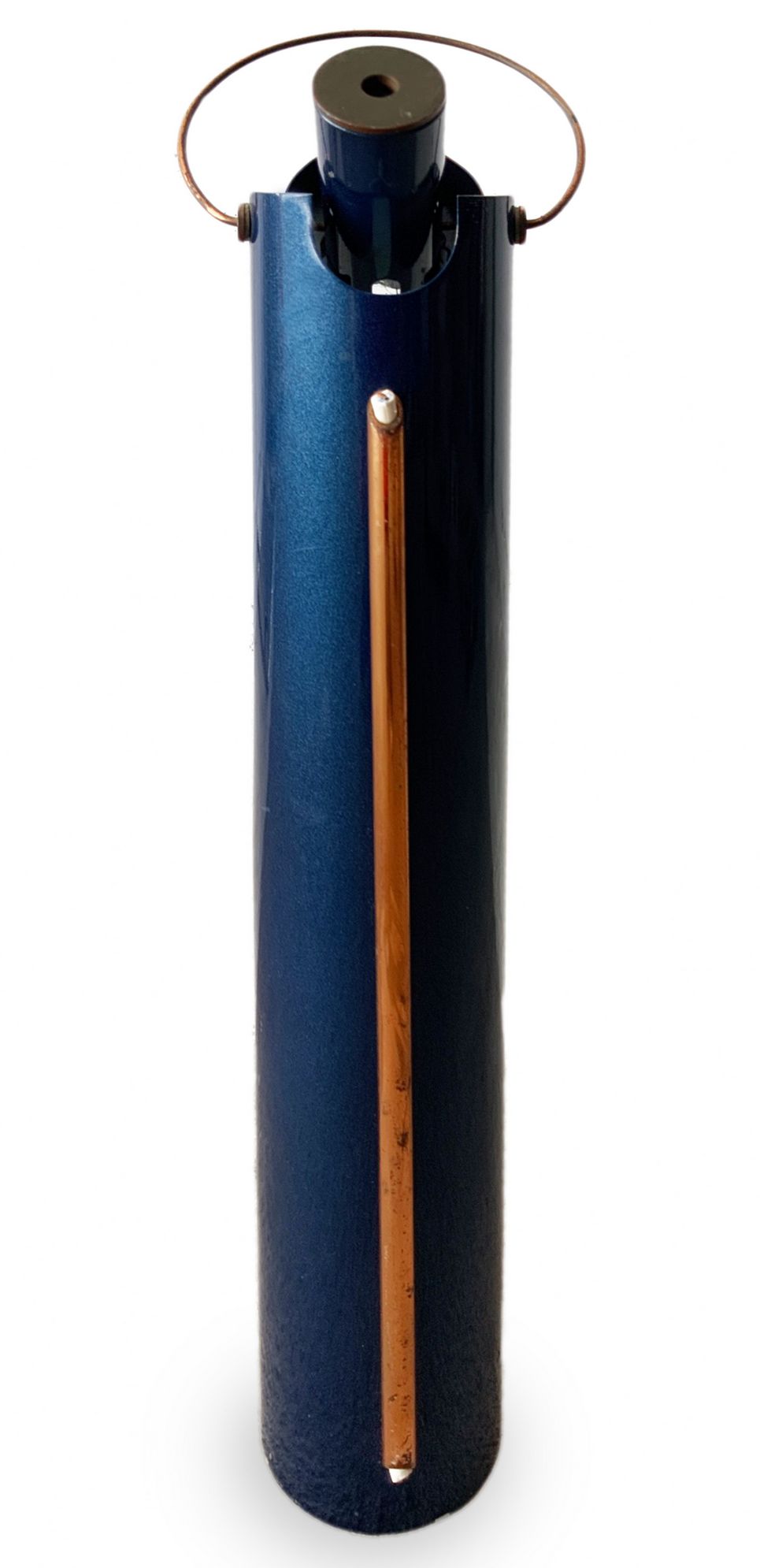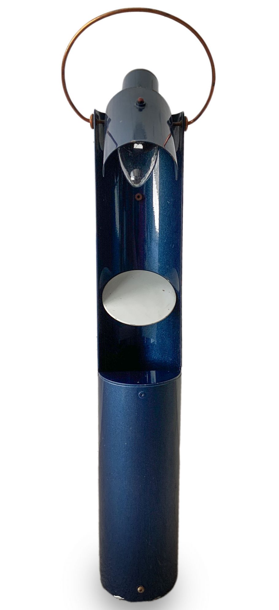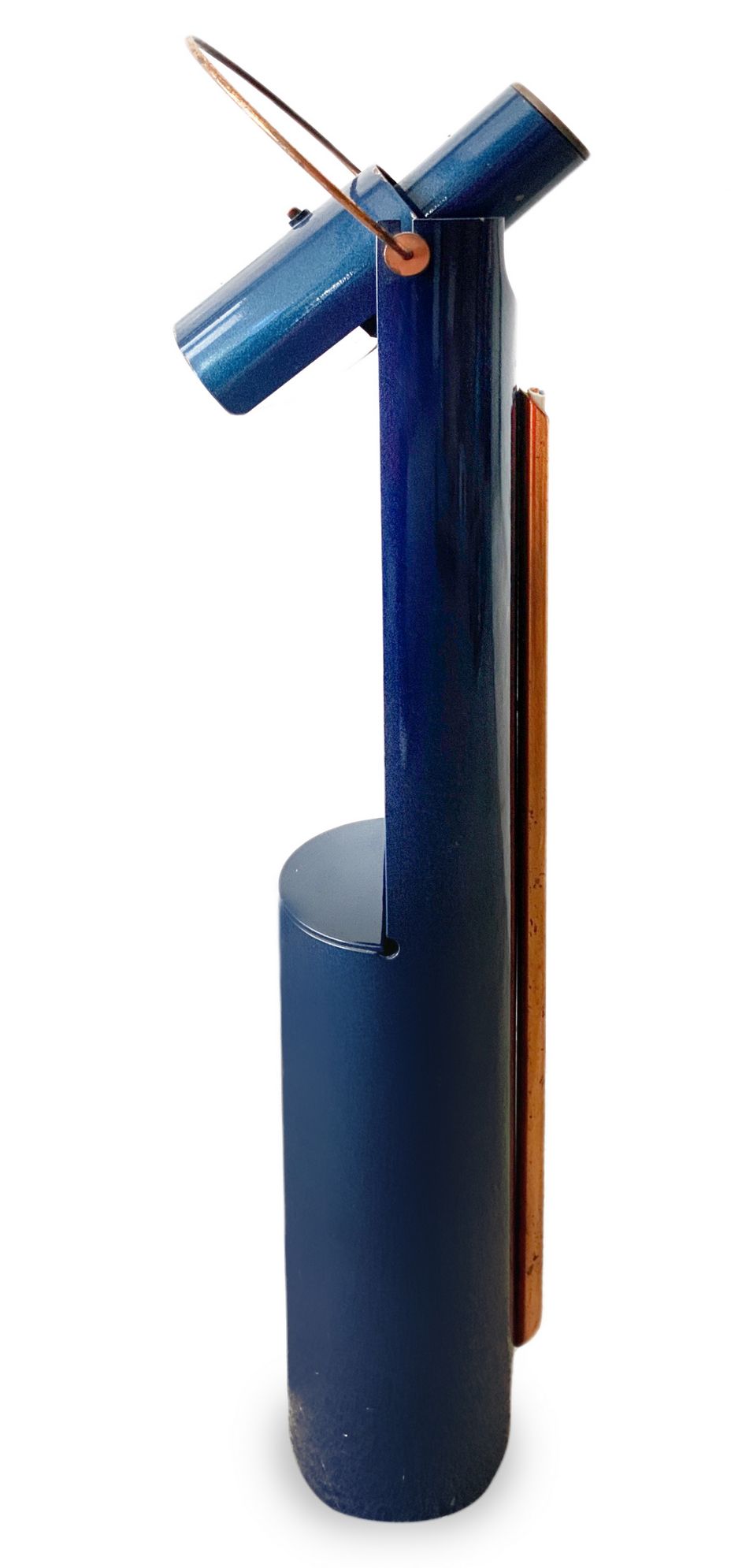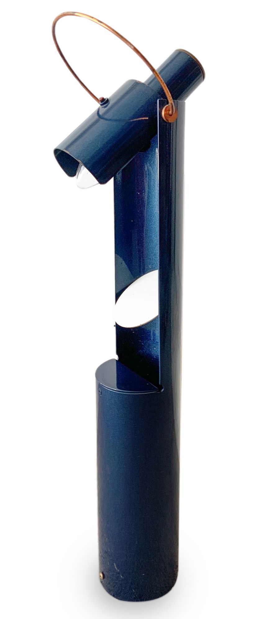 Lampada da tavolo, produzione italiana nello stile di Arredo Luce Monza, di forma cilindrica in metallo laccato nei toni del blu metallizzato, diffusore orientabile, da to be re-electrified. Anni 60. Cm 55x7