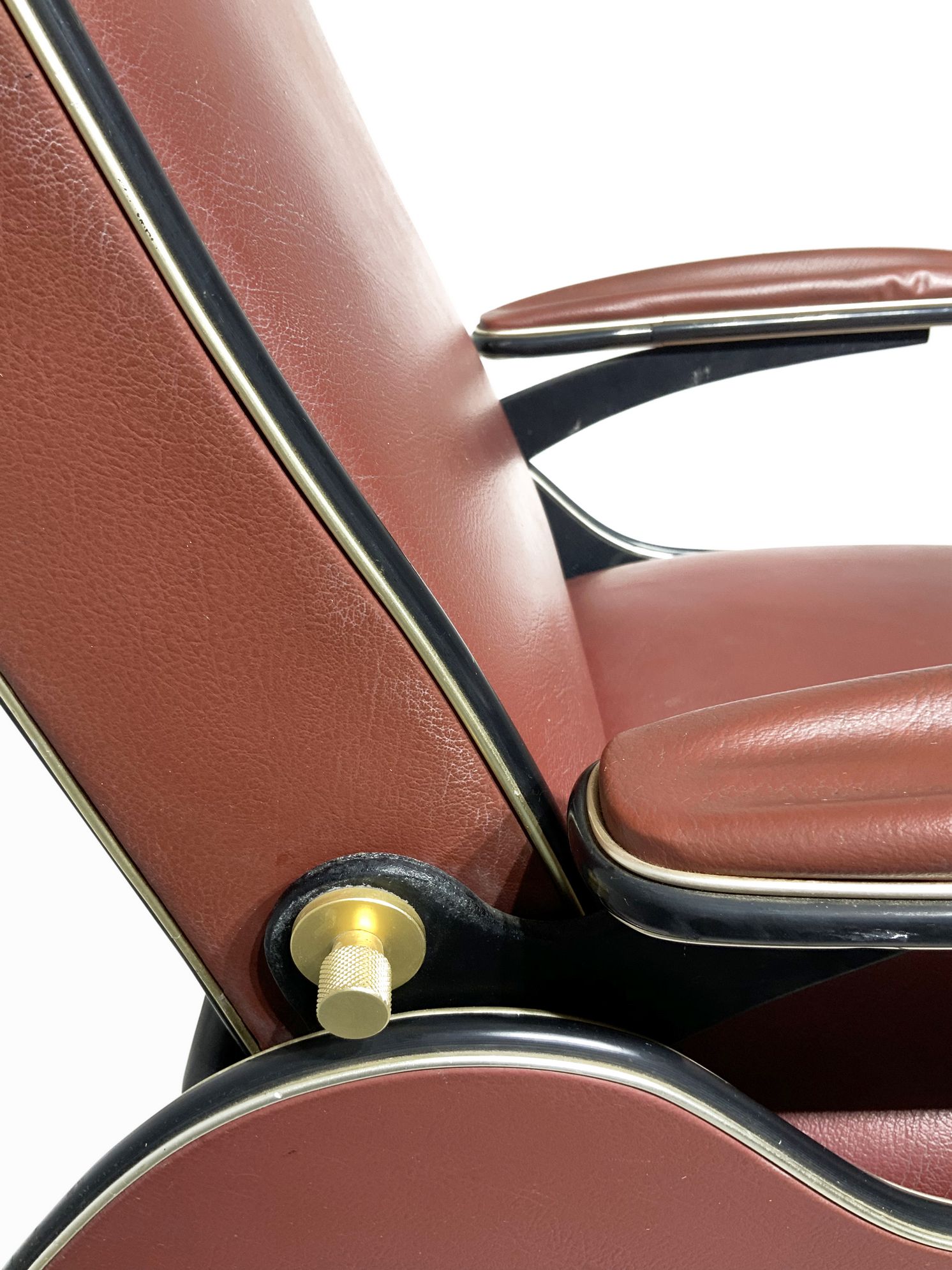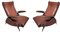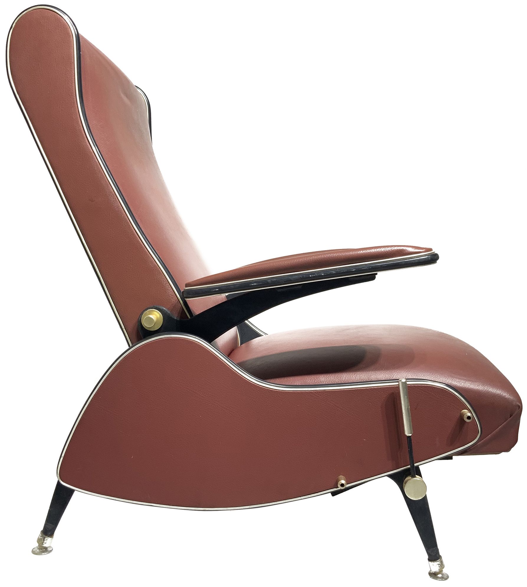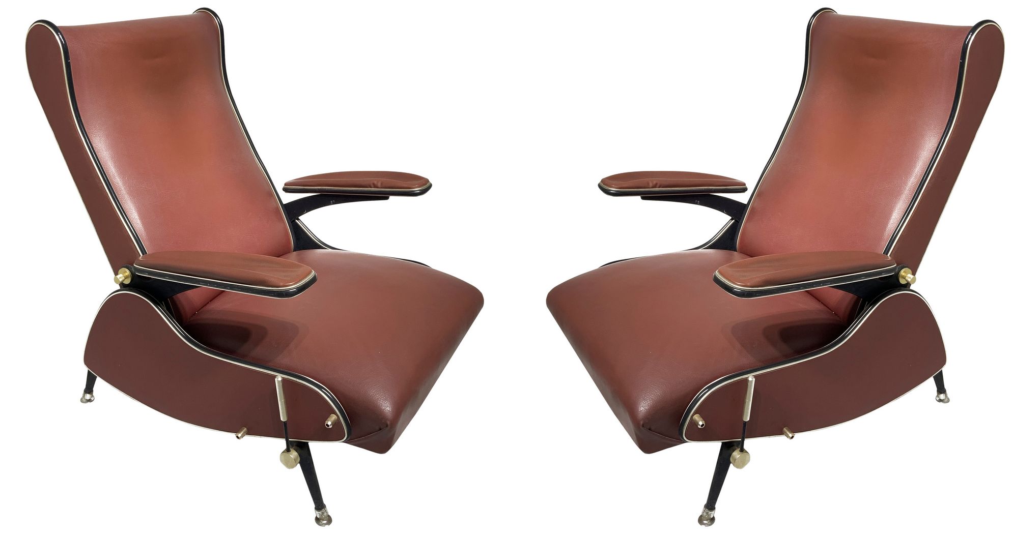 Mascagni. 1950s. Coppia di poltrone con struttura in metallo laccato, rivestimento in cielo, dettagli in ottone. 92x70x60.