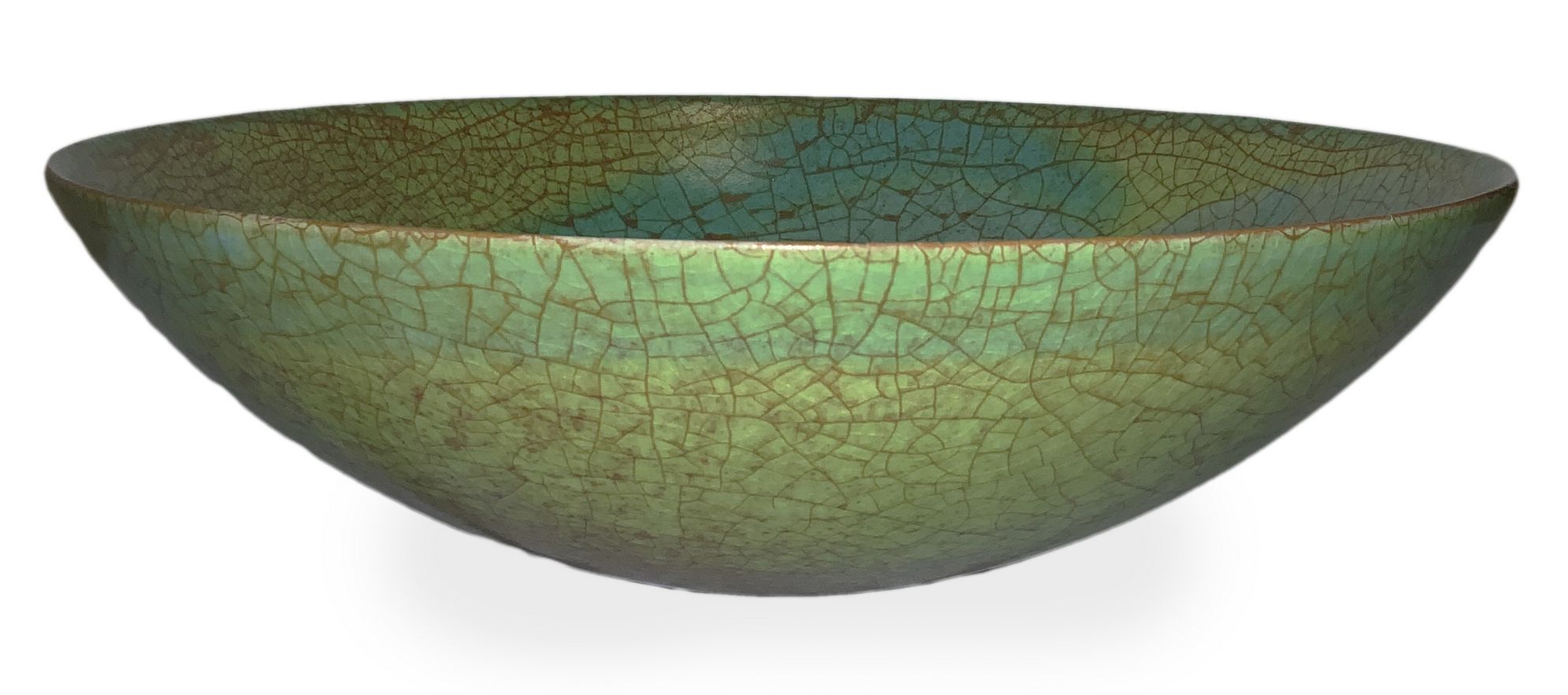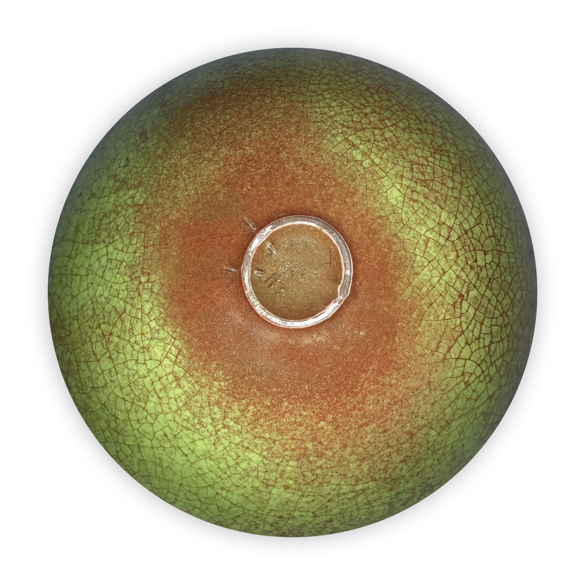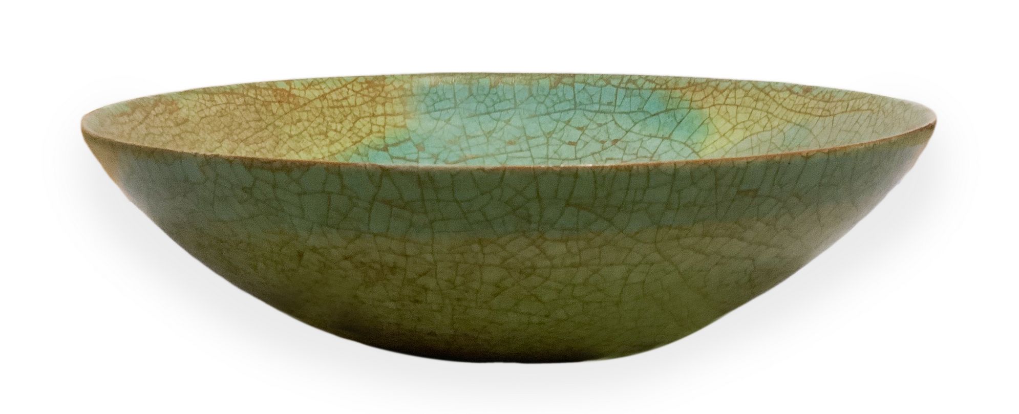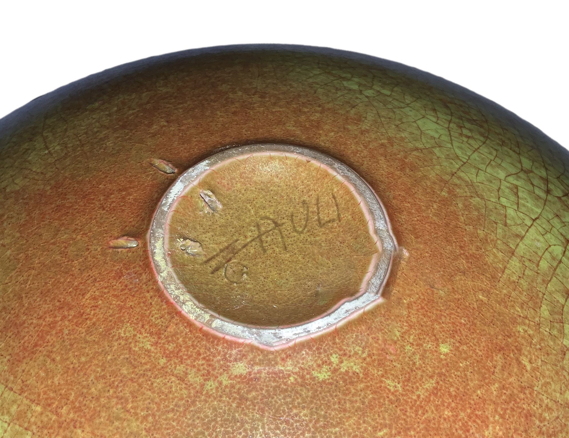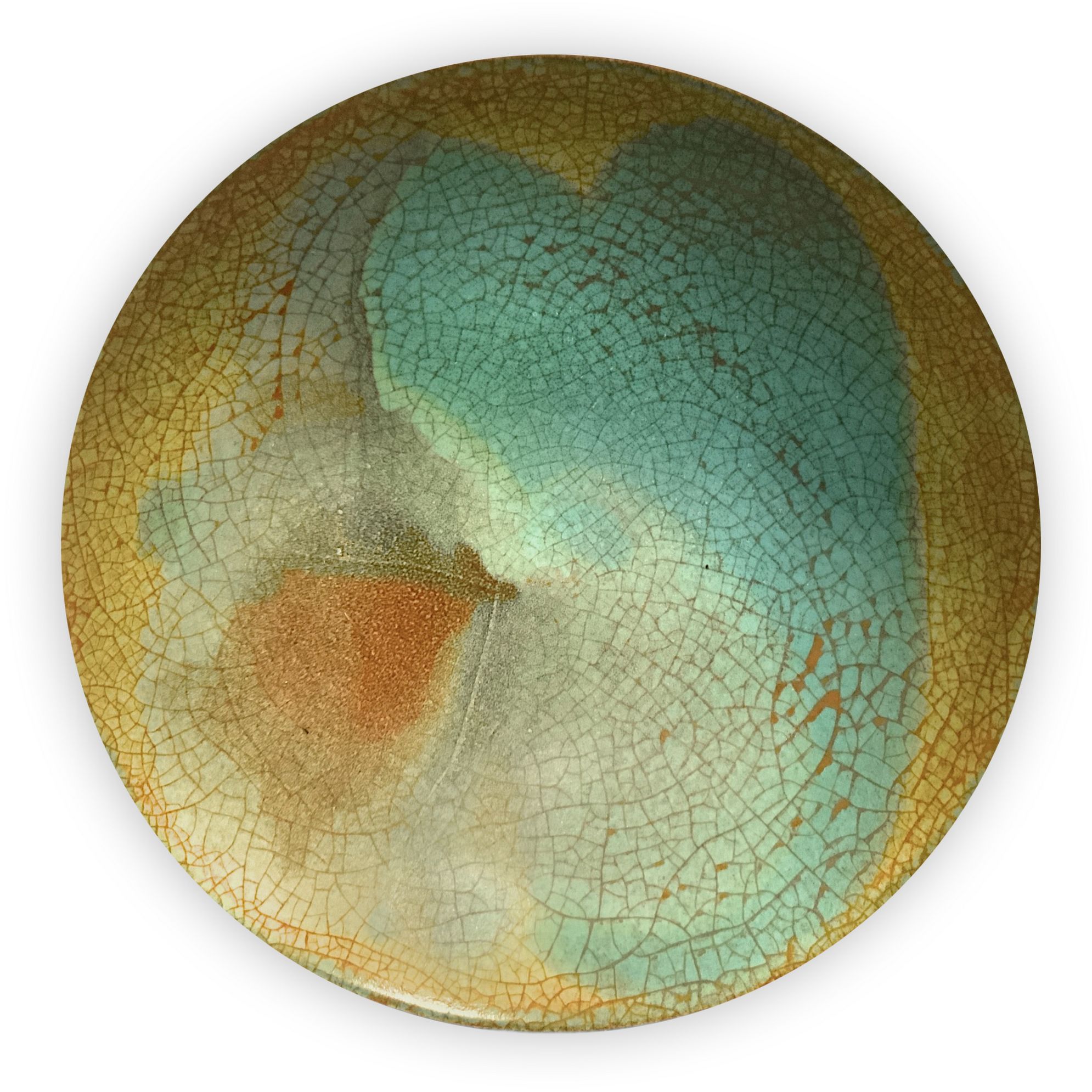 Carlo Zauli, centrotavola in ceramica smaltata con decoro policromo, informale nei toni del verde, dell'oro e del rosa, Firma alla base. Anni 60. H cm 13 Diam. Cm 29