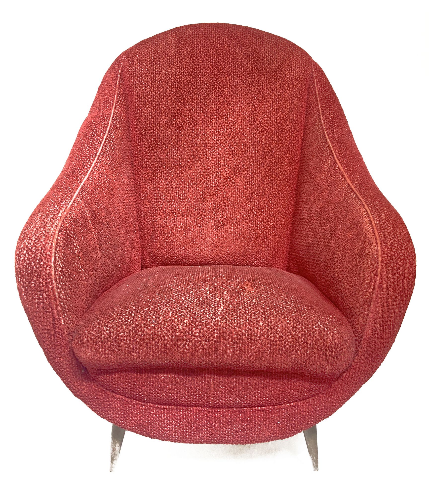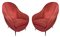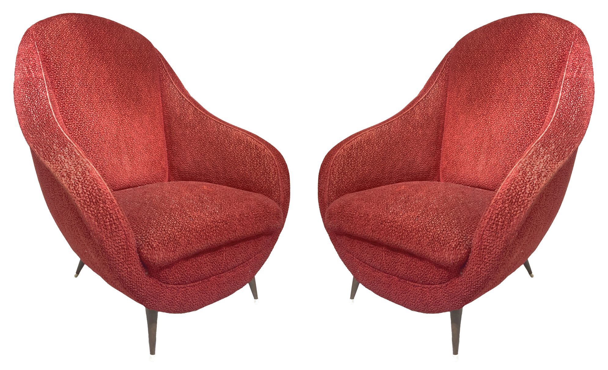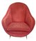 ISA Bergamo, coppia di poltrone, struttura in legno, piedi in ottone, rivestimento in orsetto rosso originale del periodo. Cm 90x66x70