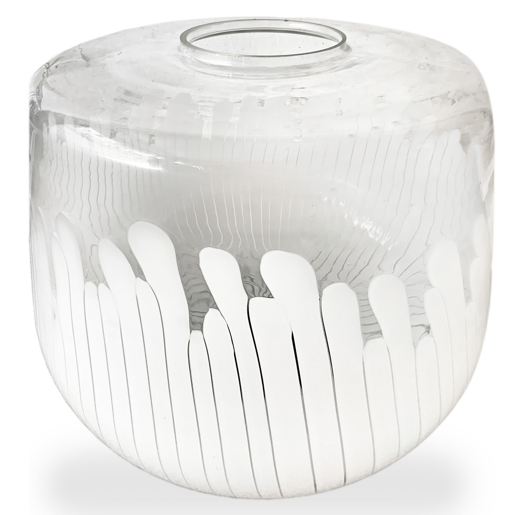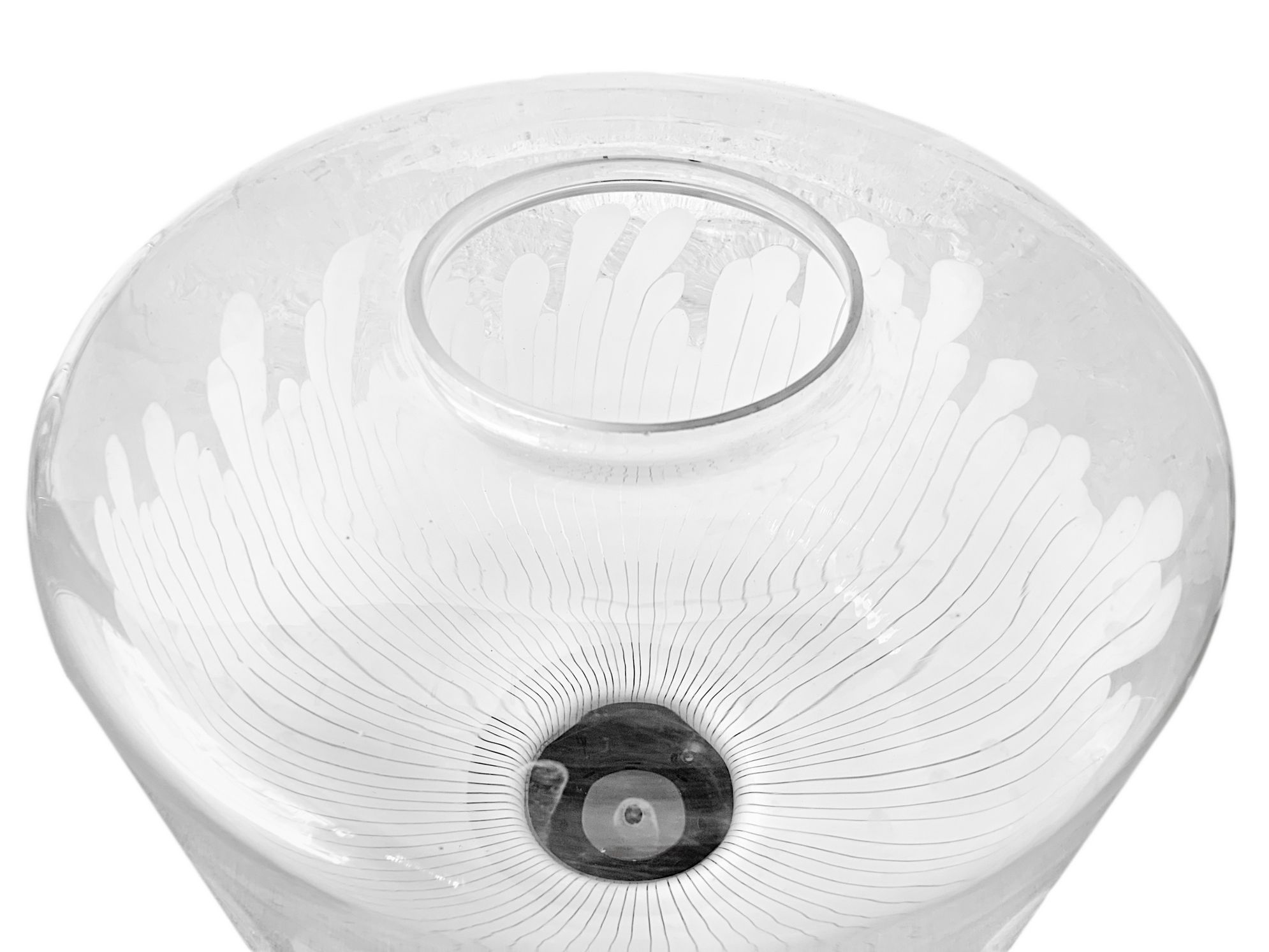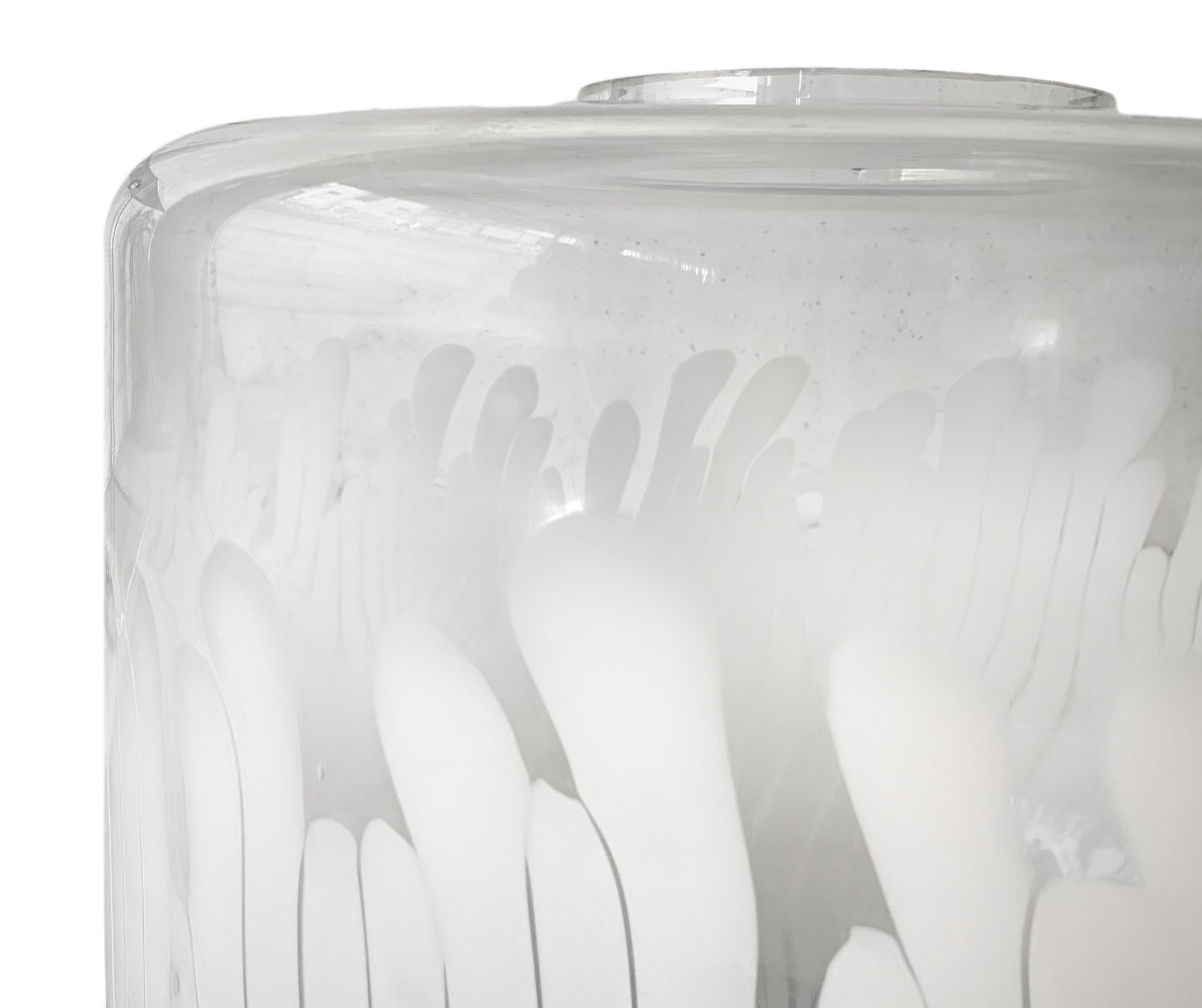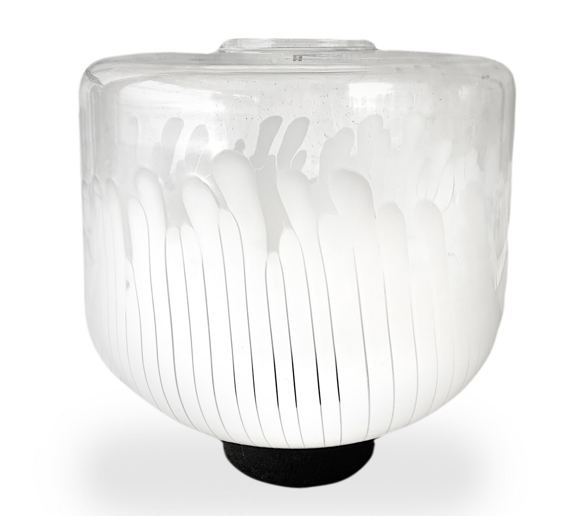 Venini Murano, disegno Laura Diaz De Santiliana, lampada da tavolo in vetro trasparente con applicazione di canne in pasta vitrea colore bianco ottime condizioni. Anni 60. Cm 40x 38.