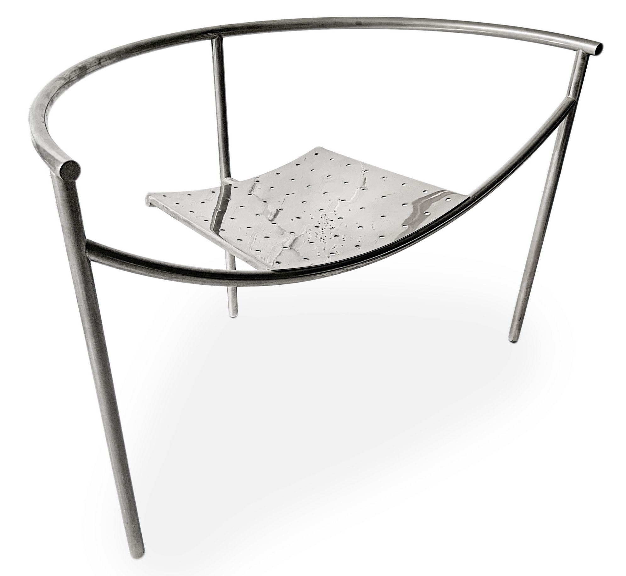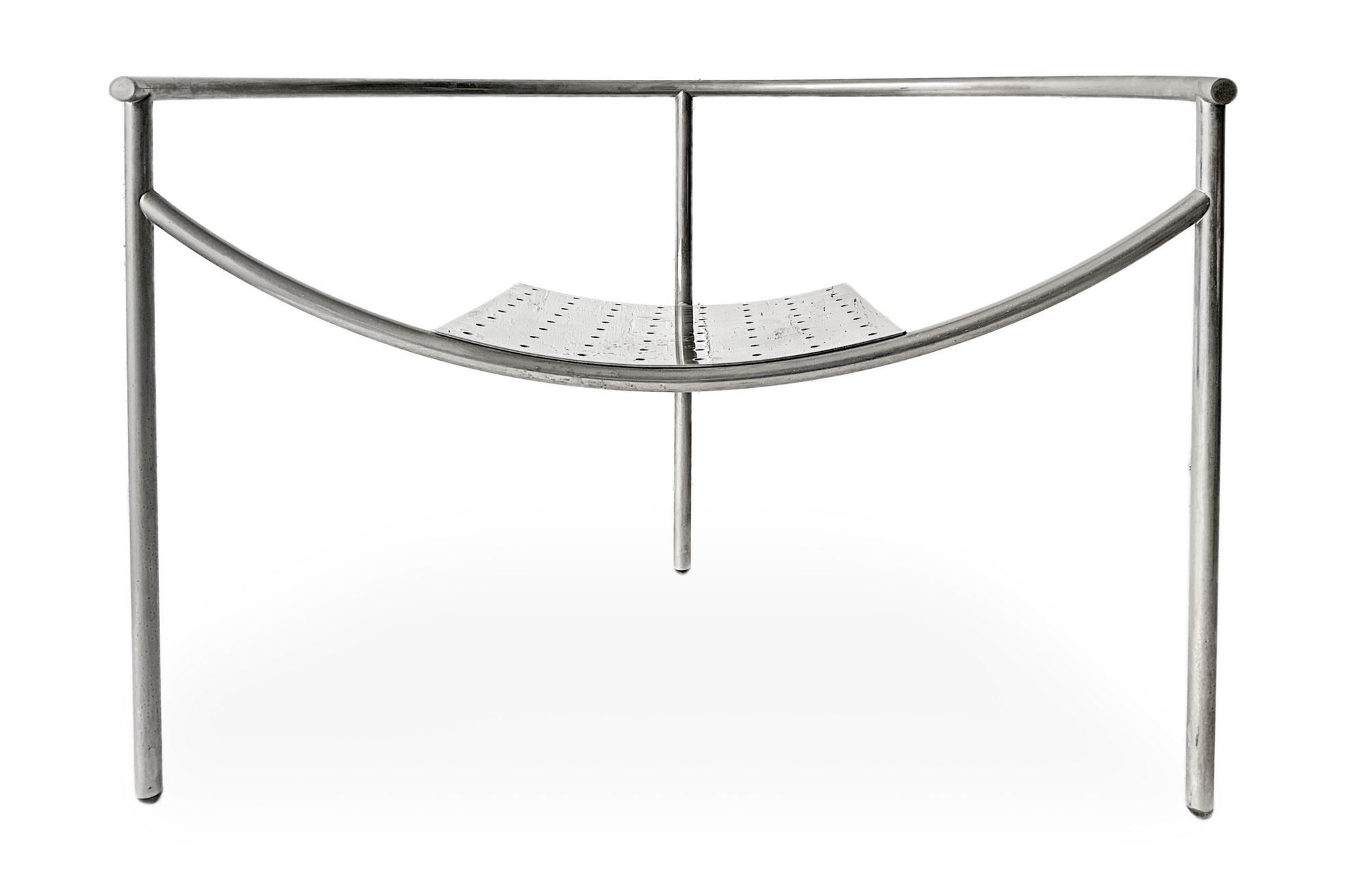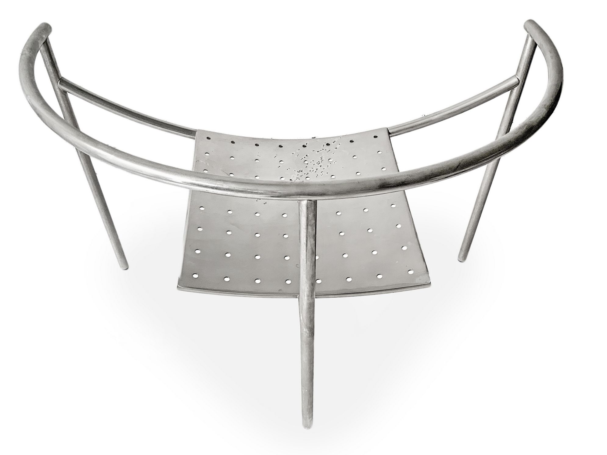 Atelier XO, disegno Philip Stark, modello Dottor Sondenbar, sedia con struttura in tubo metallico cromato seduta in metallo forato. Anni 80. Segni di ossidazione. Cm 64x91x43