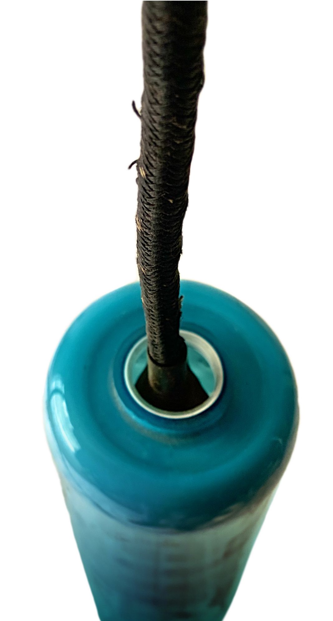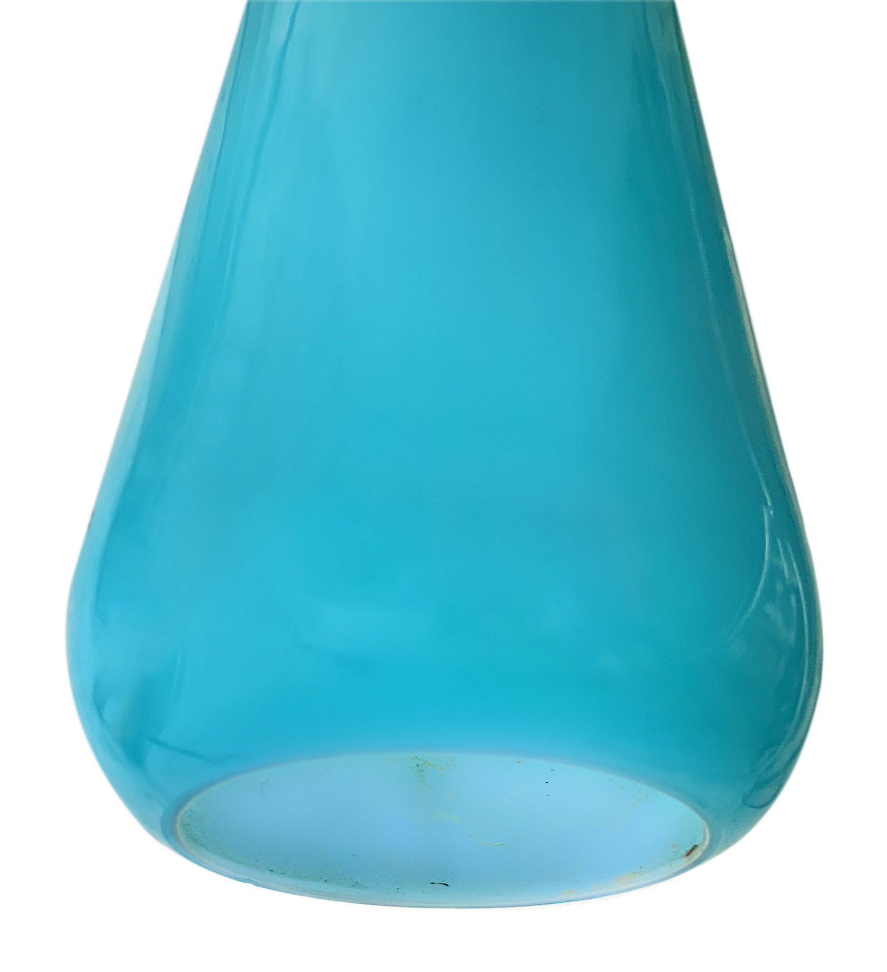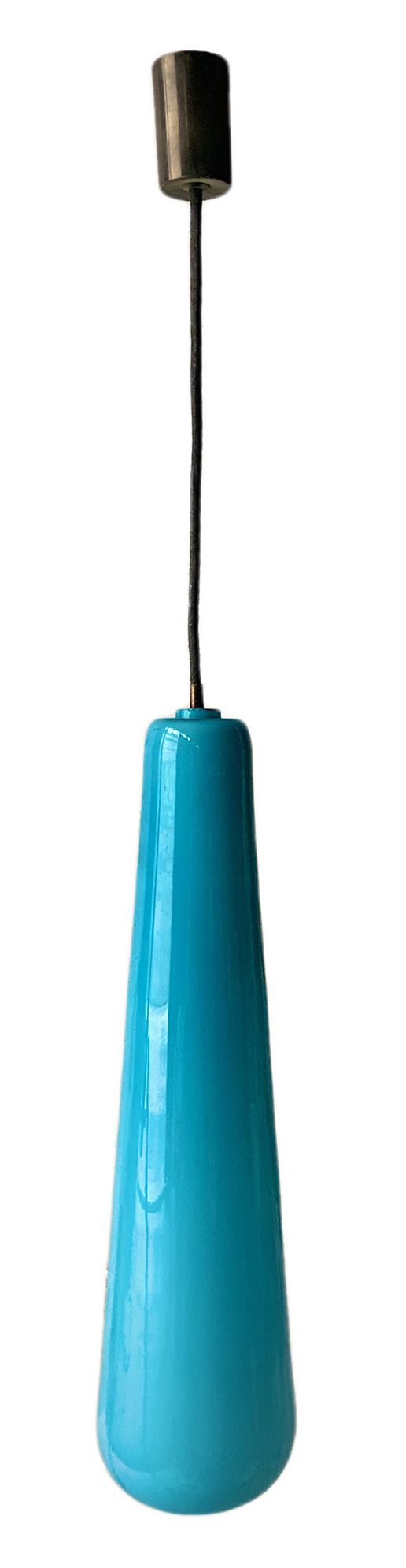 Vistosi Murano, disegno Gino vistosi, lampada a sospensione di forma conica in vetro incamiciato nei toni dell'azzurro dettagli in ottone. Anni 60. Cm 50x11