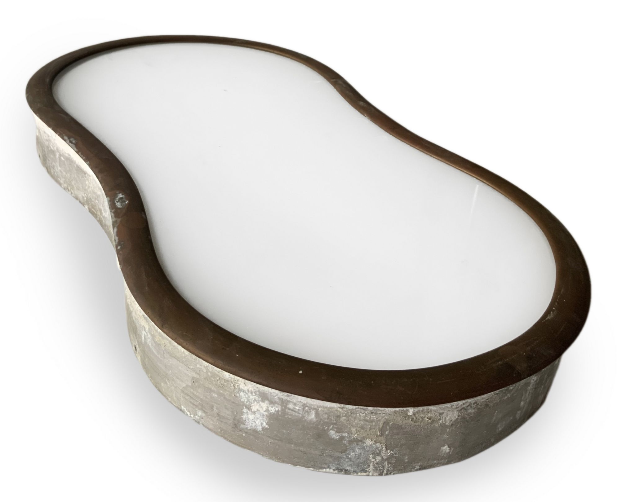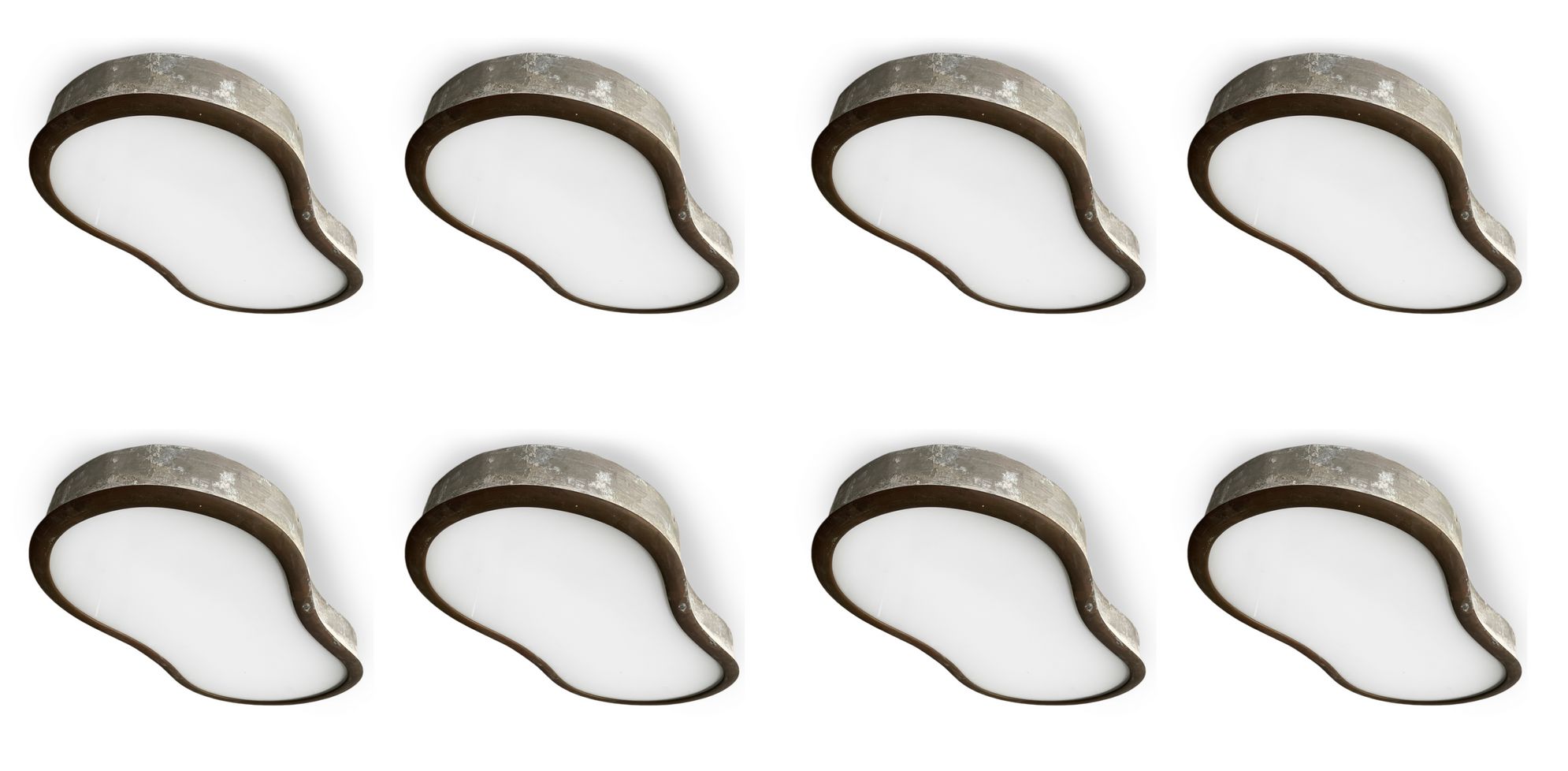 Gruppo di 8 lampade a plafone produzione italiana. Con struttura in ottone e diffusore in vetro opalino. Anni 40. Una presenta filatura al diffusore.