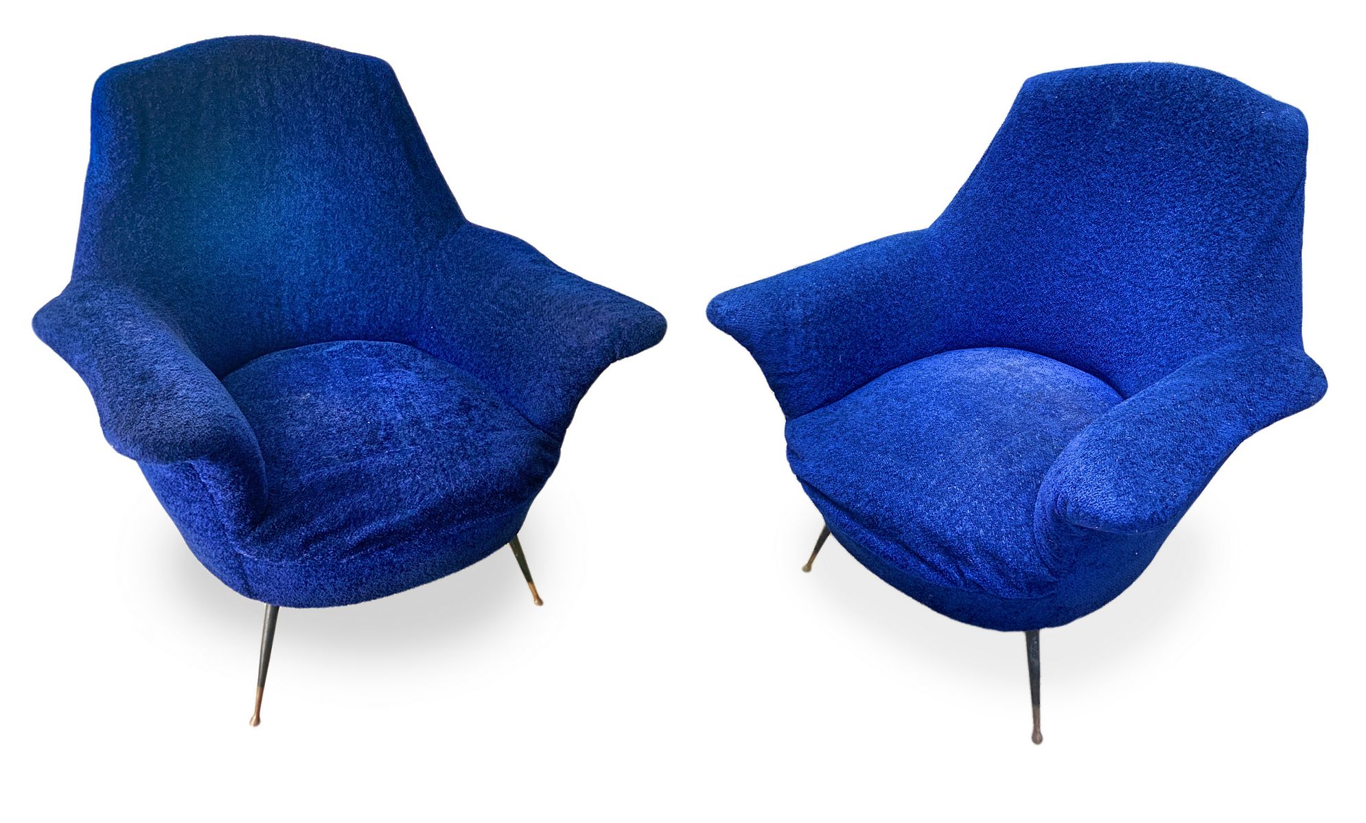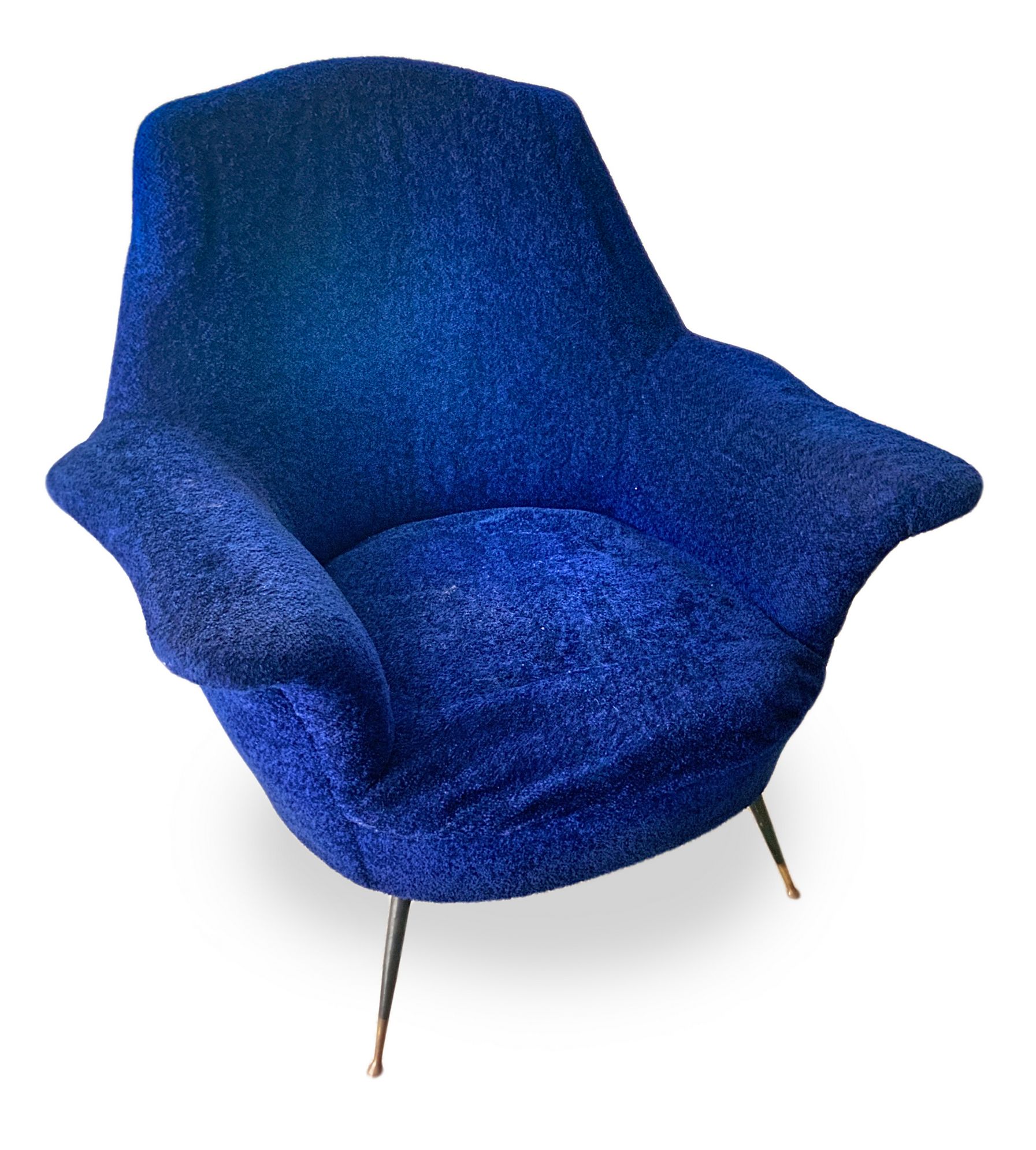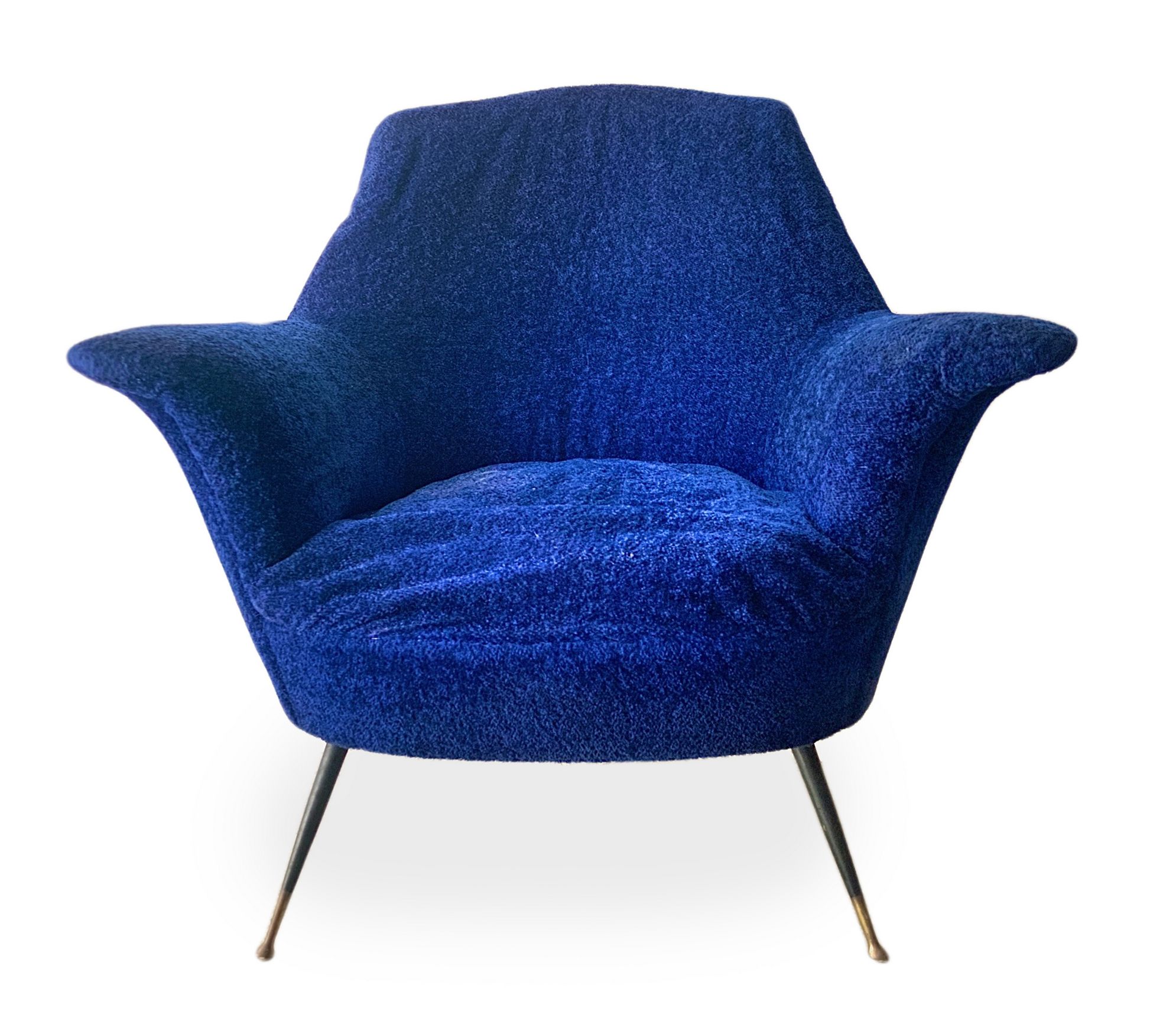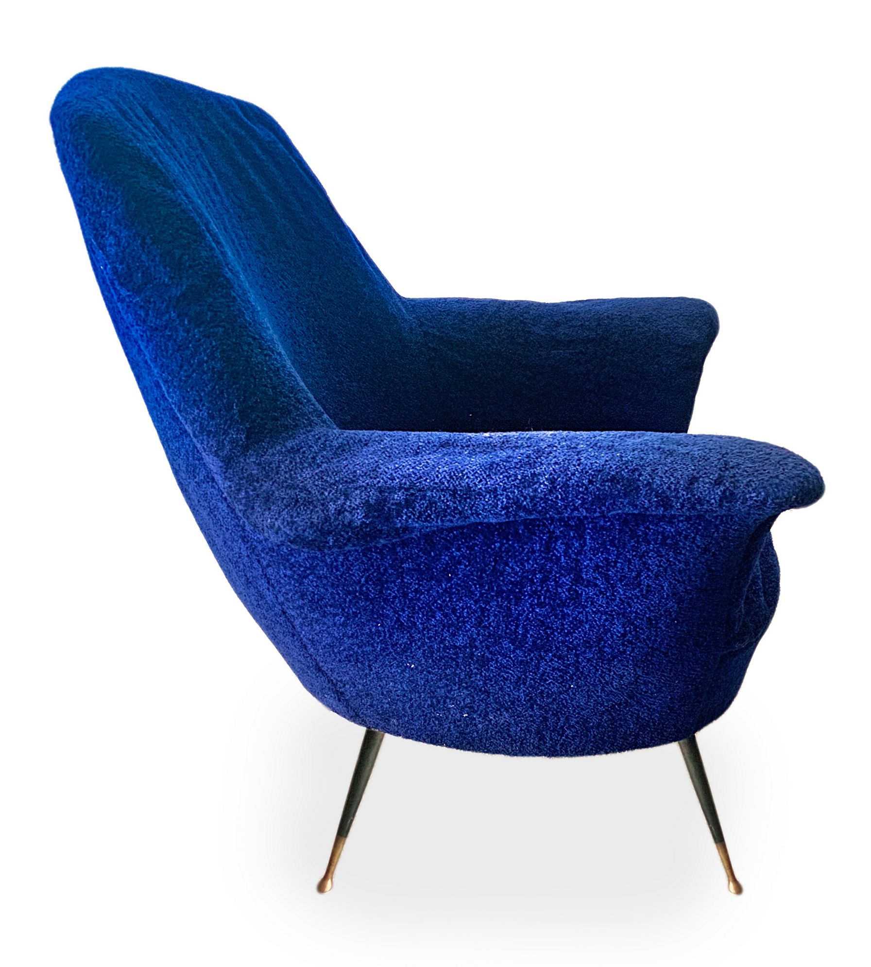 Coppia di poltrone con struttura in legno, produzione italiana. Rivestimento originale del periodo in orsetto colore blu elettrico piedi in ottone. Anni 50. Cm 95x85x60