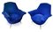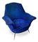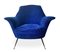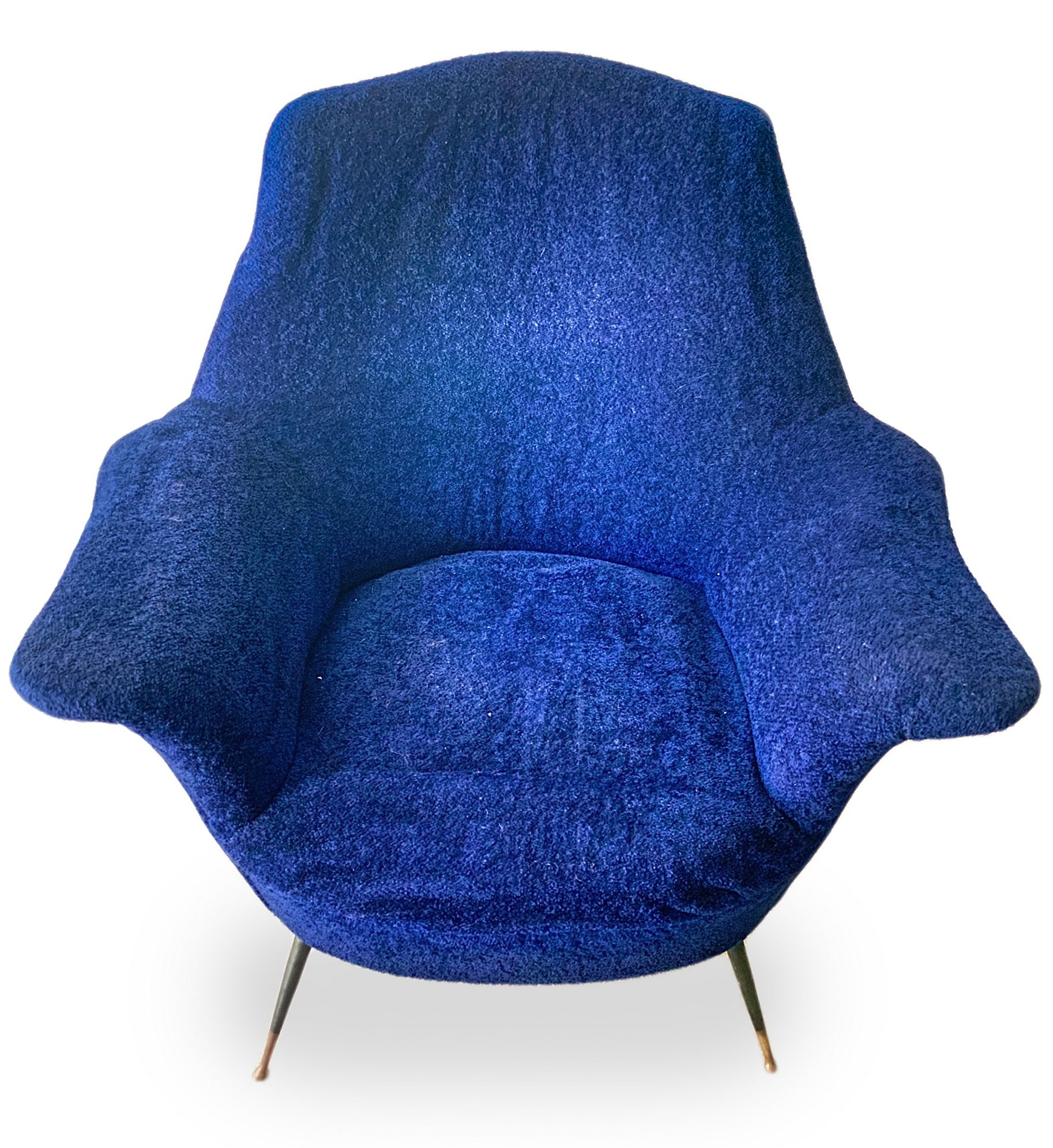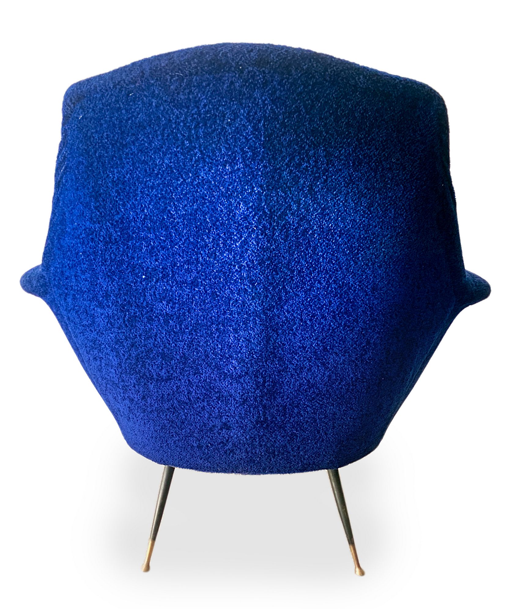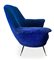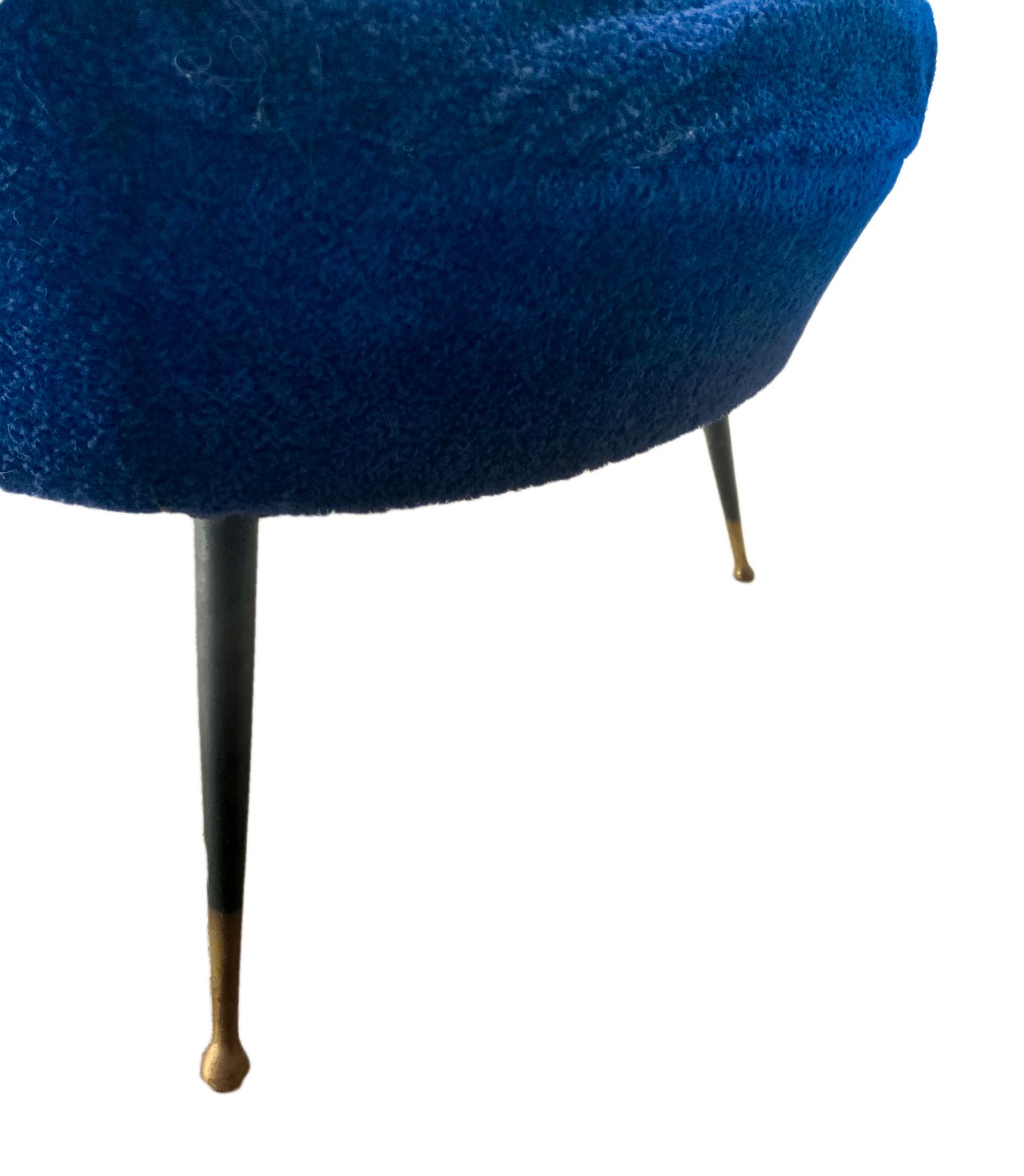 Coppia di poltrone con struttura in legno, produzione italiana. Rivestimento originale del periodo in orsetto colore blu elettrico piedi in ottone. Anni 50. Cm 95x85x60