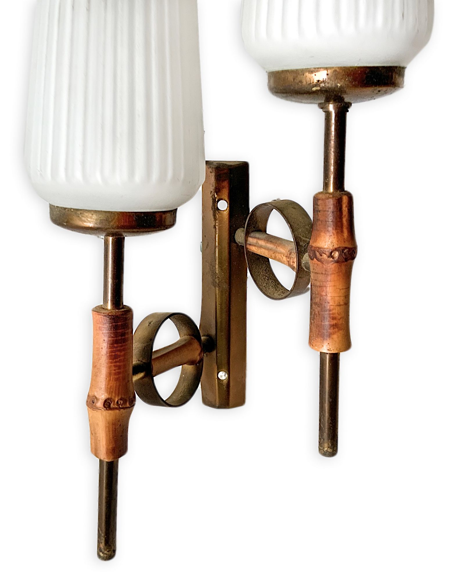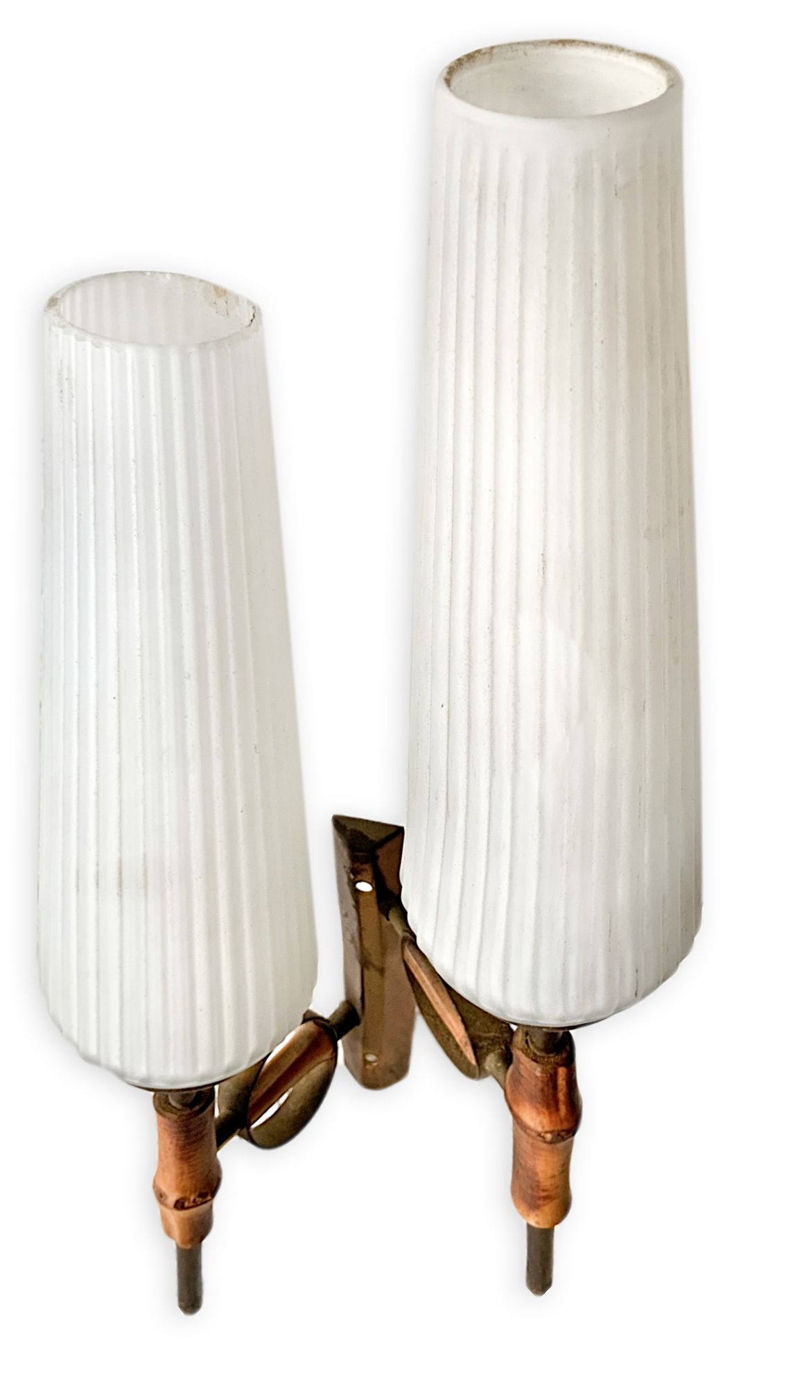 Applique, produzione italiana. Struttura in ottone, diffusore in vetro opalino bianco, dettagli in bambù, Anni 50. Cm 35x10x10. Segni di uso.
