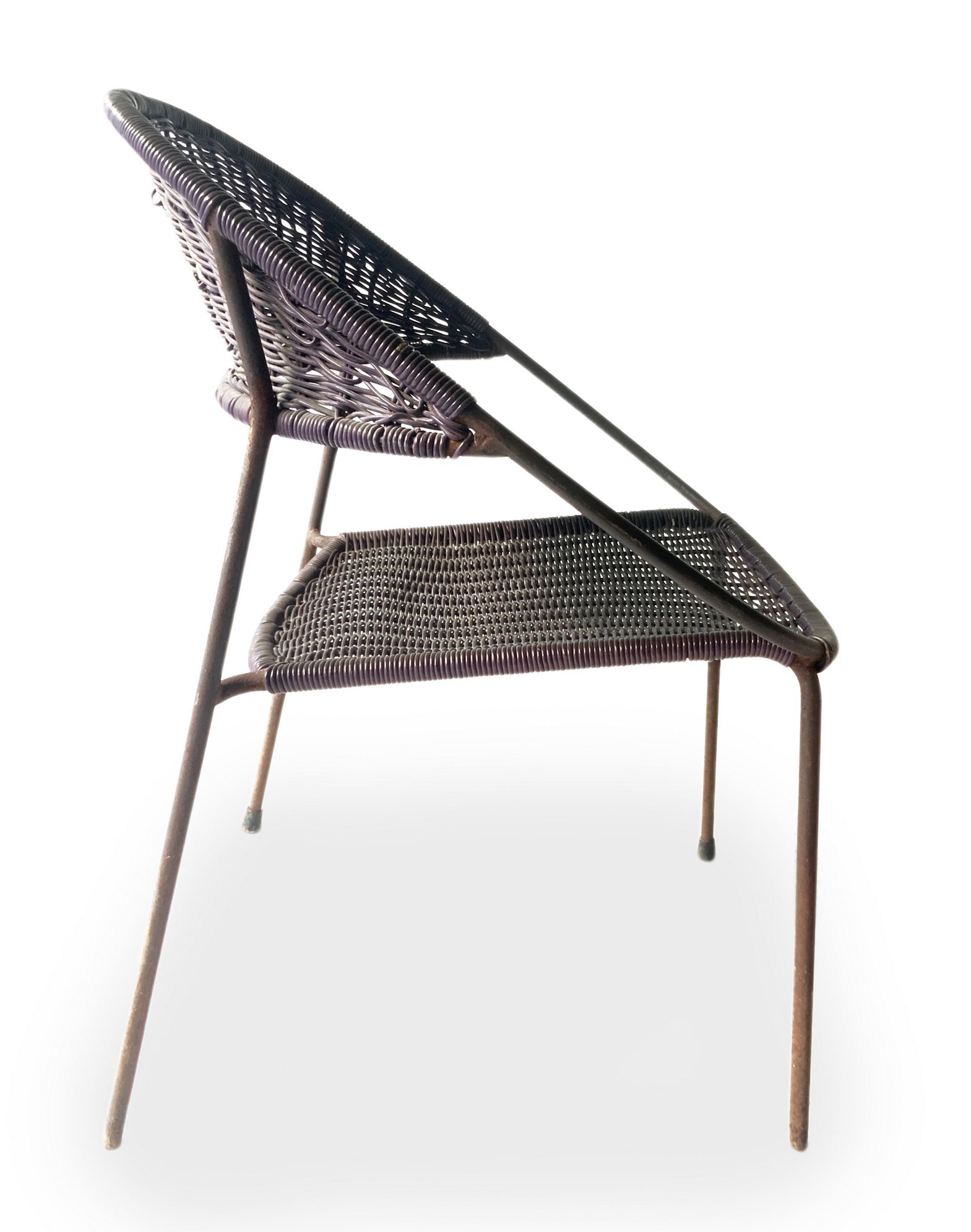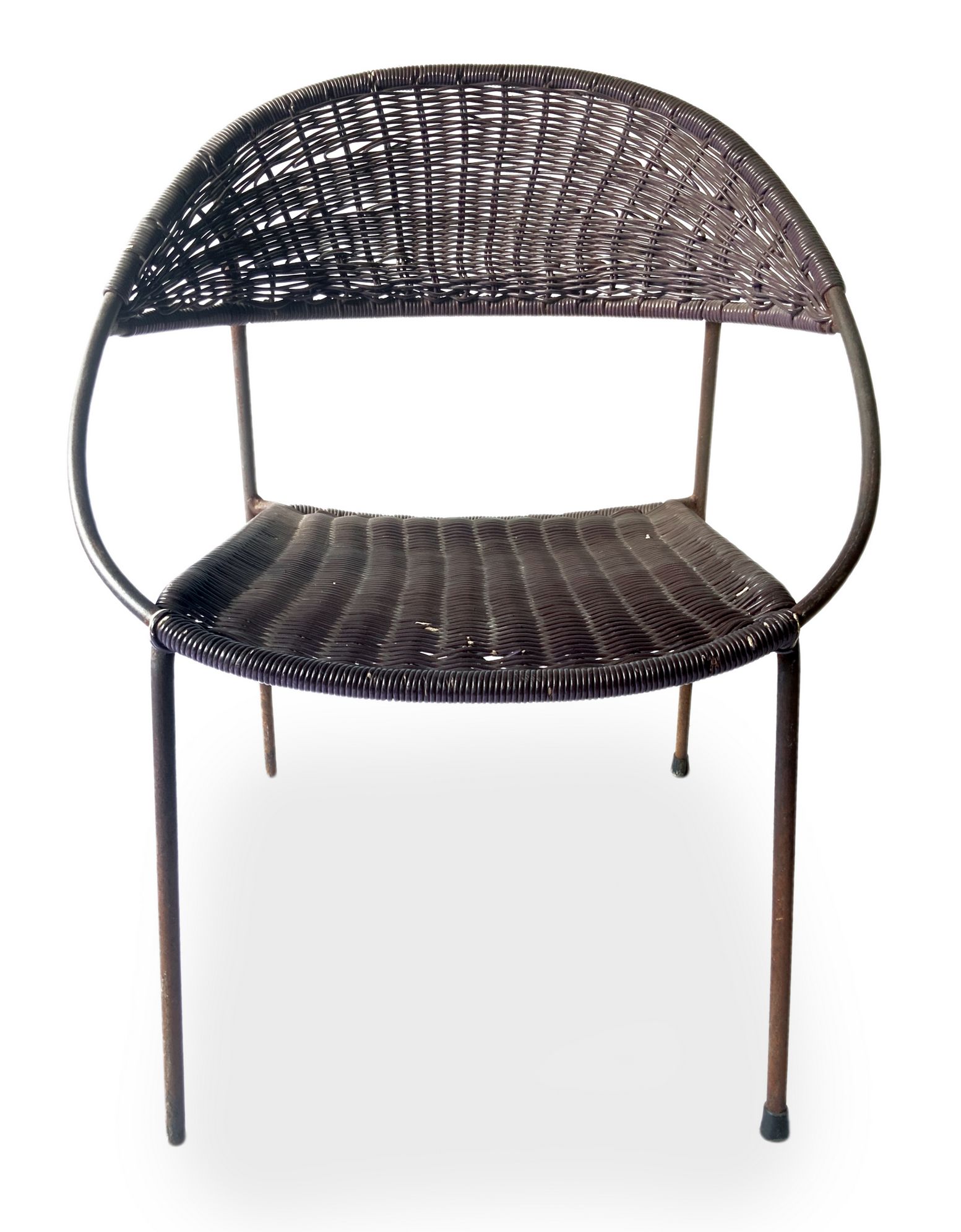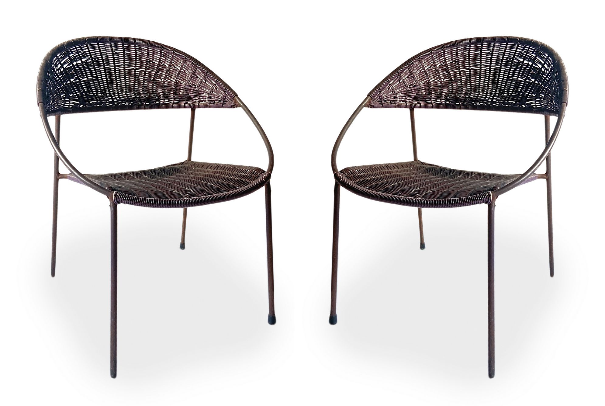 Rima, disegno Gastone Rinaldi, modello DU41 coppia di sedie struttura in tondino metallico laccato nero. Seduta ottenuta mediante intreccio di filo plastico. Anni 50. Segni di uso, ossidazioni. Cm 80 x 57x55