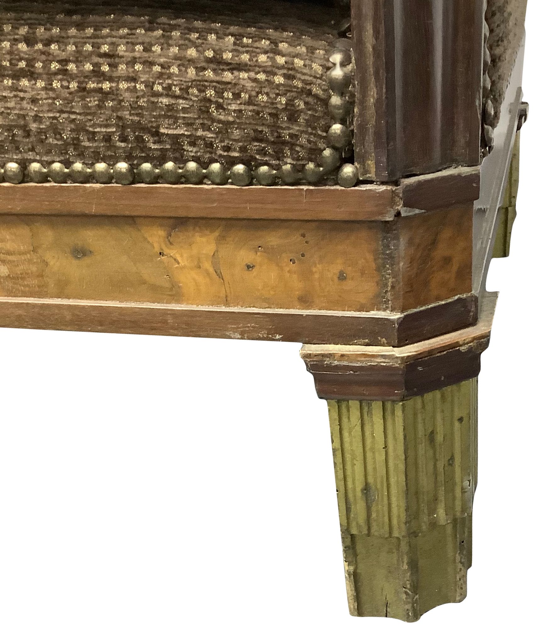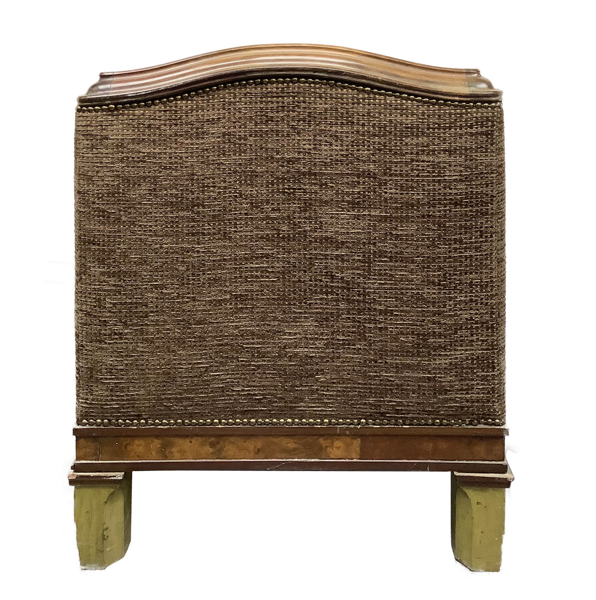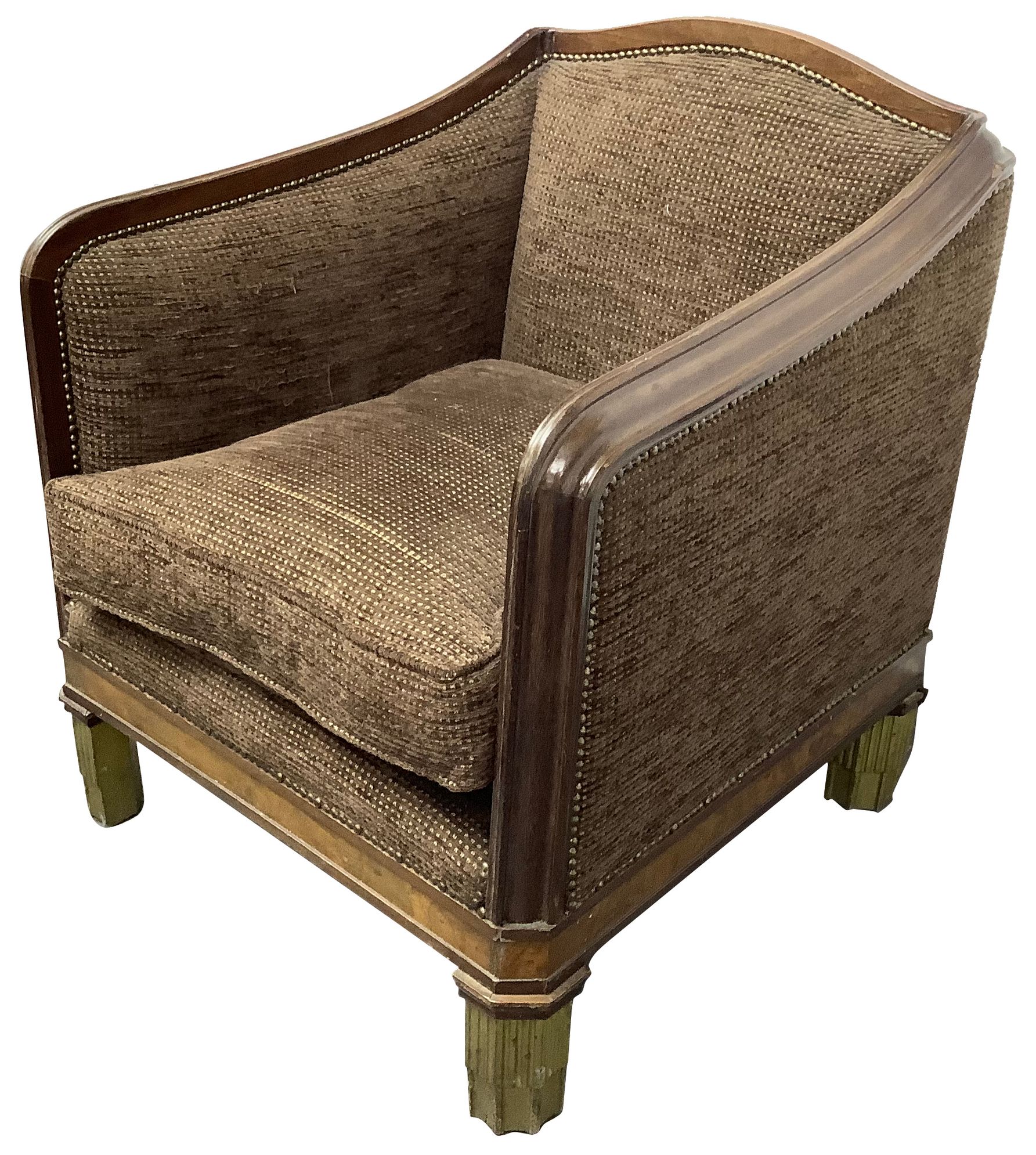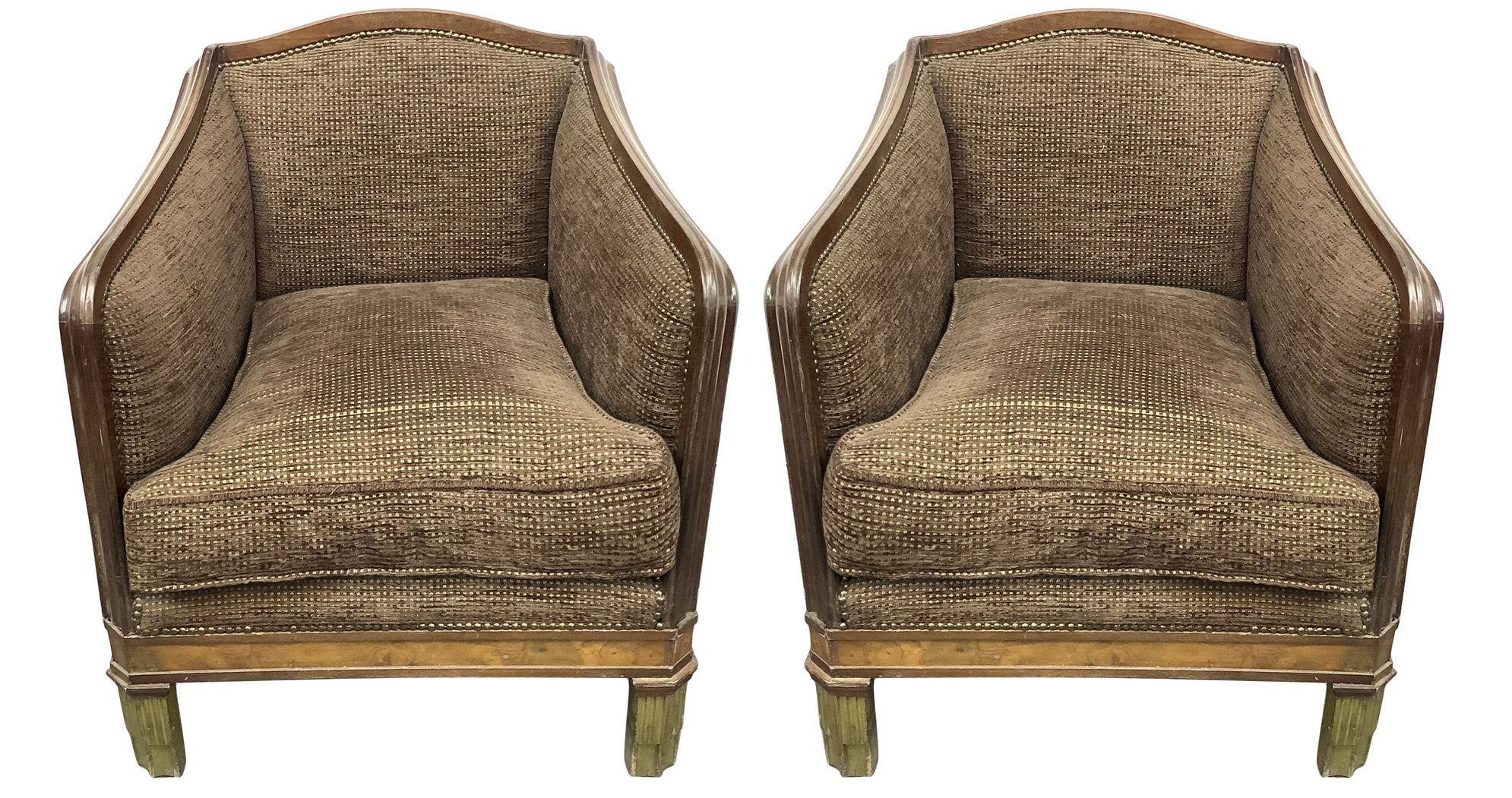Coppia di poltrone nello stile di Gino Maggioni probabile prod. Atelier Bursani, anni’30. Struttura in legno di noce, Rivestimento in tessuto originale del periodo. Piedi in legno dorato. H Cm 80x65x70