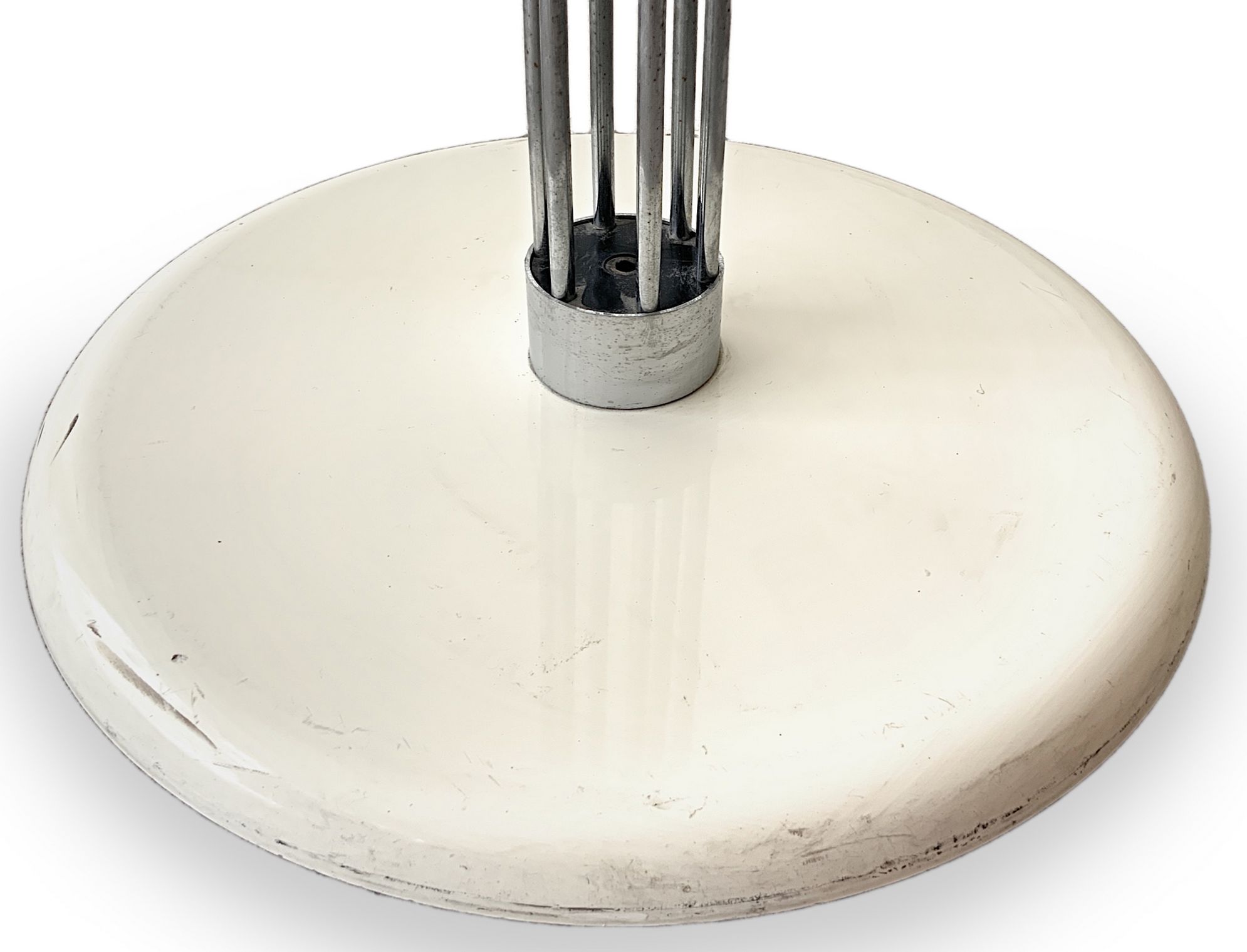 Valenti, Milano, appendiabiti in metallo cromato con base in ghisa laccata colore beige. Anni '70. H cm 161. Diametro base cm 47. Segni di uso.