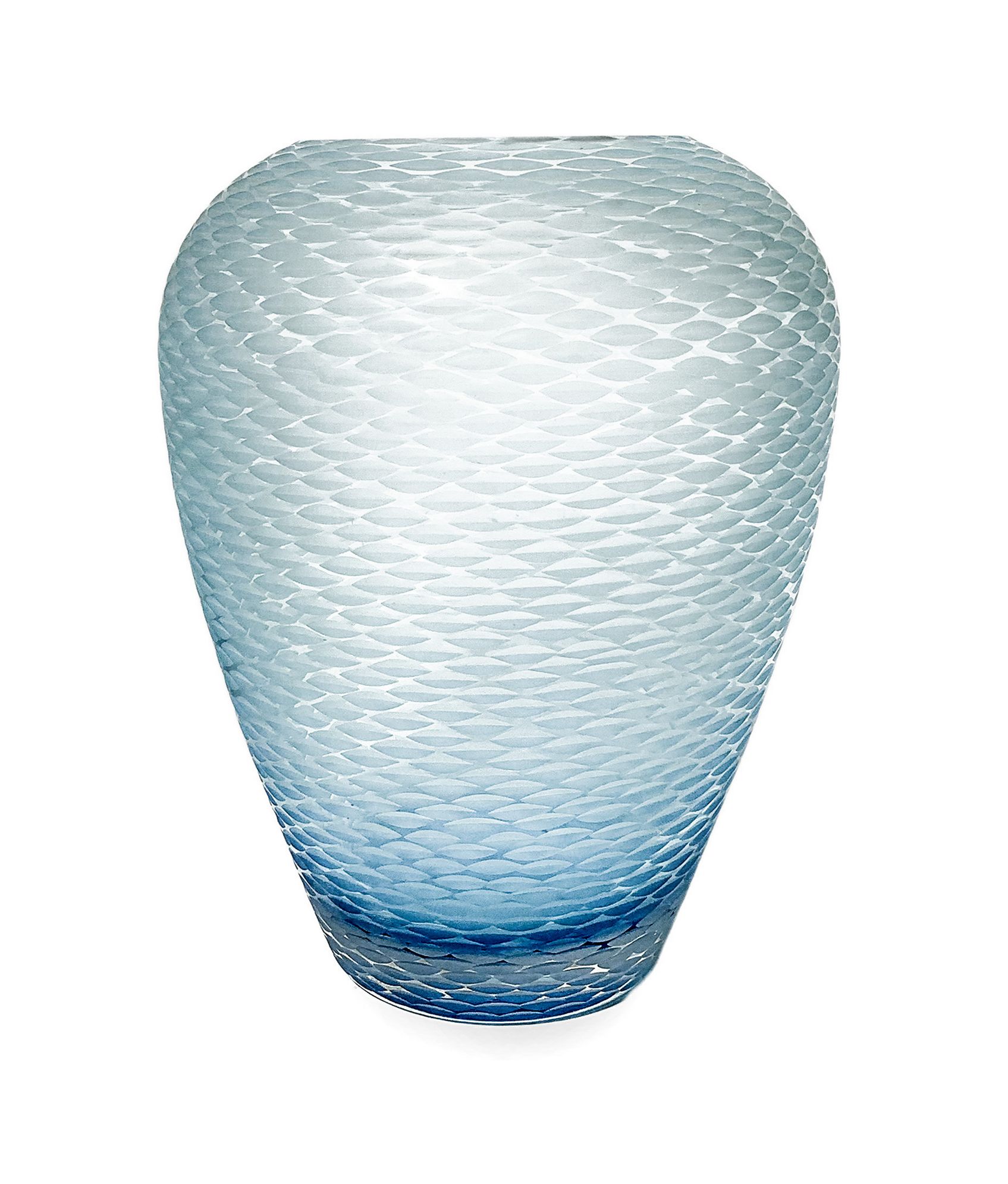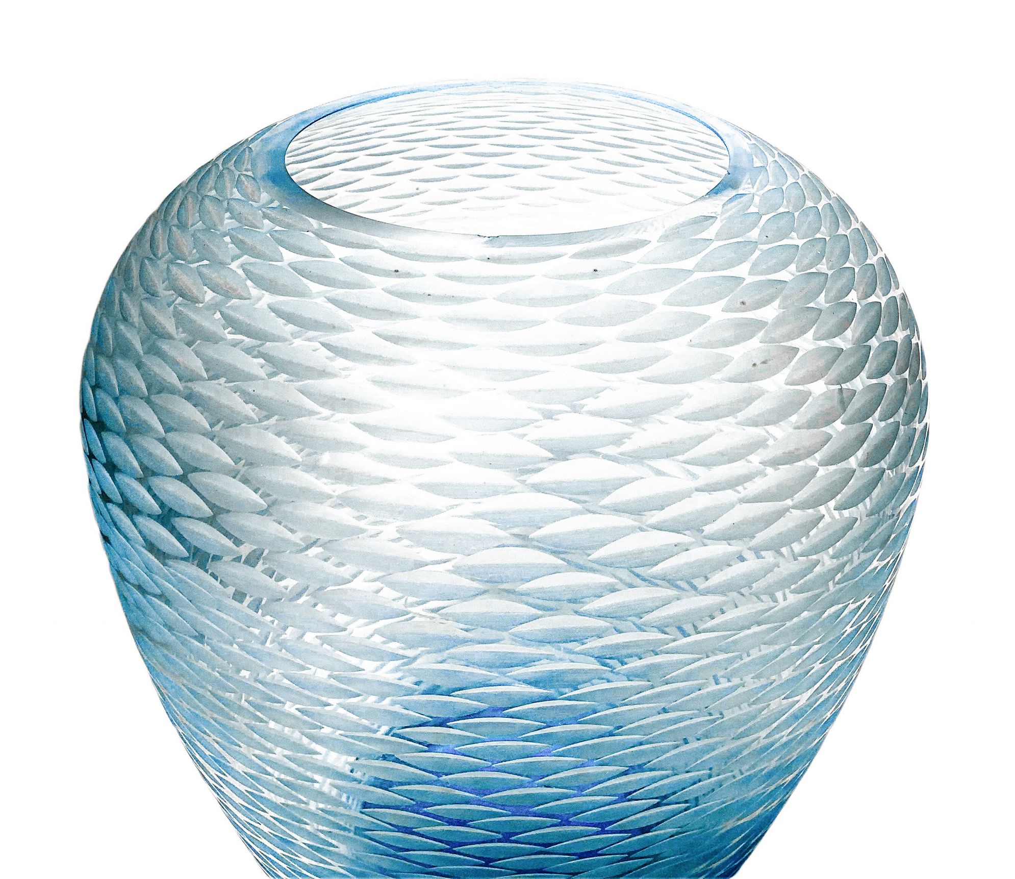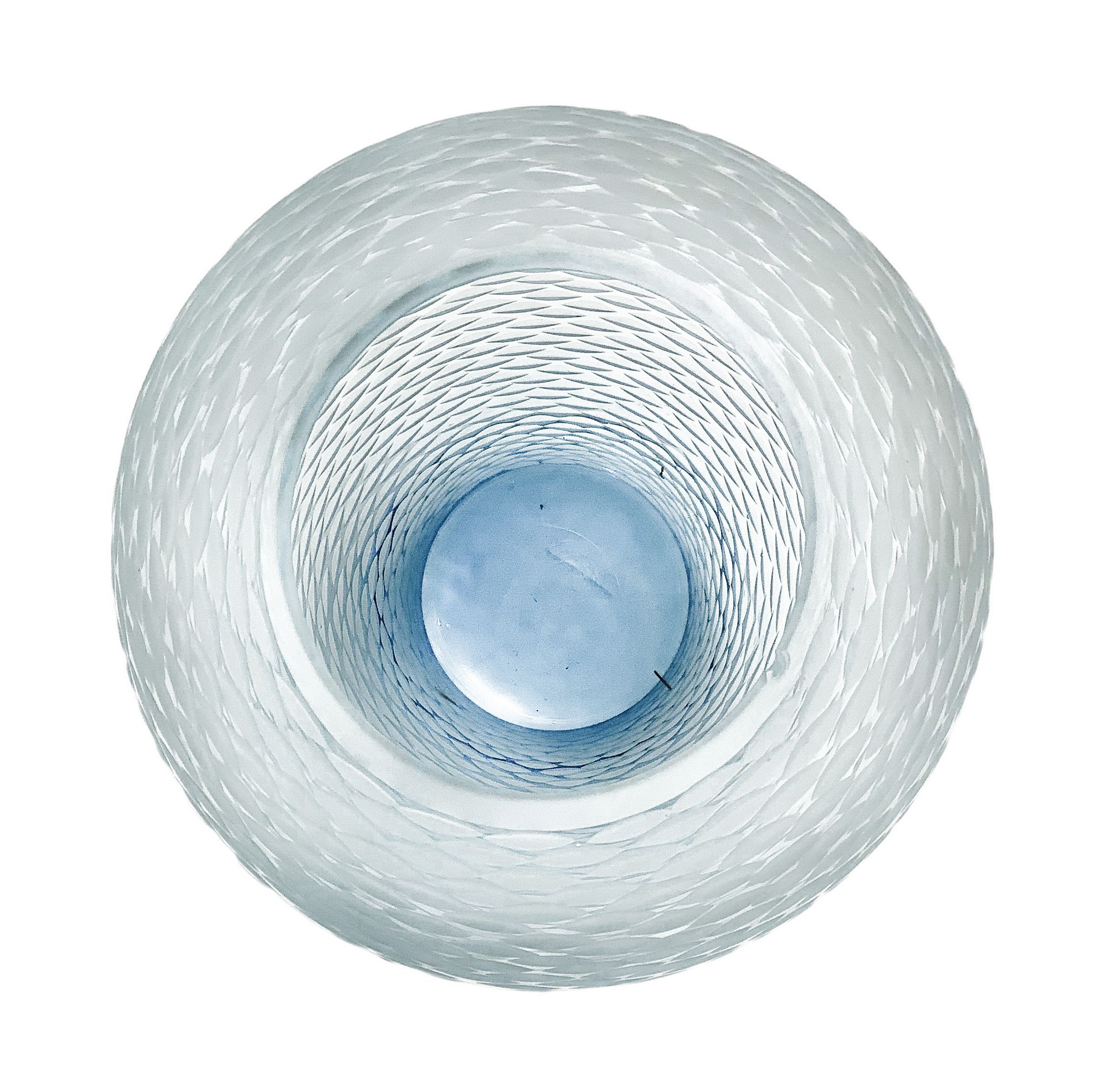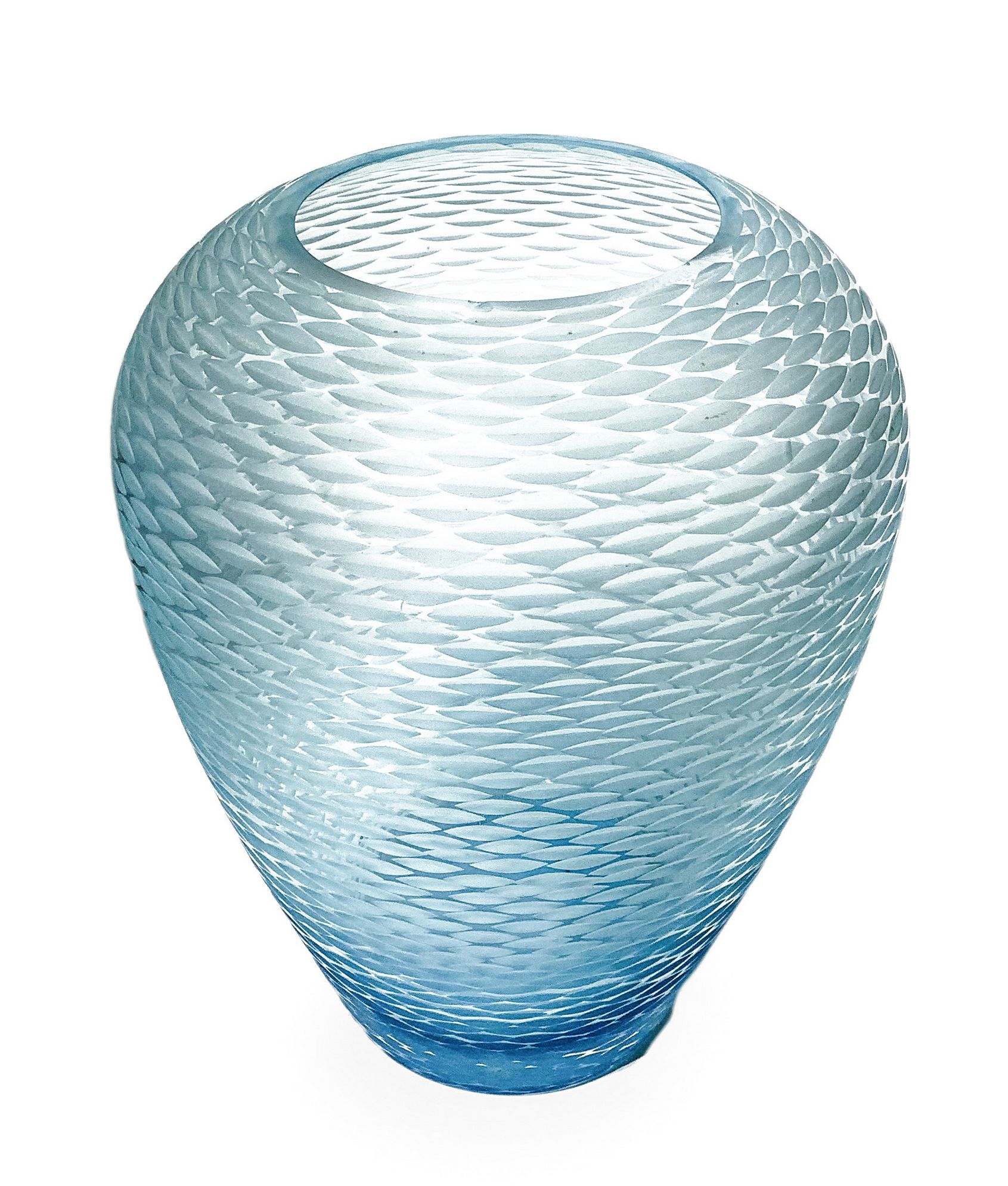 Vaso Globulare Murano. Attribuibile a Venini. Vaso di forma globulare nei toni dell’azzurro, superfice con lavorazione battuta alla mola. Anni '50. H cm 25. Minima sbeccatura alla sommità.