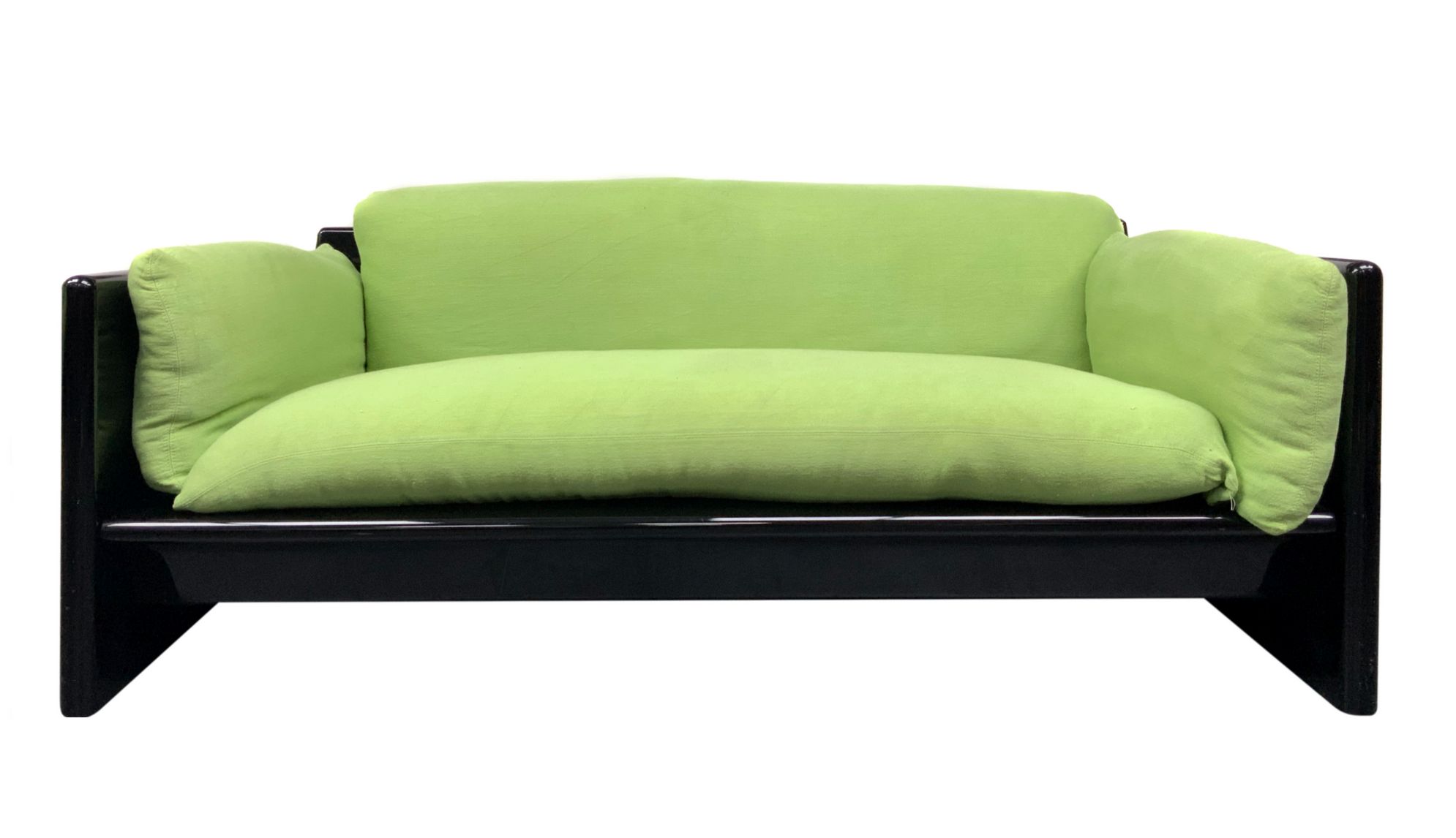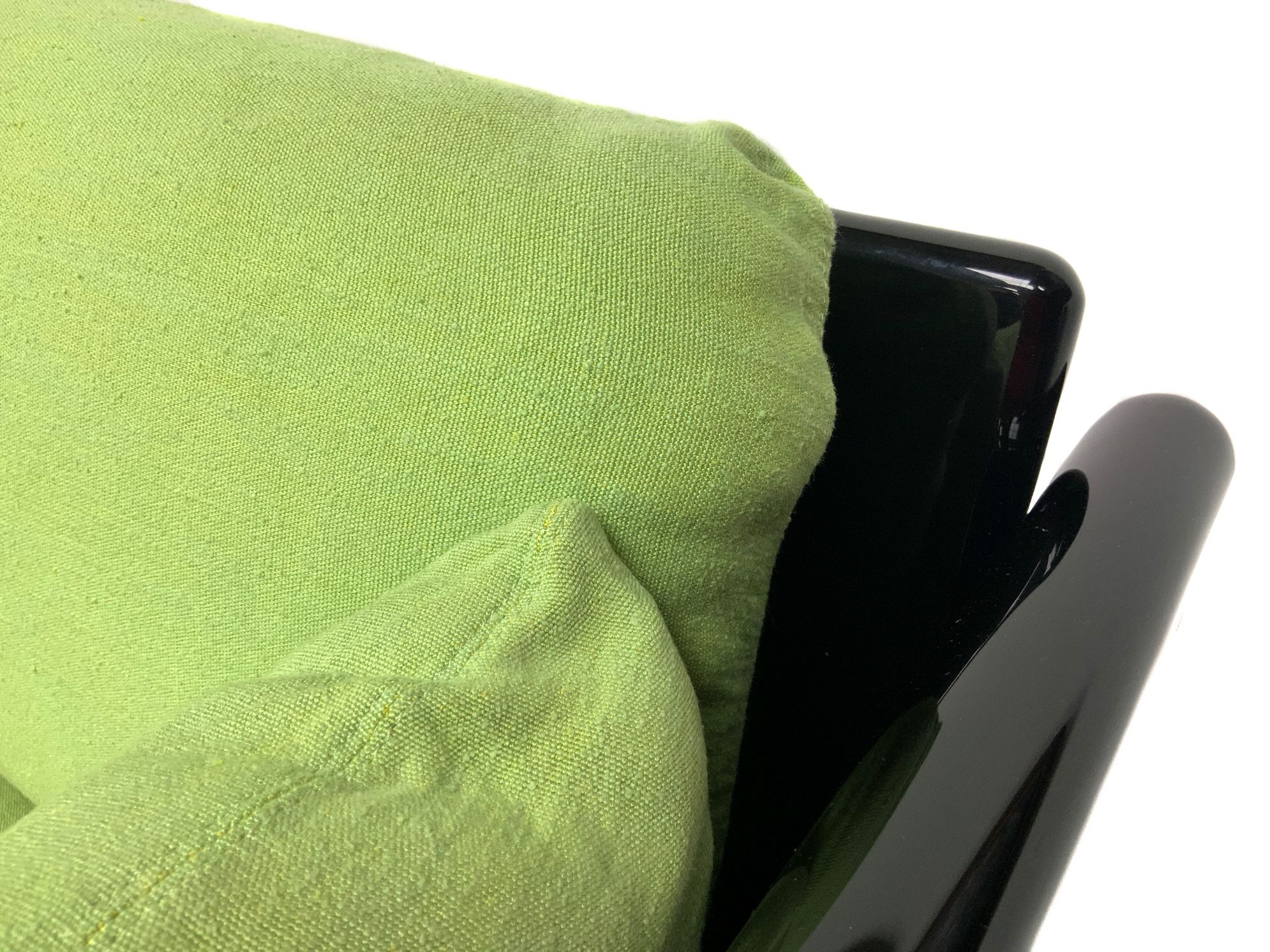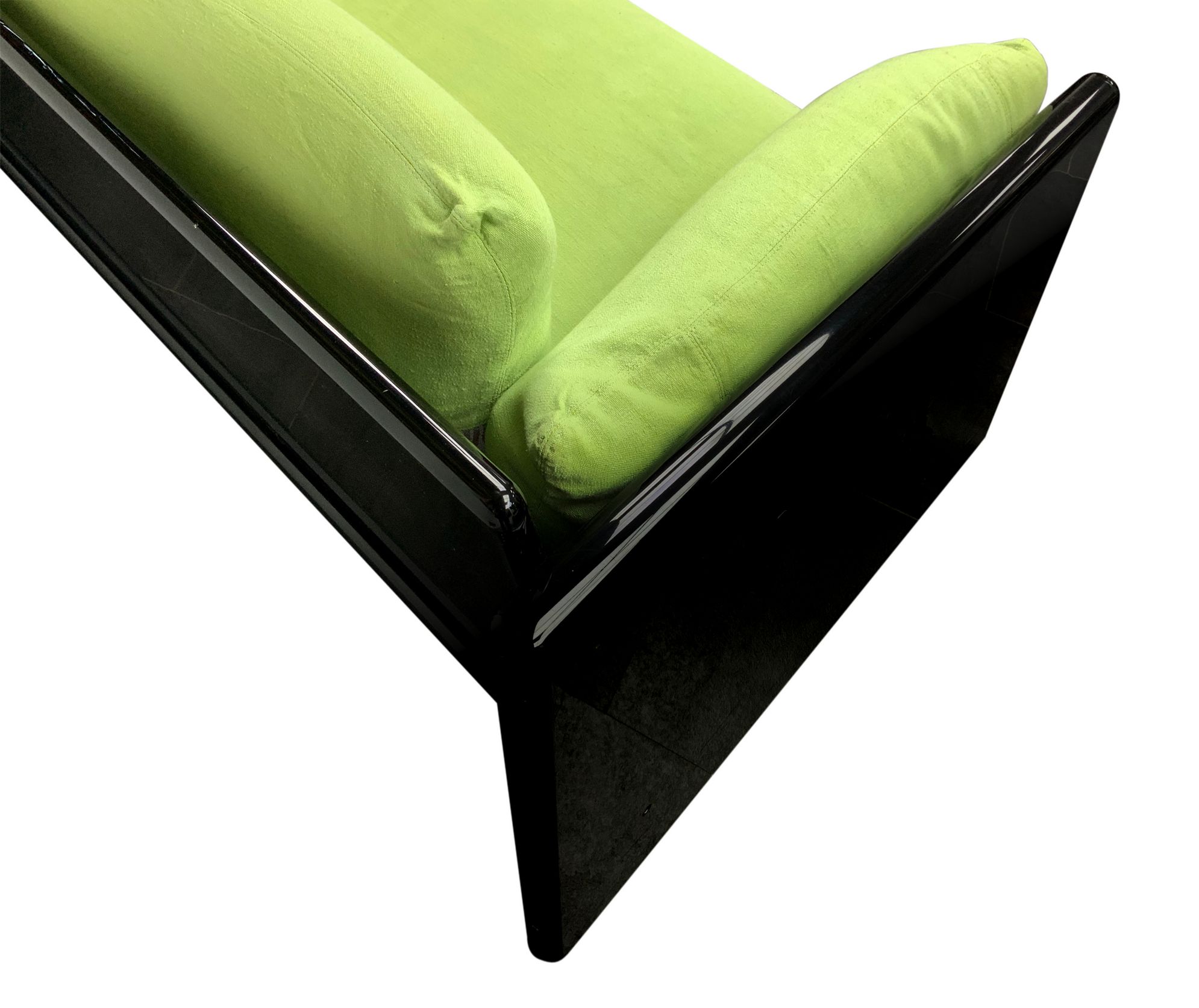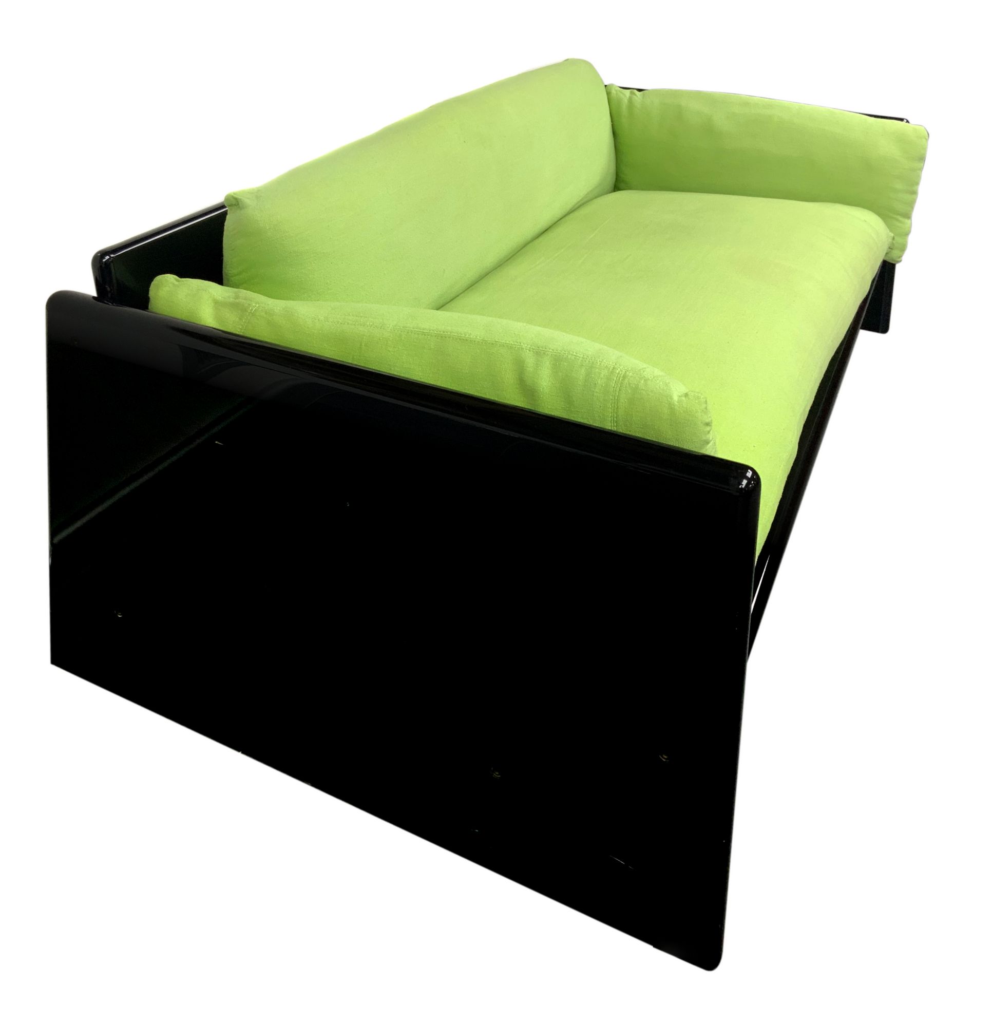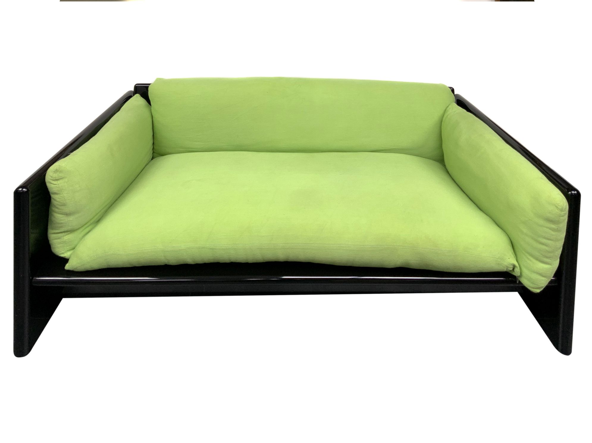 Simon, disegno Kazuide Takahama, divano in legno laccato nero imbottiture in tessuto originale del periodo. Anni 80. H Cm 52. Cm 150x80.