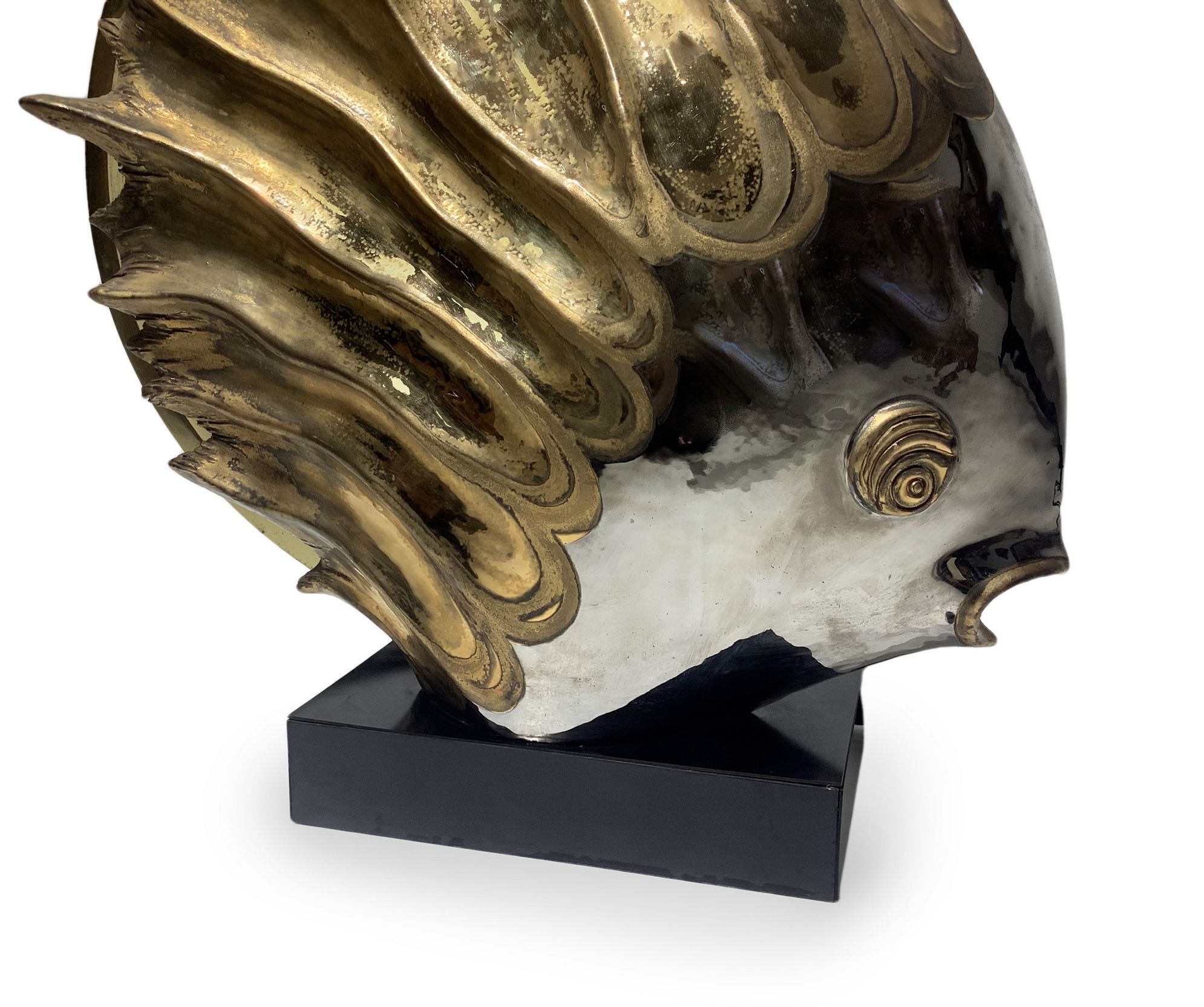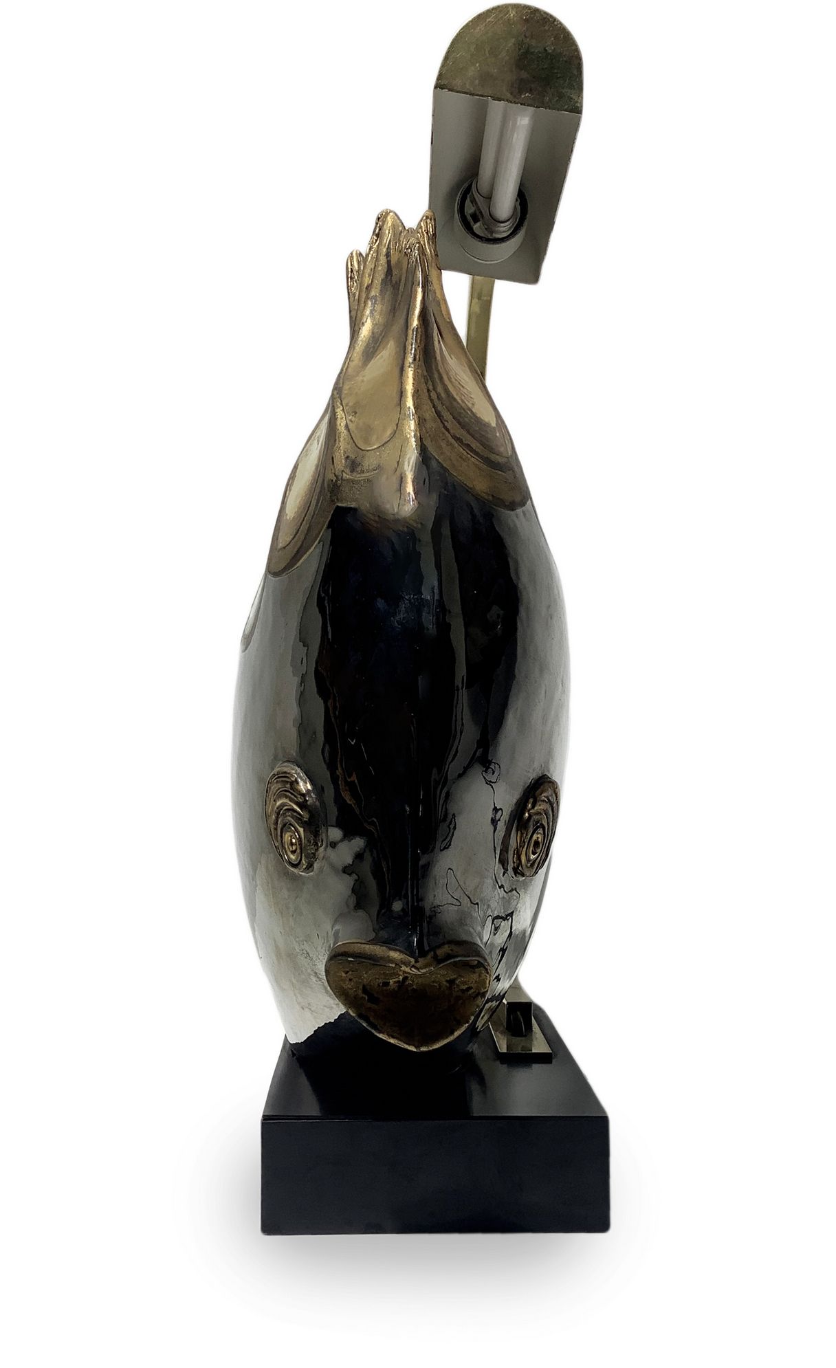 Lampada da tavolo,composta da scultura di pesce in colore oro. Anni ‘70 H 53.