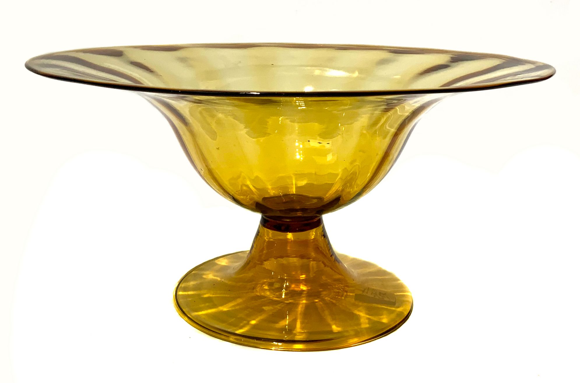 Alzata in vetro di Murano, attrib. MVM Cappelin. Colore pagliesco e superficie lievemente costolata. Anni '20. H cm 14, diametro cm 28.