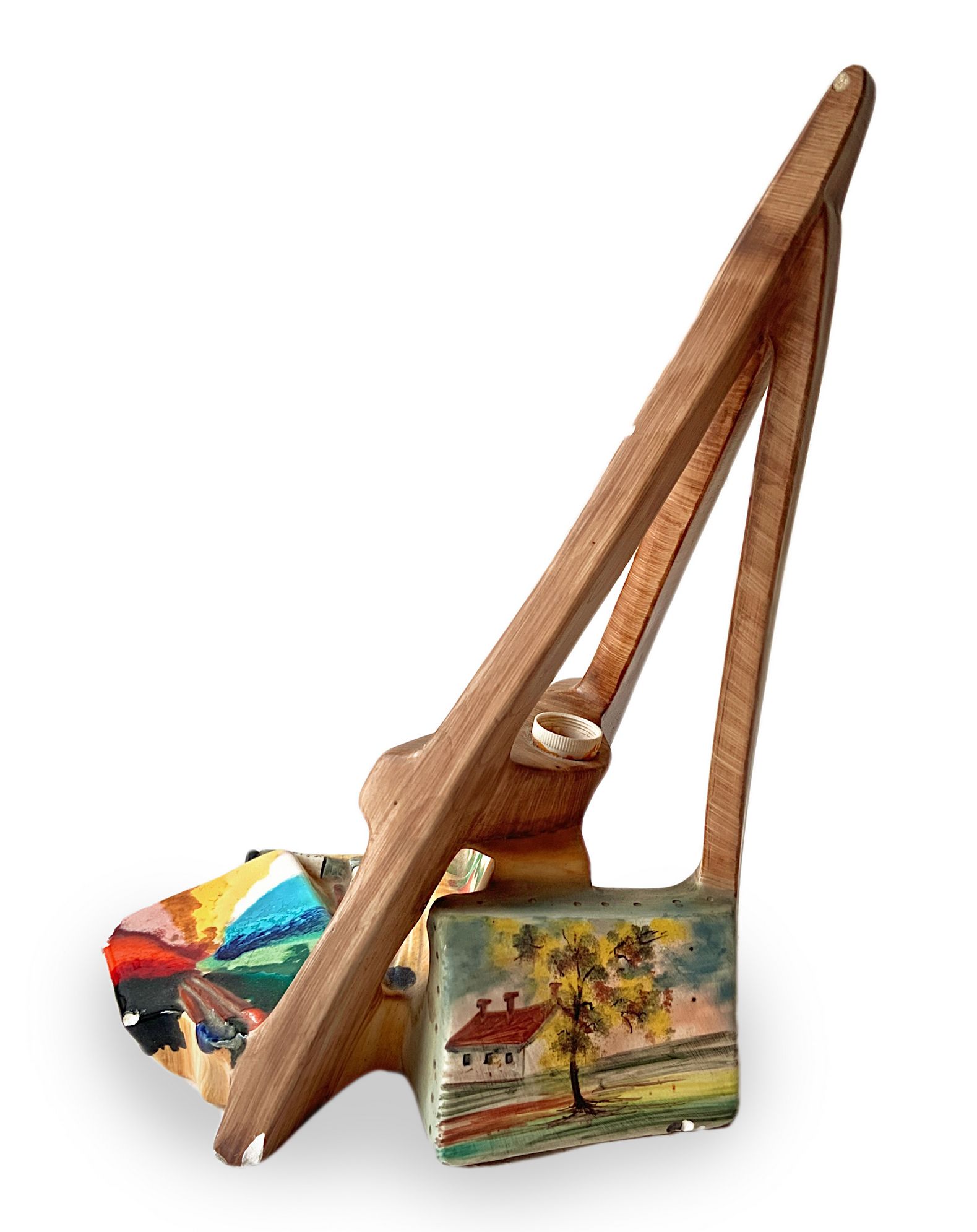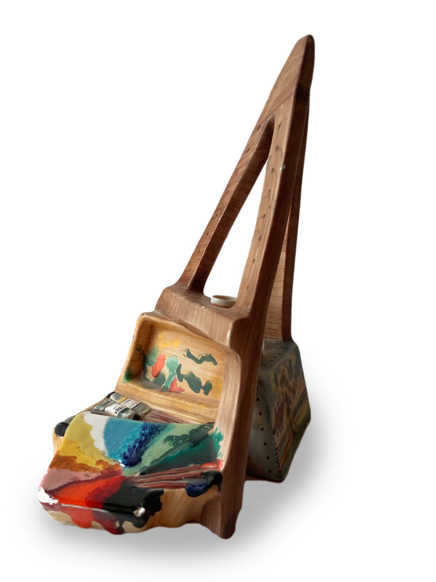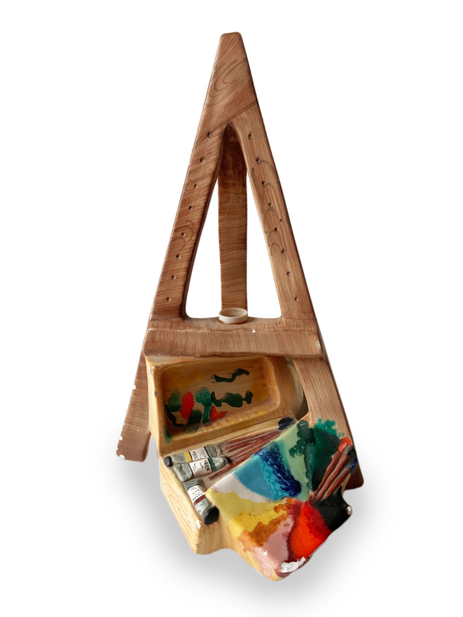 C.I.A. Manna. Lampada da tavolo in pasta bianca decorata in policromia raffigurante cavalletto per tela. Sbeccature lungo la base. Anni 50 37x20x20