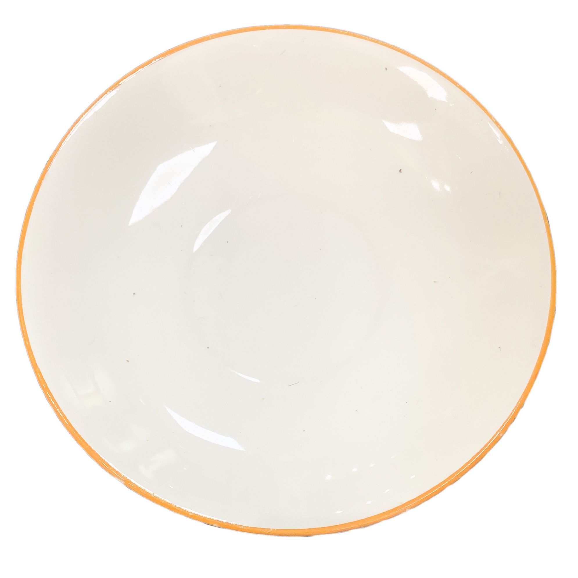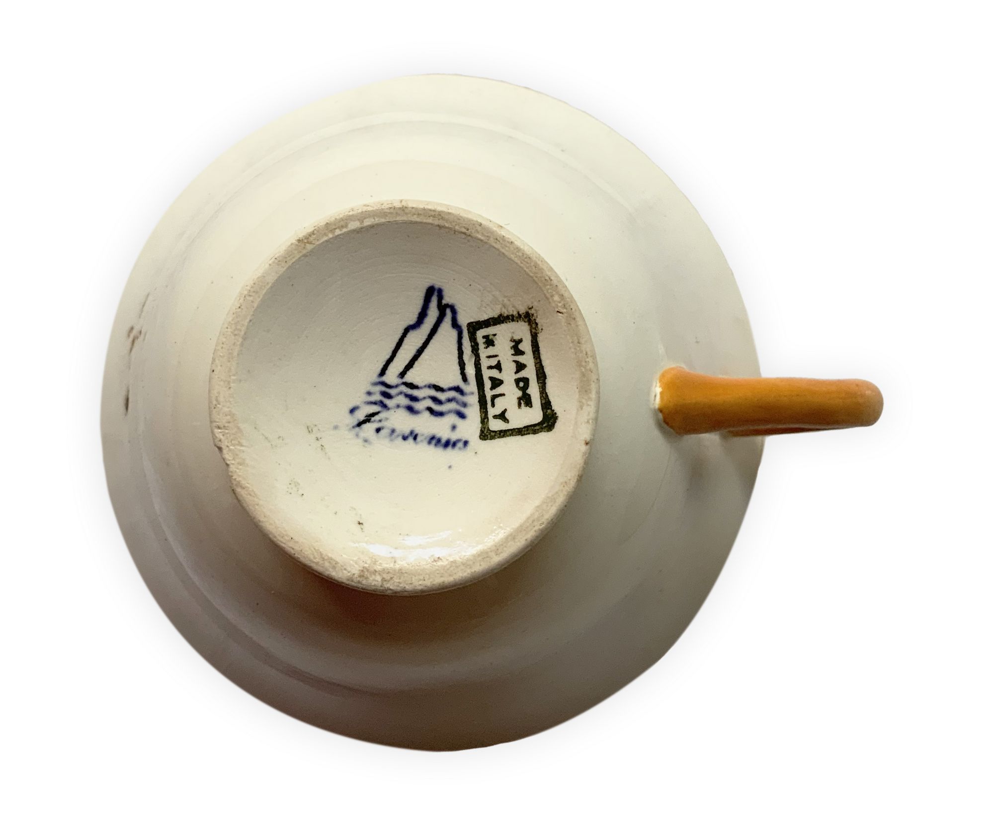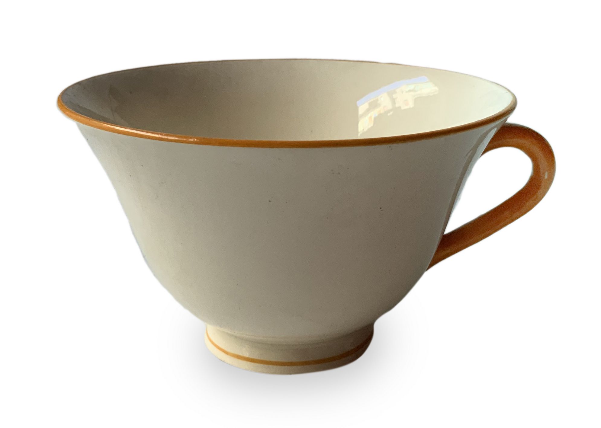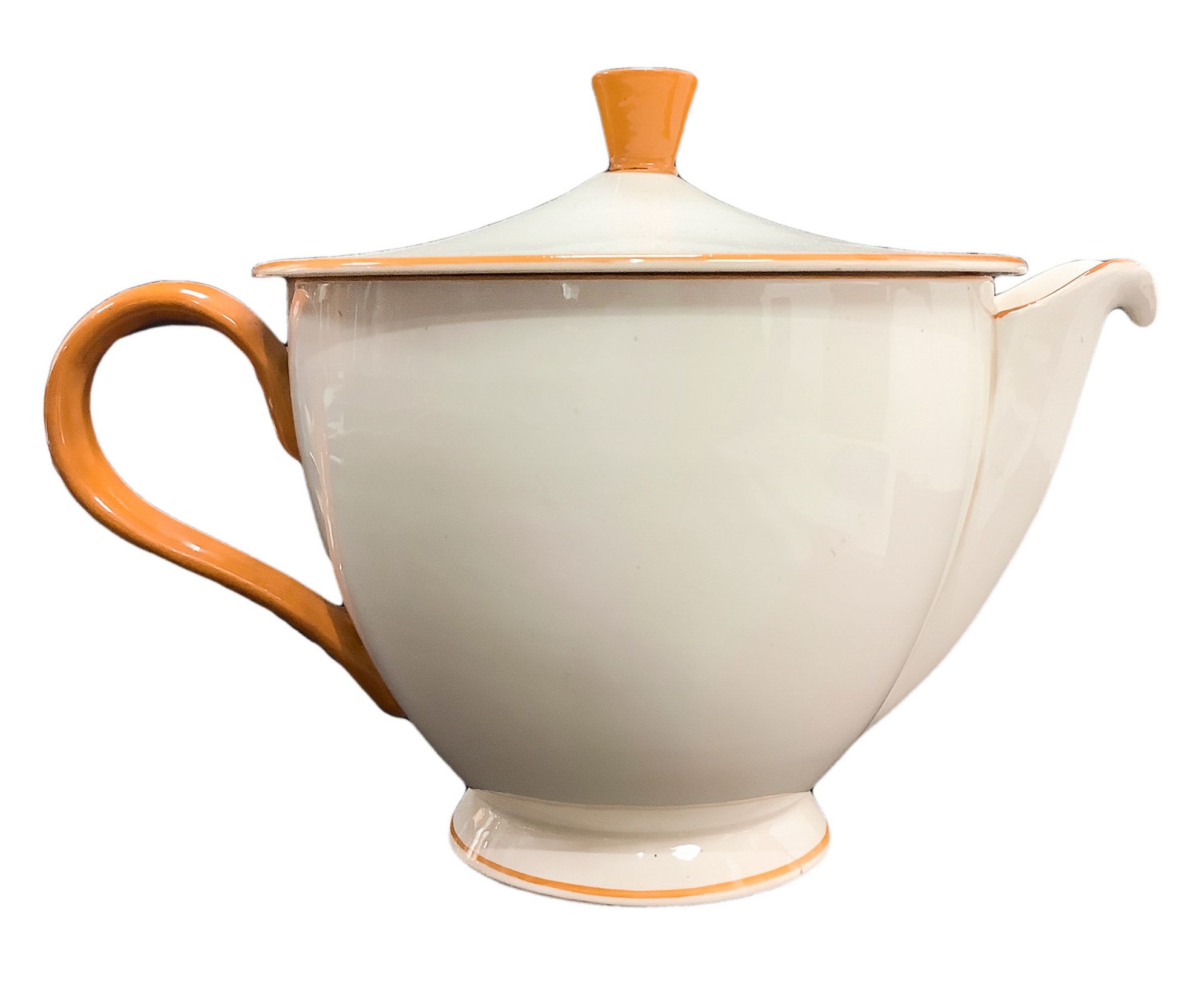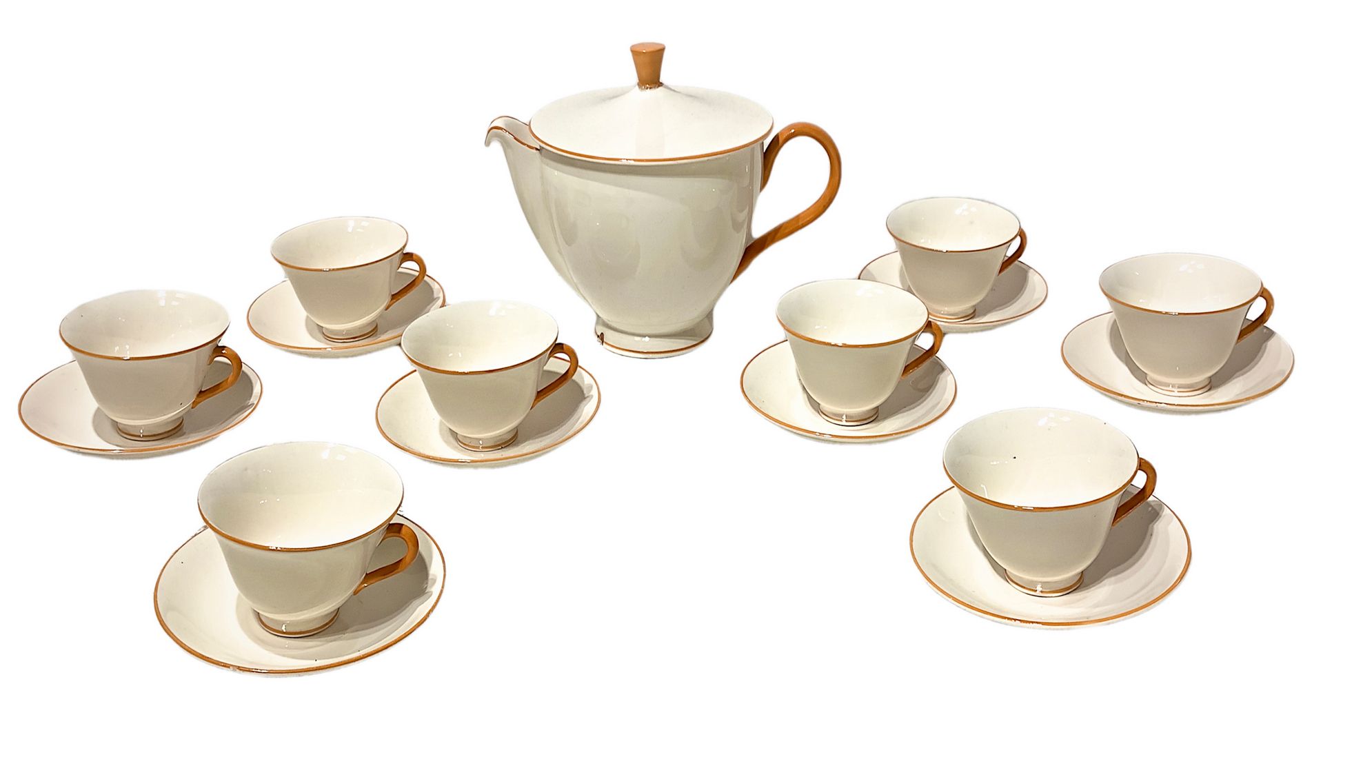 Lavenia, disegno Guido Andlovitz. Servizio da te in terraglia maiolicata composto da 8 tazzine e teiera, nei toni del crema con dettagli in arancione. Anni '30. Minime mancanze ed una incollatura