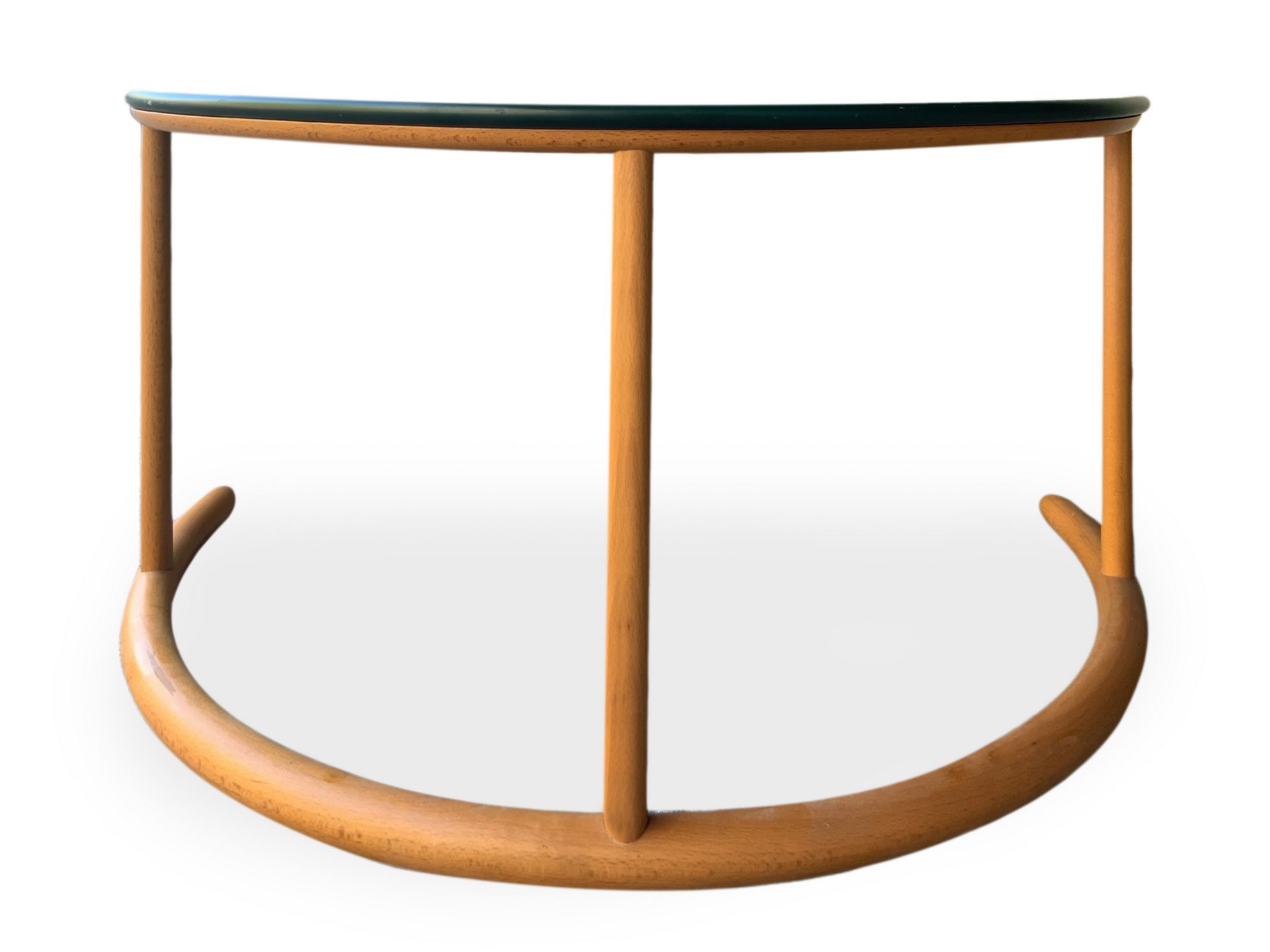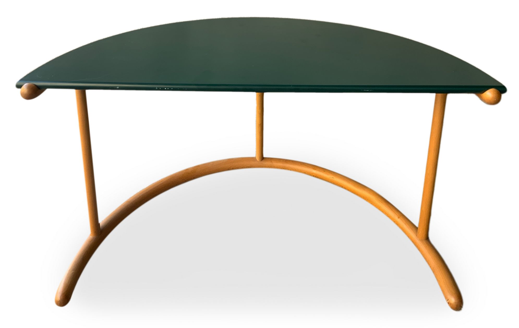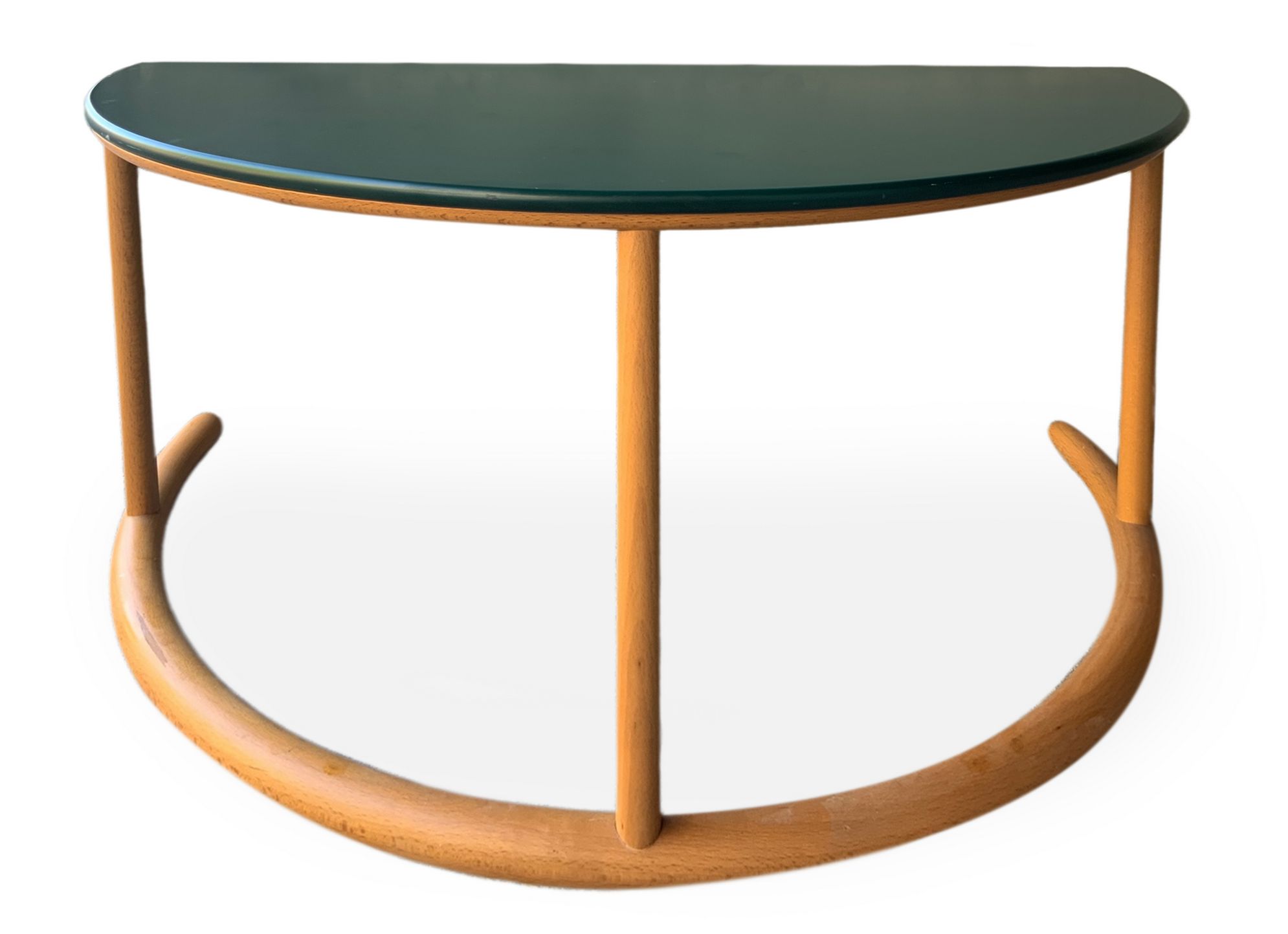 Acerbis international linea Morphos, disegno Gianfranco Frattini. Tavolino basso struttura in legno chiaro piano in legno laccato colore verde segni di uso. Anni 80 40 x 76 x 40